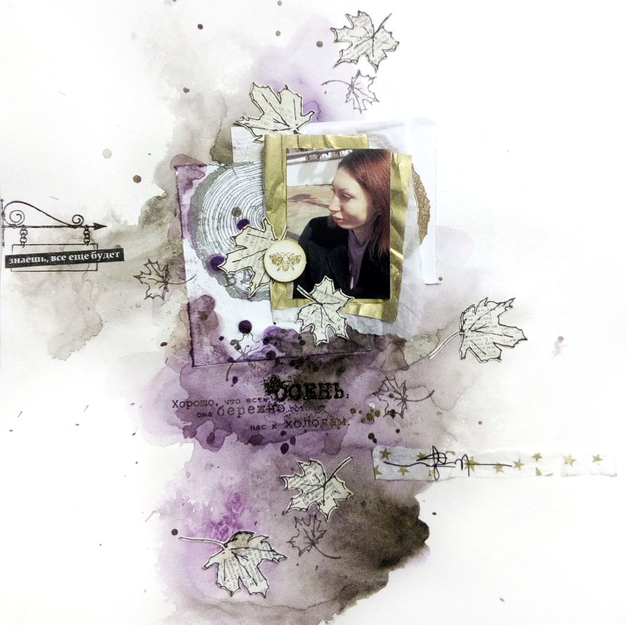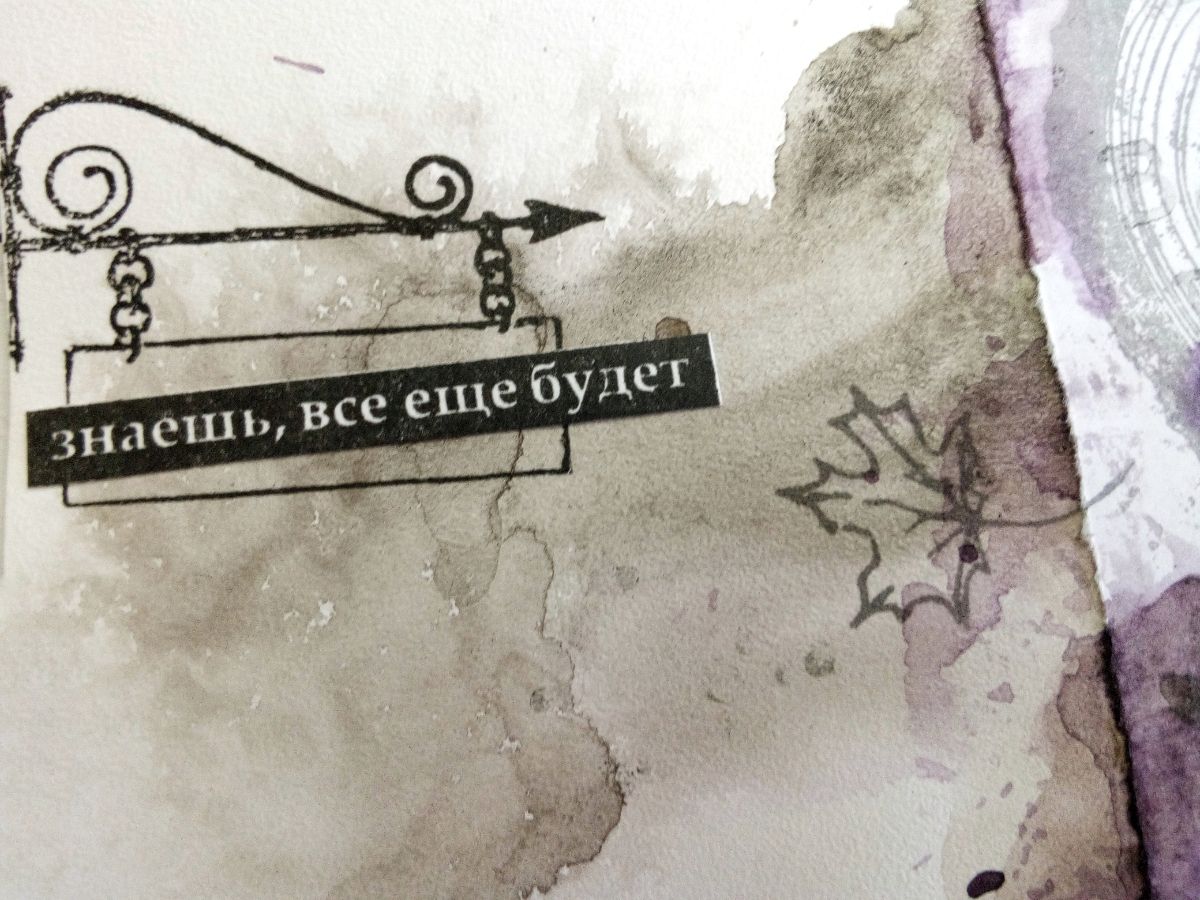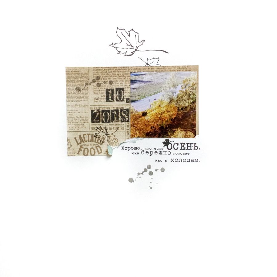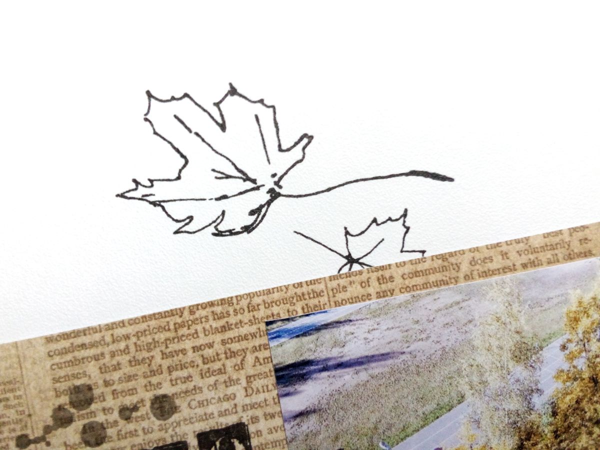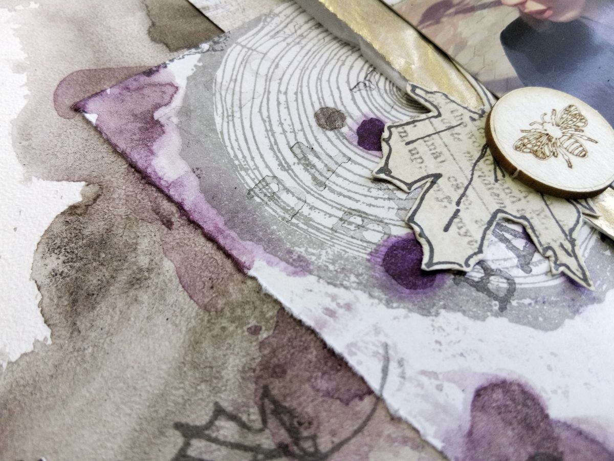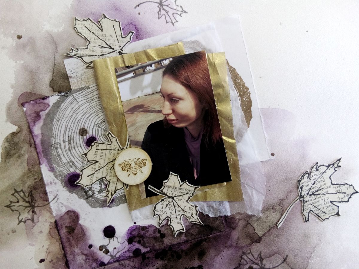 Тут мне понадобился декор из штампов. Но активный акварельный фон странички диктует свои условия: яркие листочки уже не добавишь - "потеряются", а "голая" отштамповка будет смотреться слишком пустой. Поэтому осенние листья я решила отштамповать на скрапбумаге с принтом "книжные страницы". Буквы отлично заполнили пространство штампа, а строки задали направление. Кстати, если у вас четко выверенная композиция и строгие линии, то при штампинге обращайте внимание на то, в каком направлении идут строки внутри штампа. В моём же случае лёгкий хаос лишь украшает работу, ведь осень - дама капризная;)