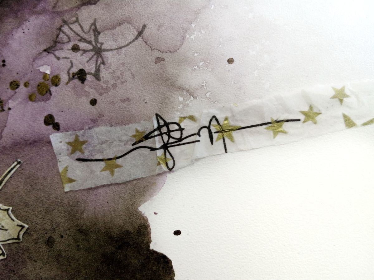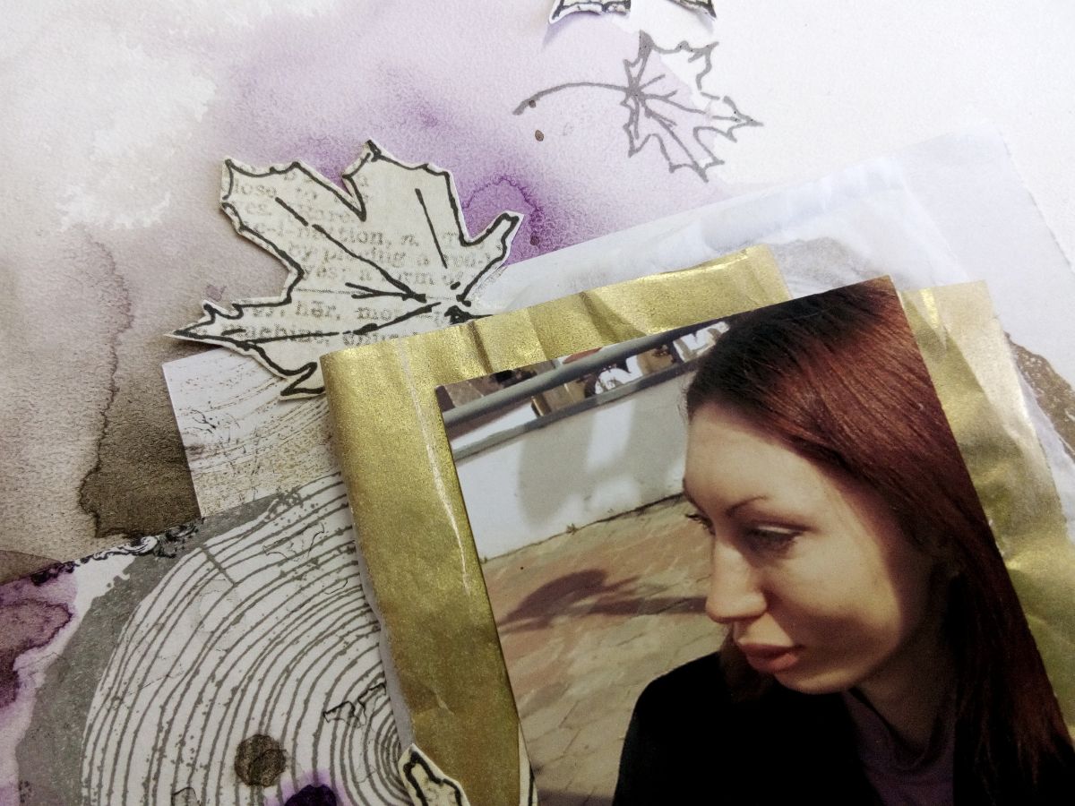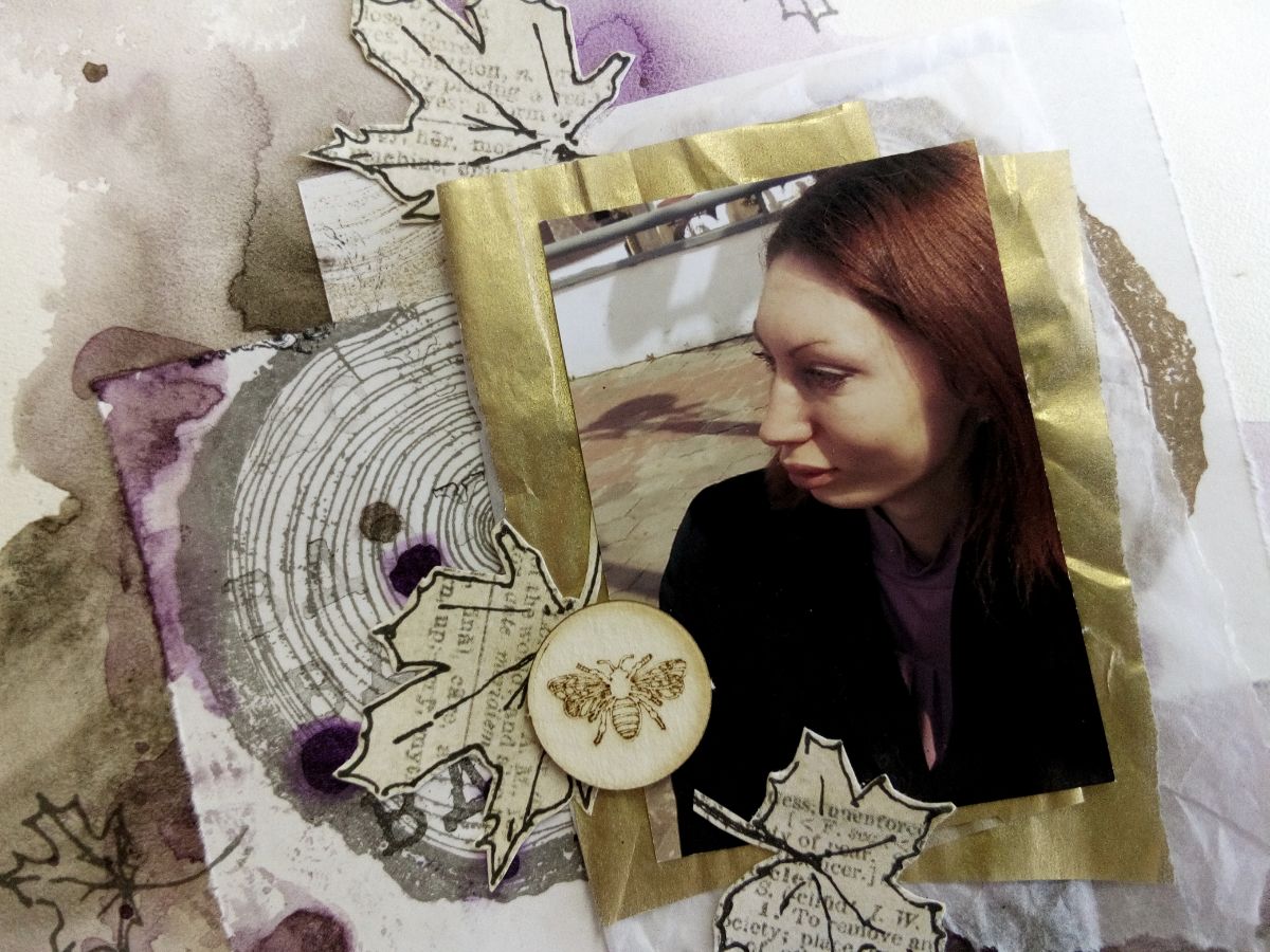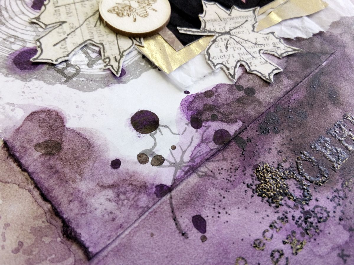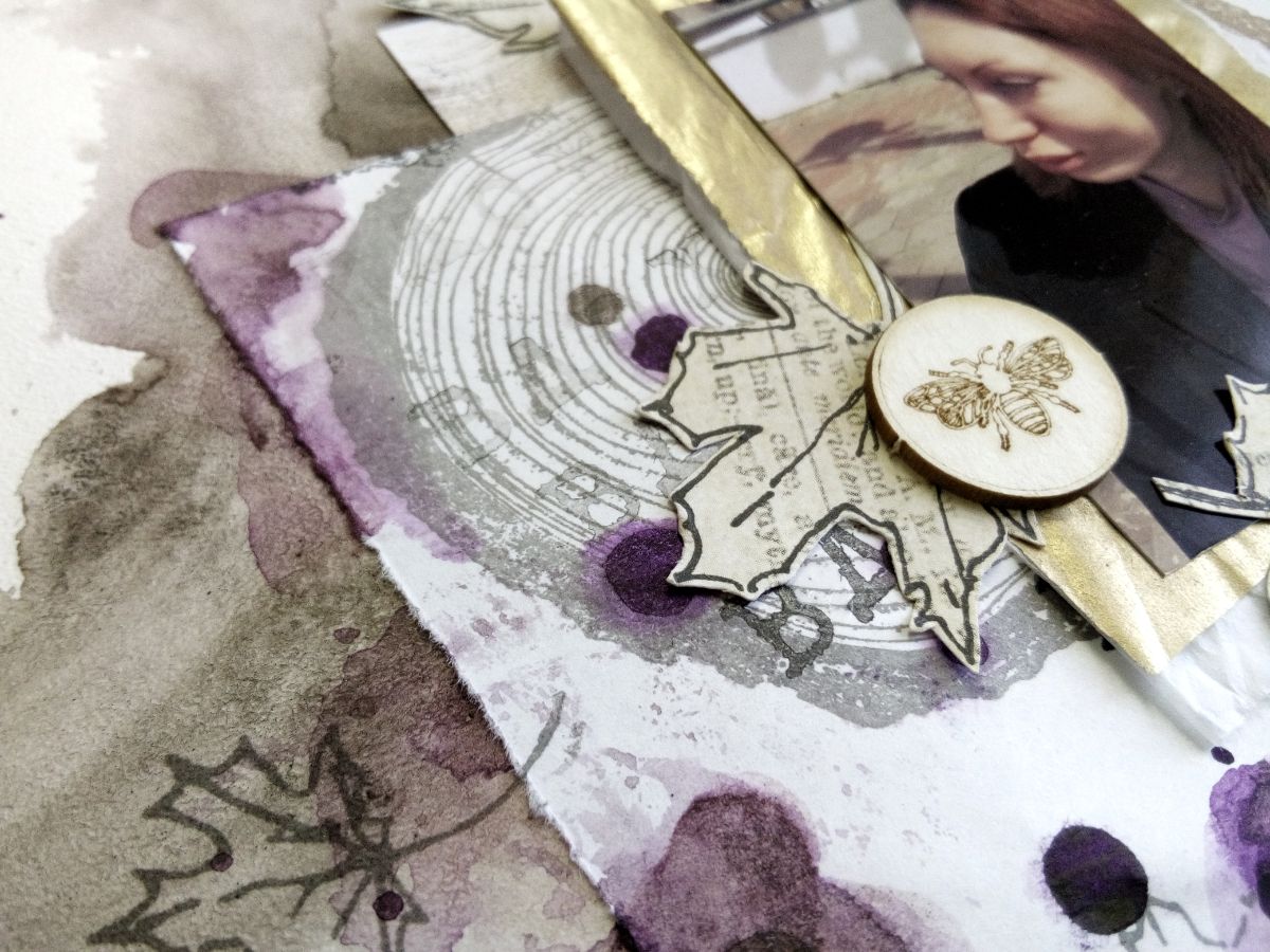 Тут мне понадобился декор из штампов. Но активный акварельный фон странички диктует свои условия: яркие листочки уже не добавишь - "потеряются", а "голая" отштамповка будет смотреться слишком пустой. Поэтому осенние листья я решила отштамповать на скрапбумаге с принтом "книжные страницы". Буквы отлично заполнили пространство штампа, а строки задали направление. Кстати, если у вас четко выверенная композиция и строгие линии, то при штампинге обращайте внимание на то, в каком направлении идут строки внутри штампа. В моём же случае лёгкий хаос лишь украшает работу, ведь осень - дама капризная;)