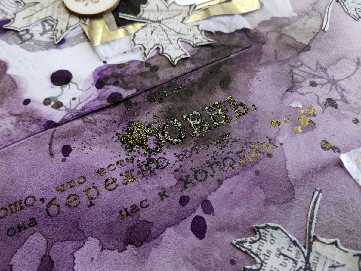 Надпись я решила немного состарить, отштамповав её сначала чернилами Versa Fine "onyx black", затем слегка присыпала золотой пудрой для эмбоссинга, запекла, а вторым слоем сразу нанесла черную пудру для эмбоссинга и тоже запекла.