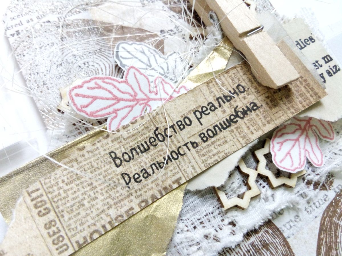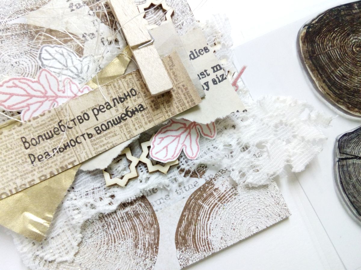 А ещё осень - это немного волшебство, магия первого снега, уют и ожидание сказки. И в дополнение к страничкам я сделала тег. Он почти зимний: оттиски "спилы бревен" припорошила снегом - белой пудрой для эмбоссинга. А надпись добавляет волшебства.