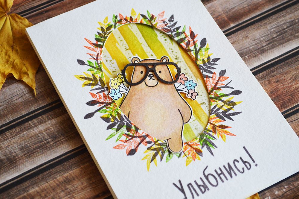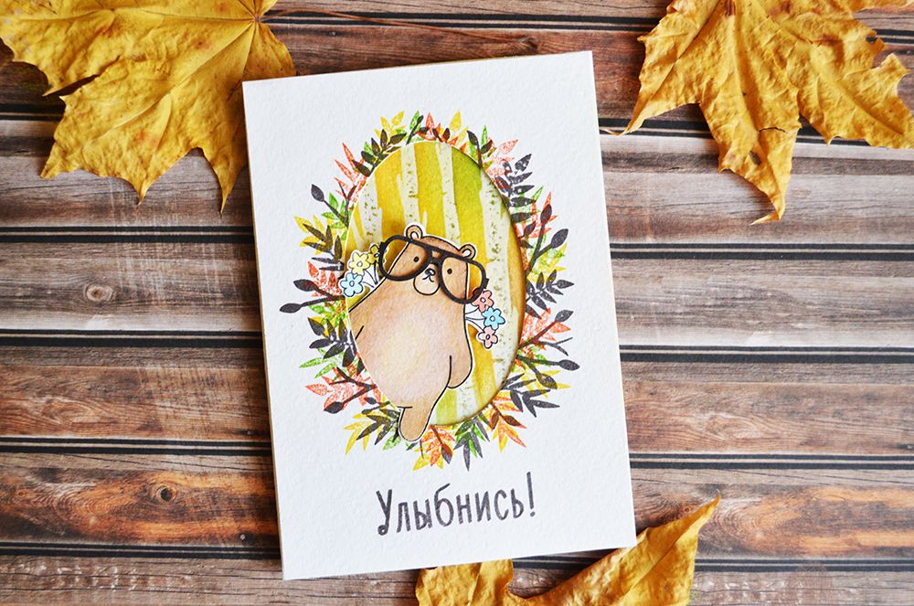 Вырезала рамочку - овал и по краю отштамповала листики и веточки. А цветочки он собирает для тебя, чтобы ты улыбнулась, о чем и гласит надпись на открытке - Улыбнись!