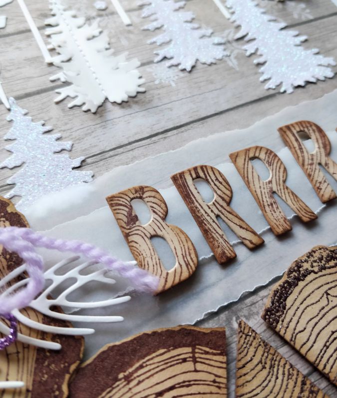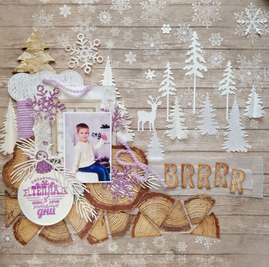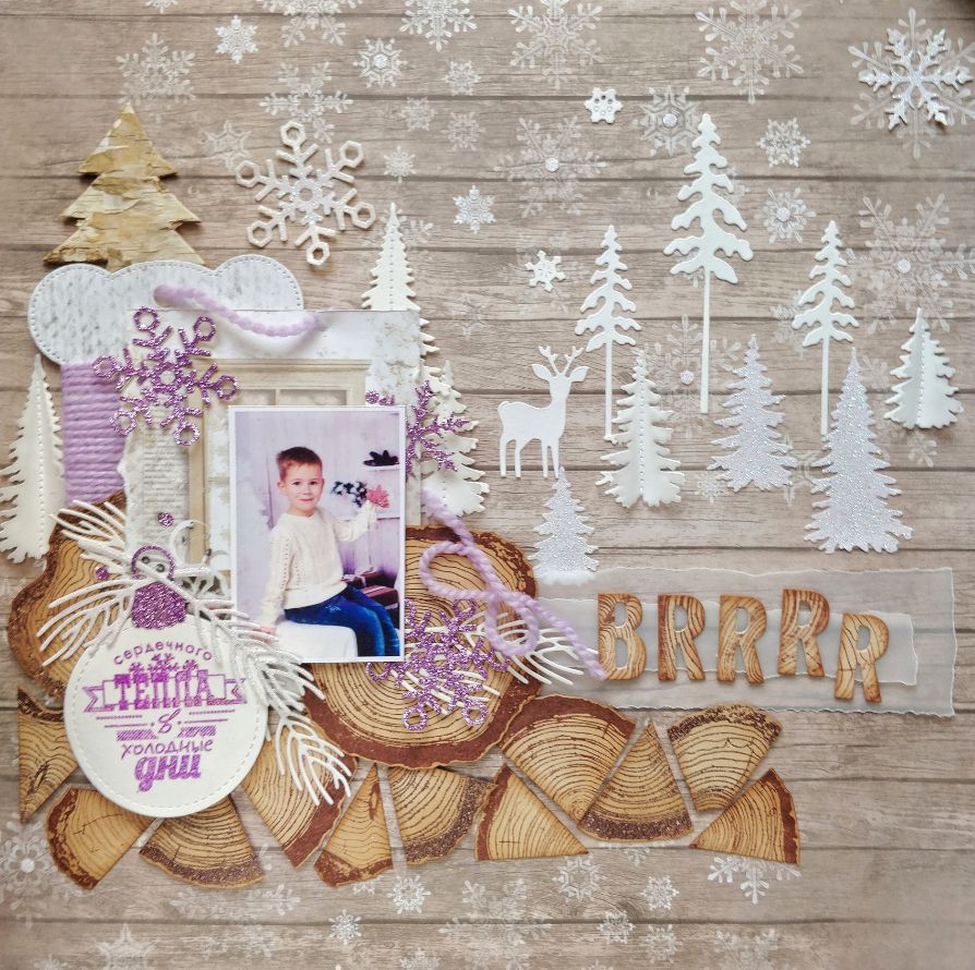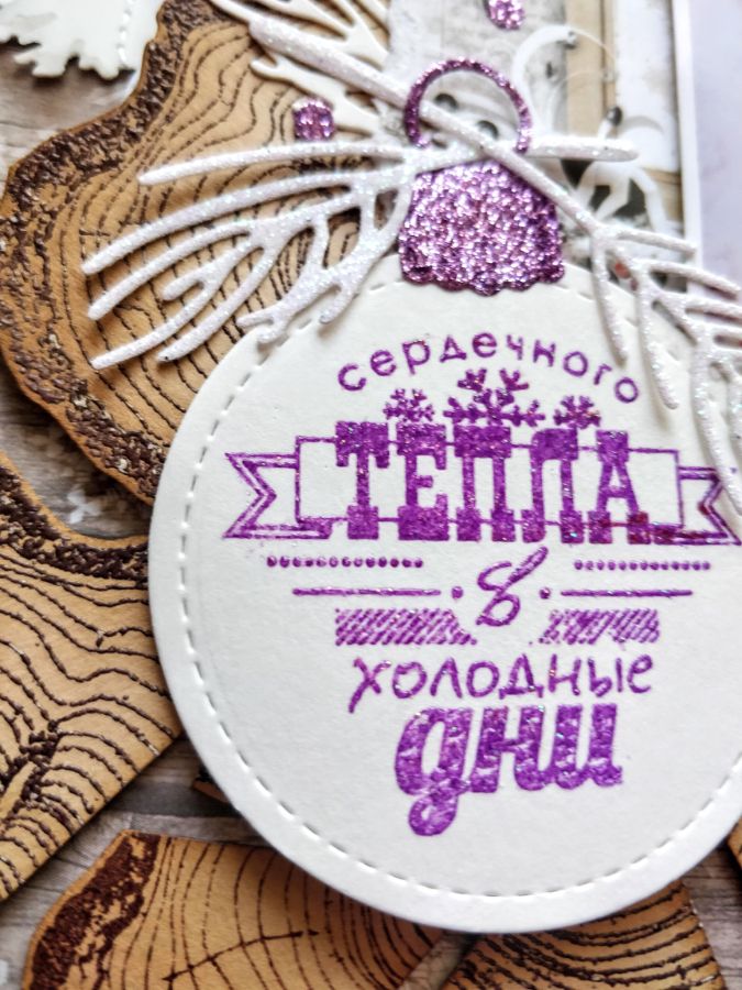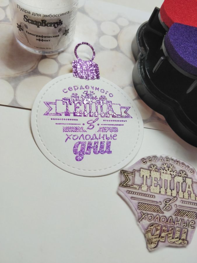 Так как страничка у меня предновогодняя, то и пудру я взяла не просто прозрачную, а с галографическим эффектом. Вырубка из глиттерной бумаги тоже искрится словно снег.