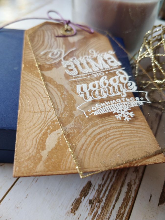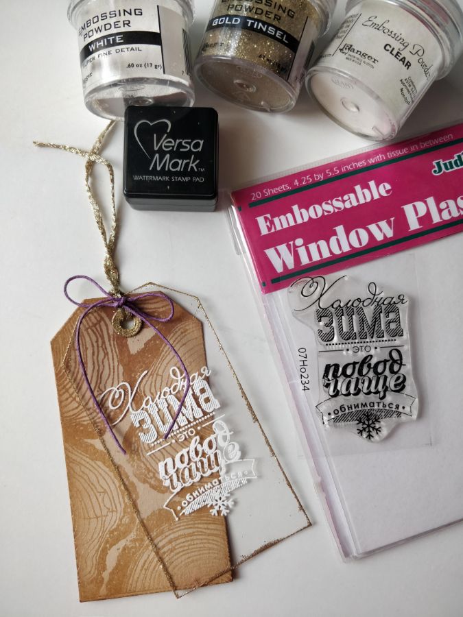 Края тега из пленки оформила таким как бы инеем пудрой для эмбоссинга золотого цвета с блестками.