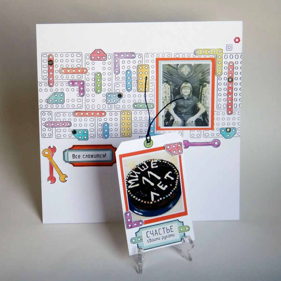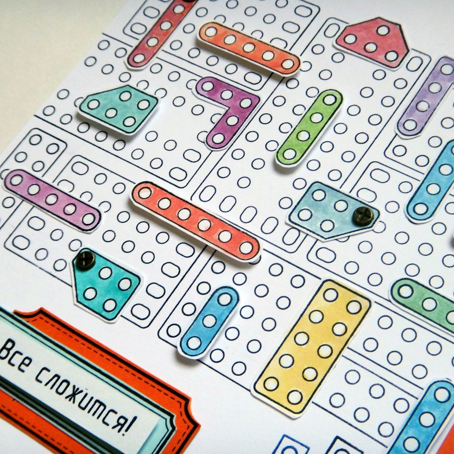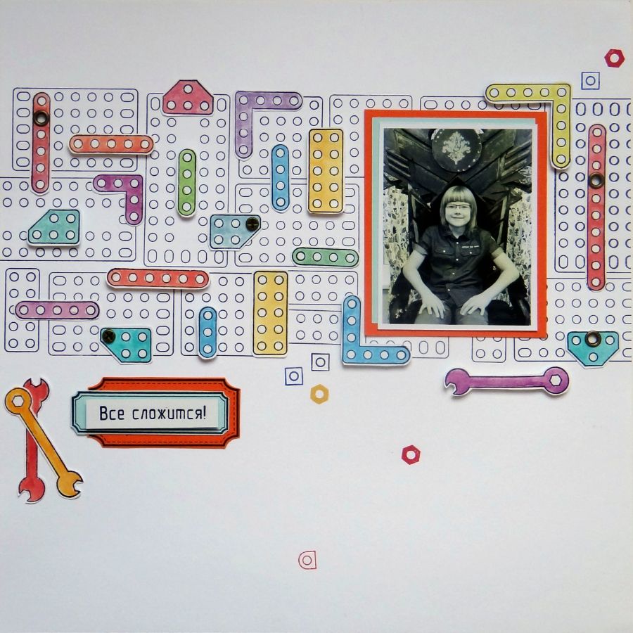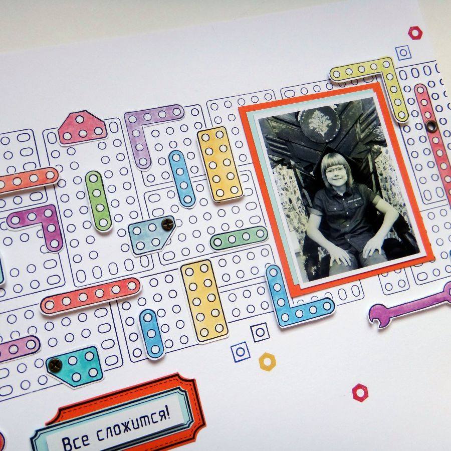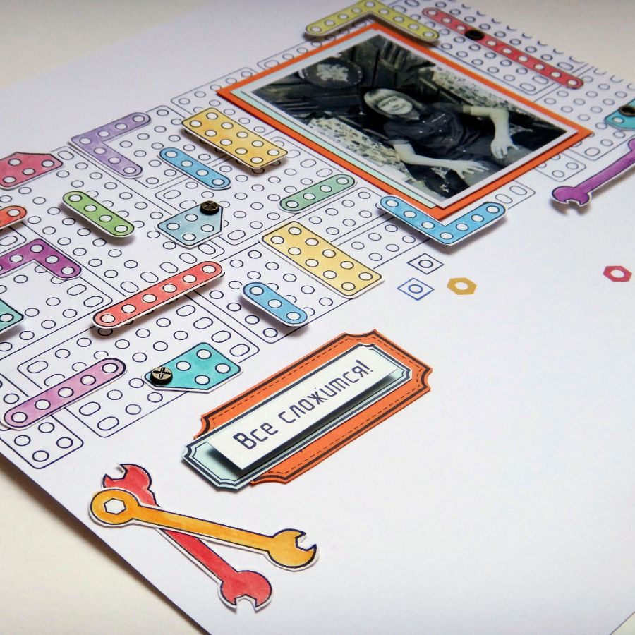 Техничности страничке добавляют разводные ключи :) Некоторые из элементов конструктора приподняты на объемный скотч. Приподнята и надпись-заголовок Все сложится!