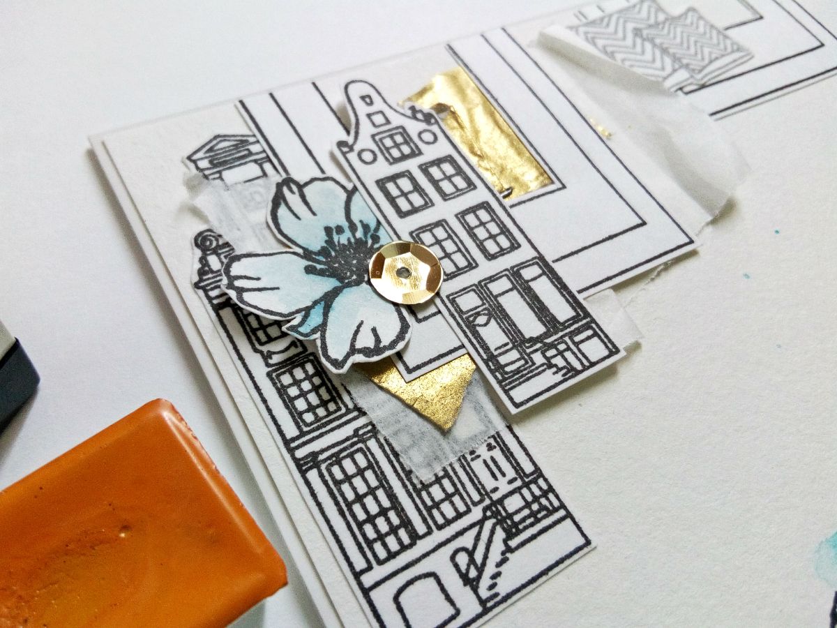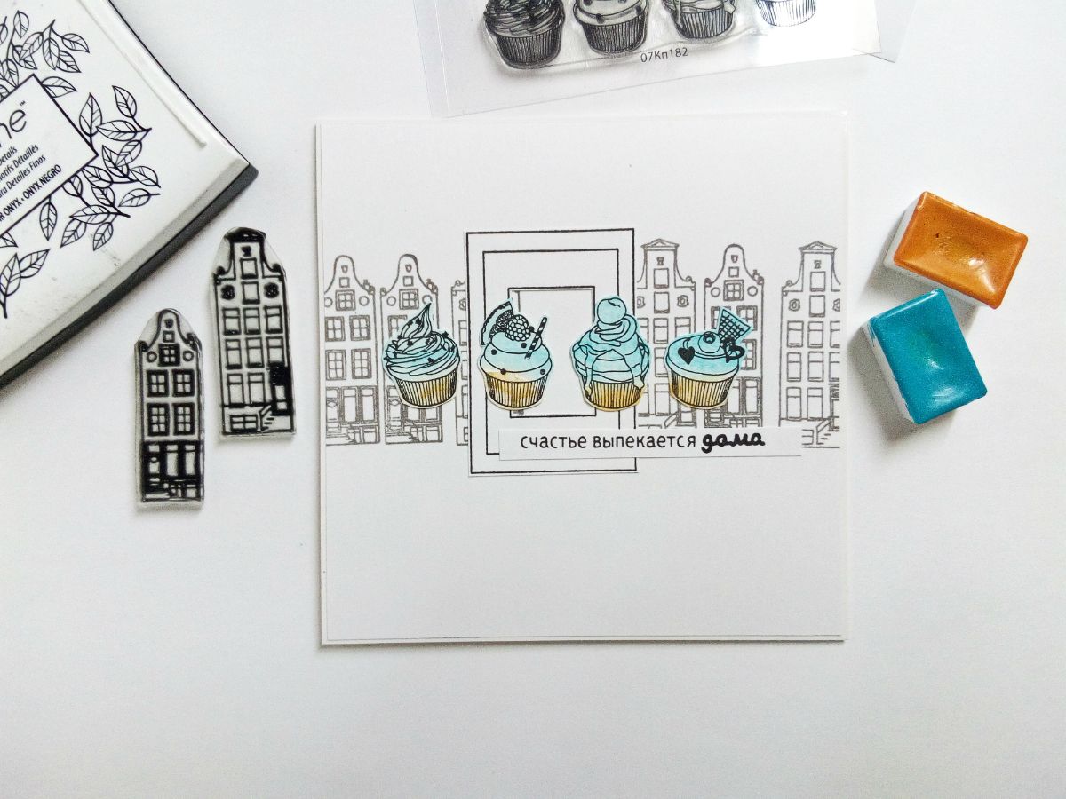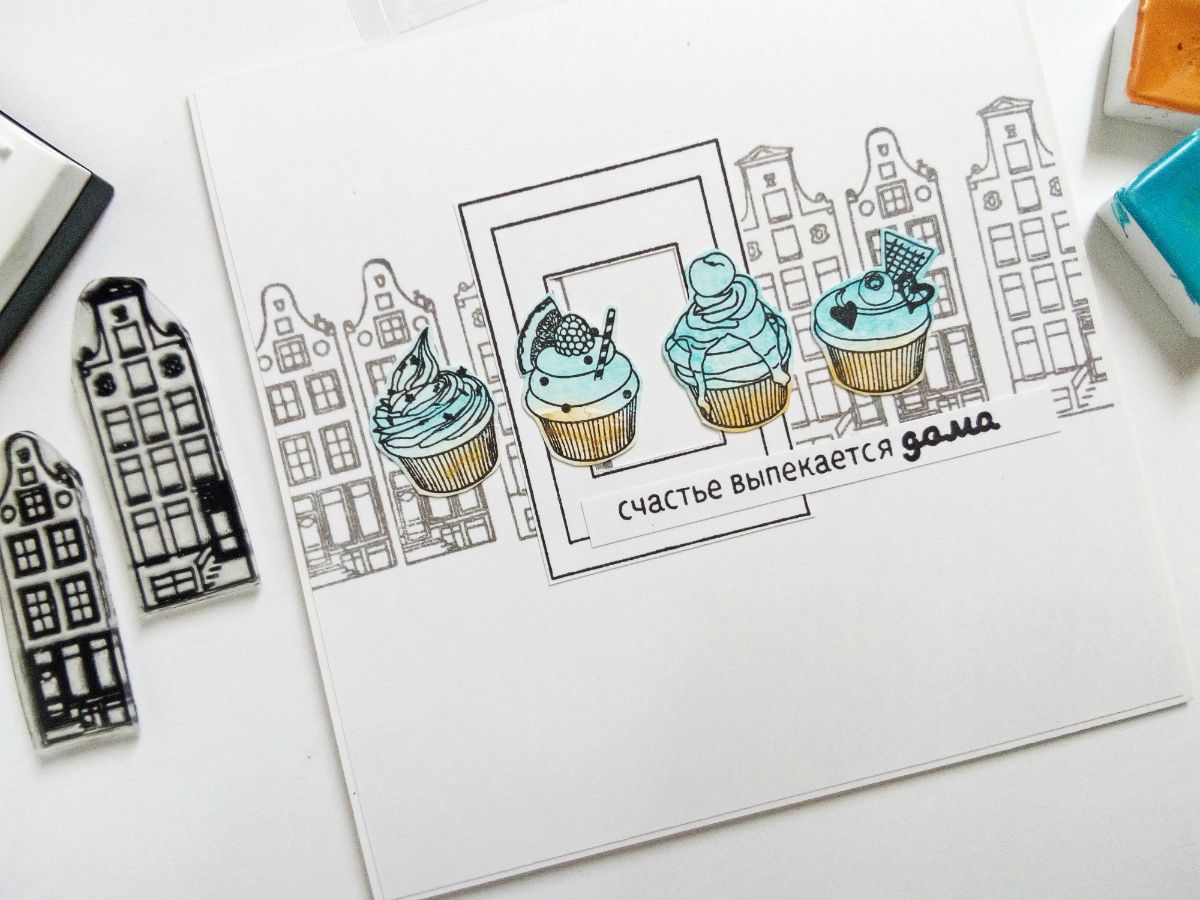 Для начала я заштамповала основу открытки штампами "голландские купеческие домики". Чернила использовала серого цвета, ведь домики выполняют тут роль фона и не должны доминировать по цвету.