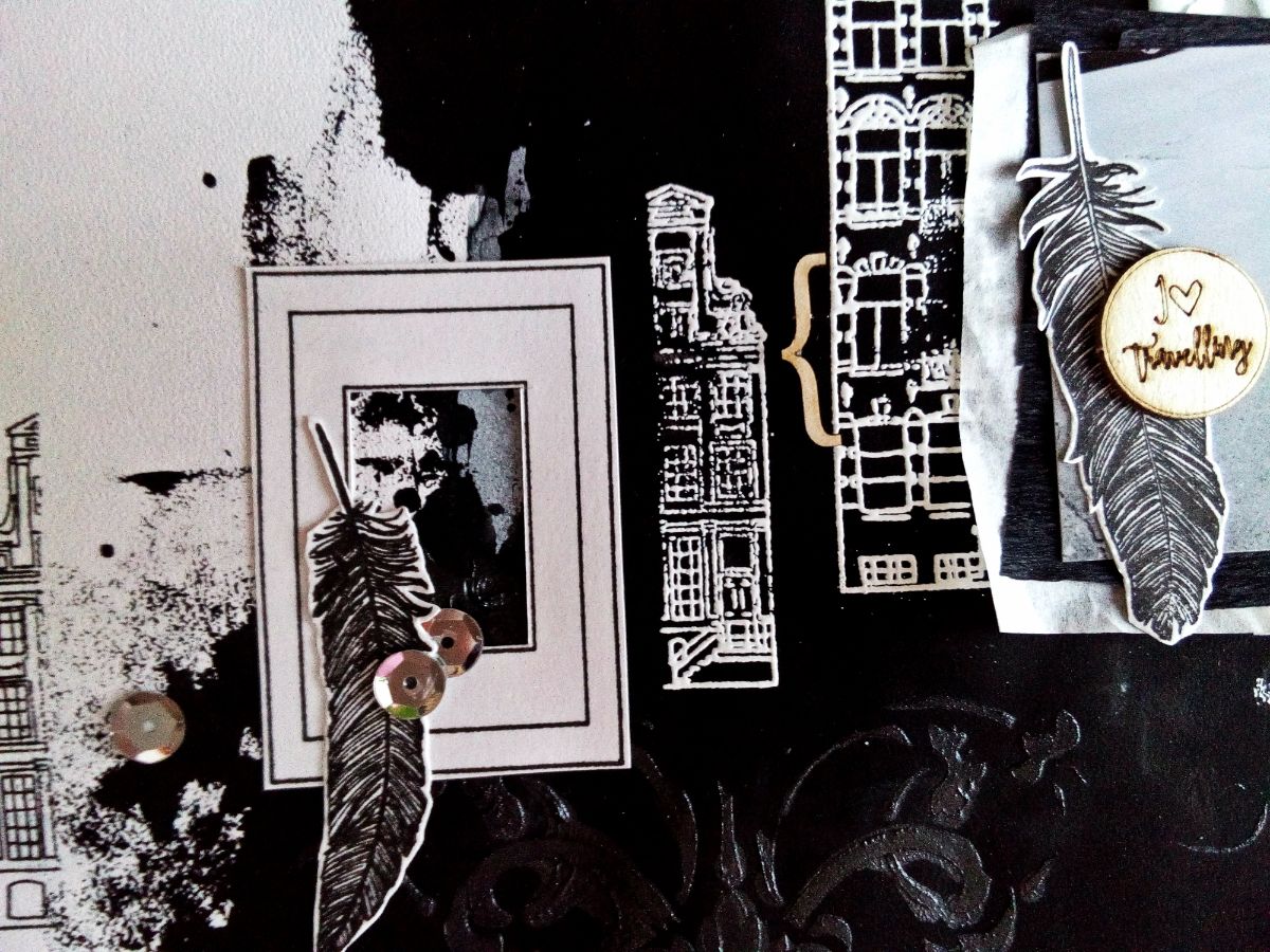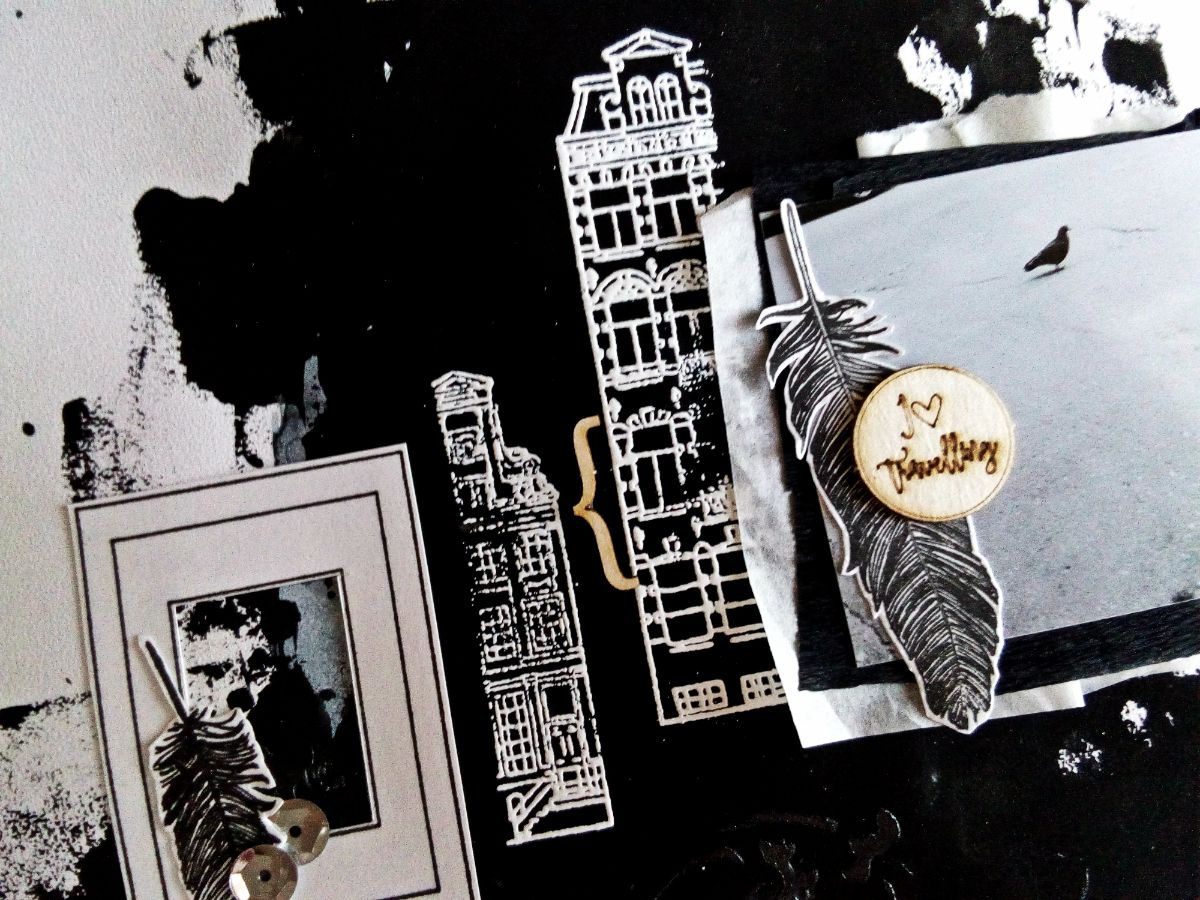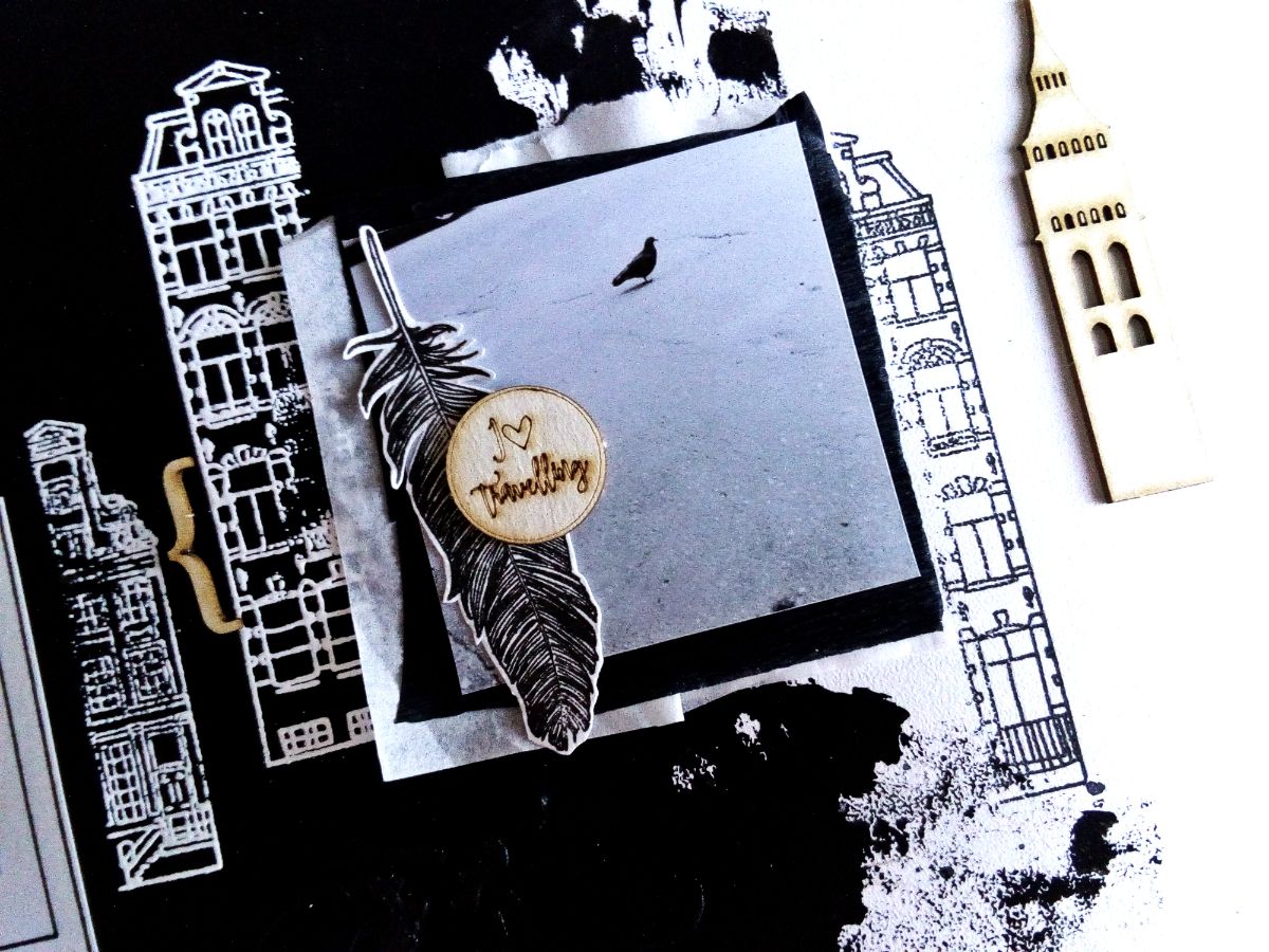 Для создания странички использовала домик из набора штампов "голландские купеческие домики", а также большой дом с аркадами. Не стала пропечатывать оттиски целиком, а разделила домики на две части. Причем те части, которые оказались на черном поле, покрыла белой пудрой для эмбоссинга и запекла. Бумага в основе странички фактурная, поэтому оттиски не пропечатались полностью, что создало некоторый гранжевый эффект, что позволяет поддерживать городскую атмосферу.