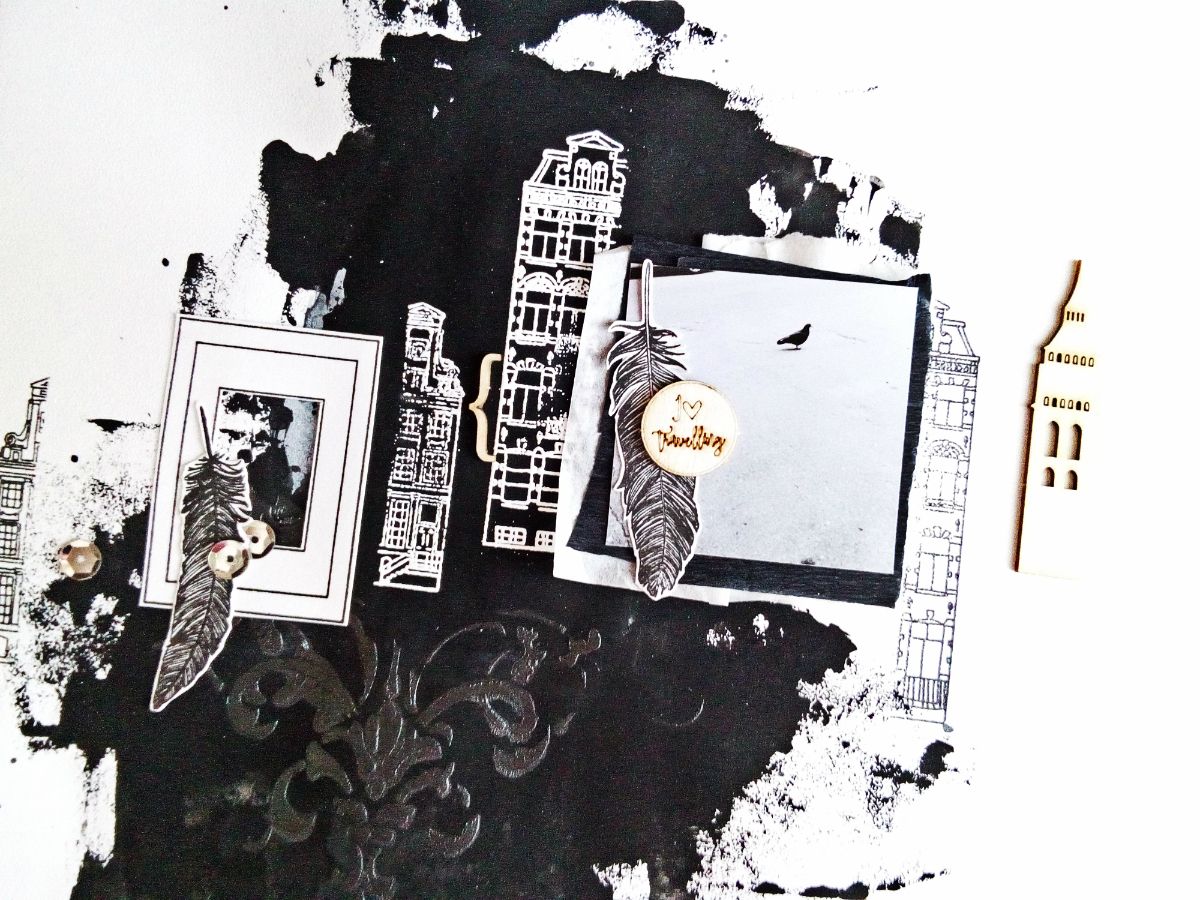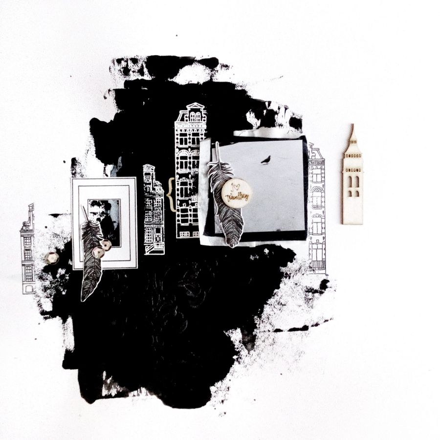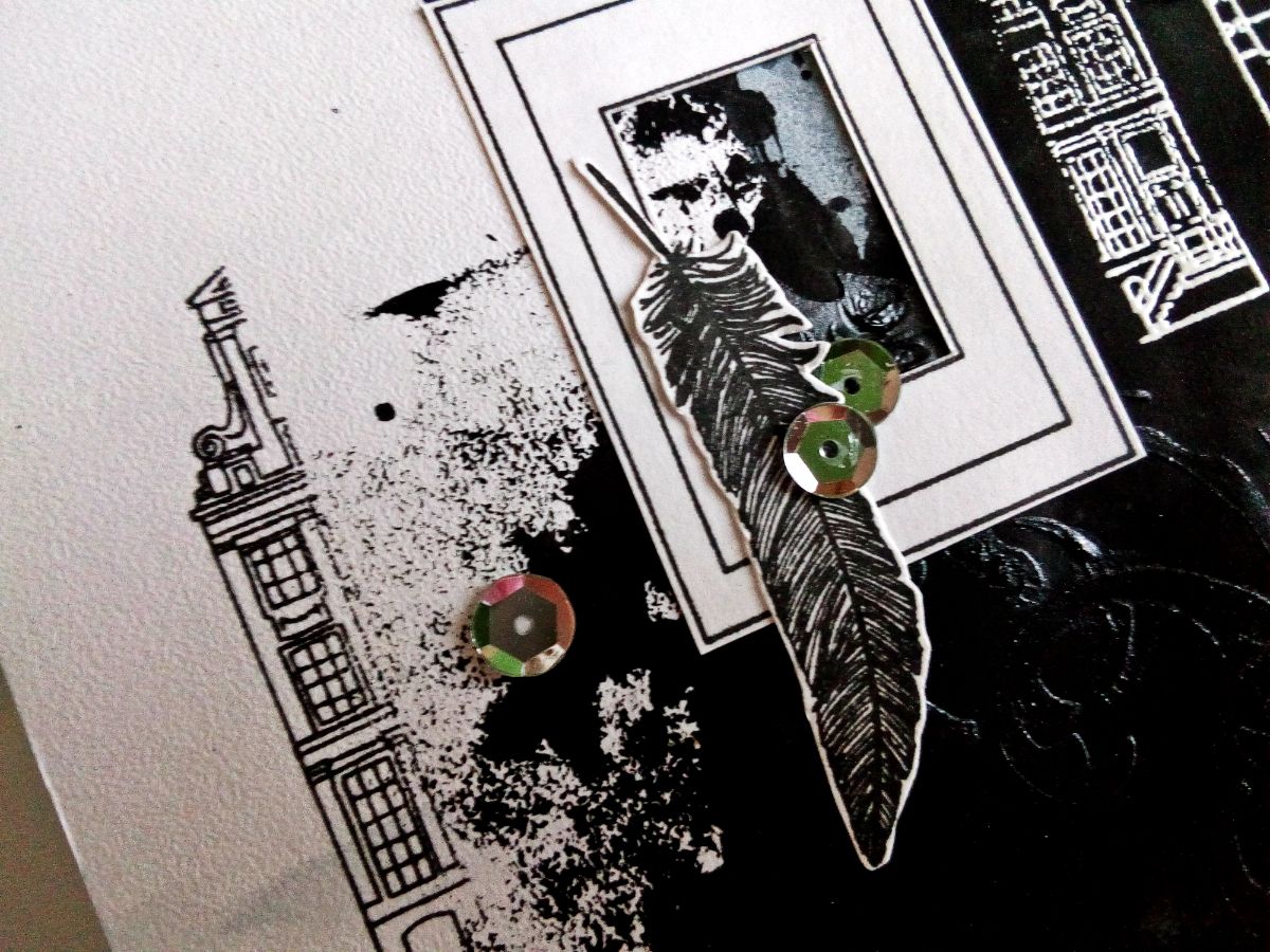 Для создания странички использовала домик из набора штампов "голландские купеческие домики", а также большой дом с аркадами. Не стала пропечатывать оттиски целиком, а разделила домики на две части. Причем те части, которые оказались на черном поле, покрыла белой пудрой для эмбоссинга и запекла. Бумага в основе странички фактурная, поэтому оттиски не пропечатались полностью, что создало некоторый гранжевый эффект, что позволяет поддерживать городскую атмосферу.