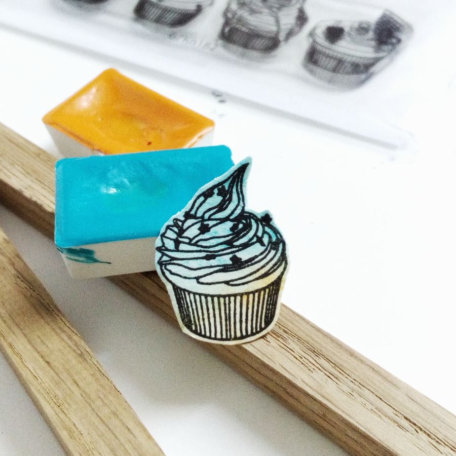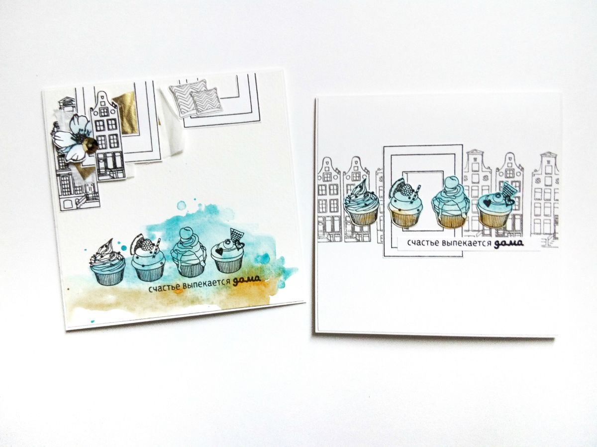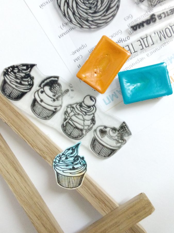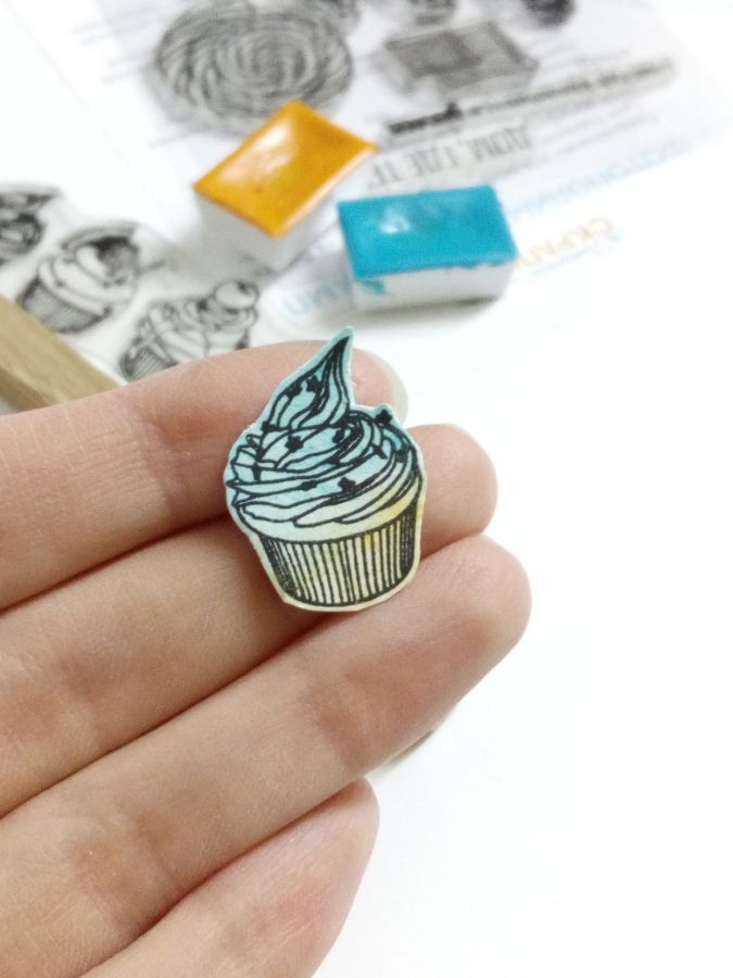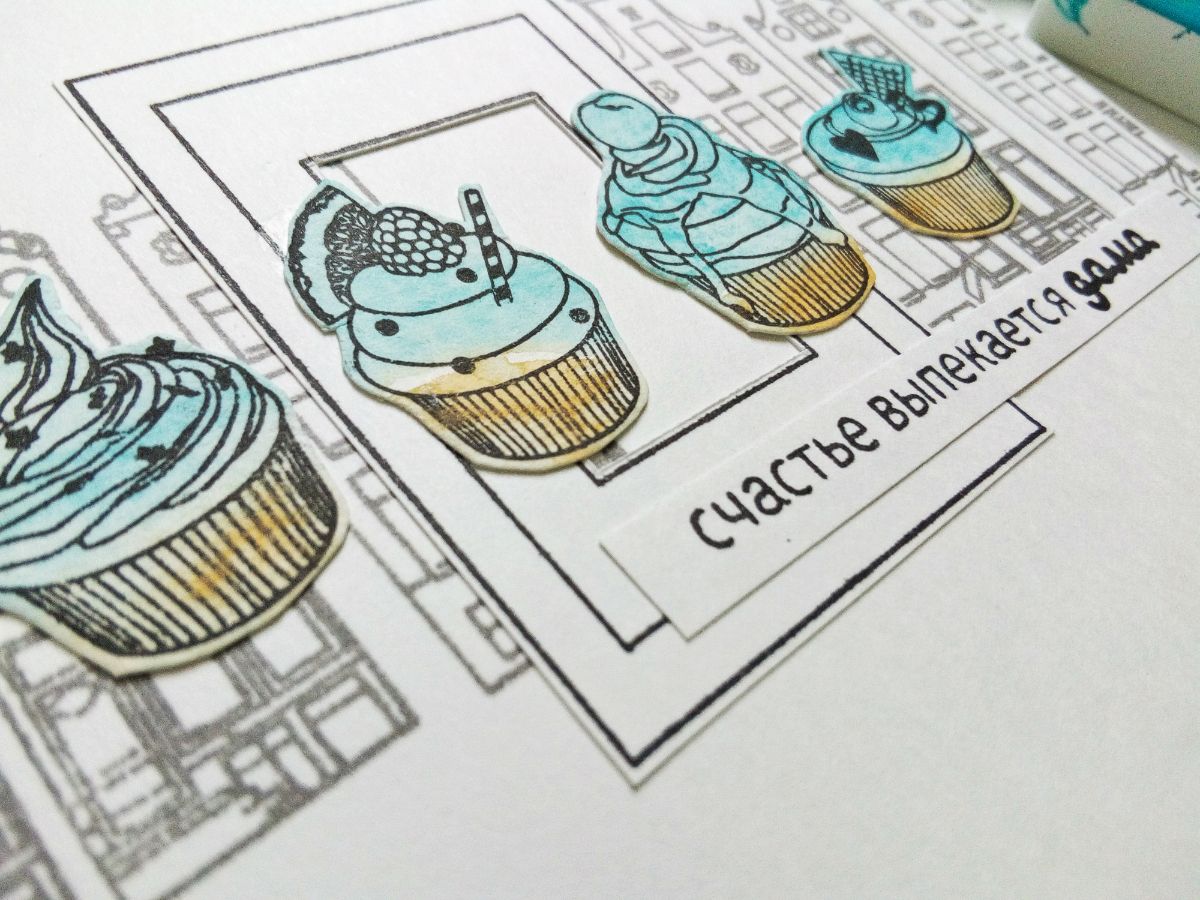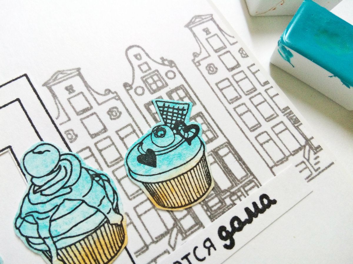 Но можно поставить оттиски штампом "капкейки" и на отдельном листе бумаги с красочным фоном, а затем оттиски вырезать. Так получилась еще одна открытка.