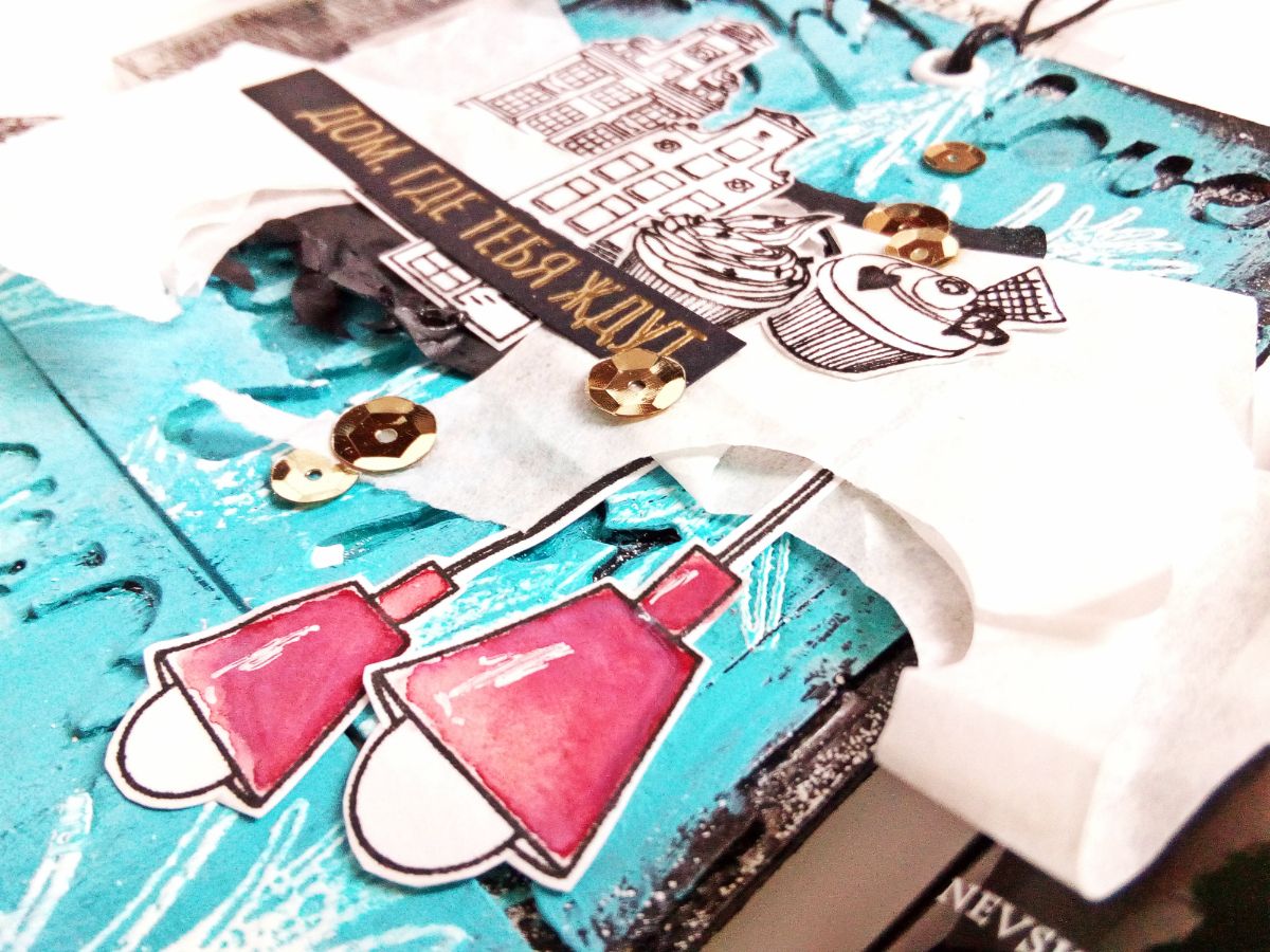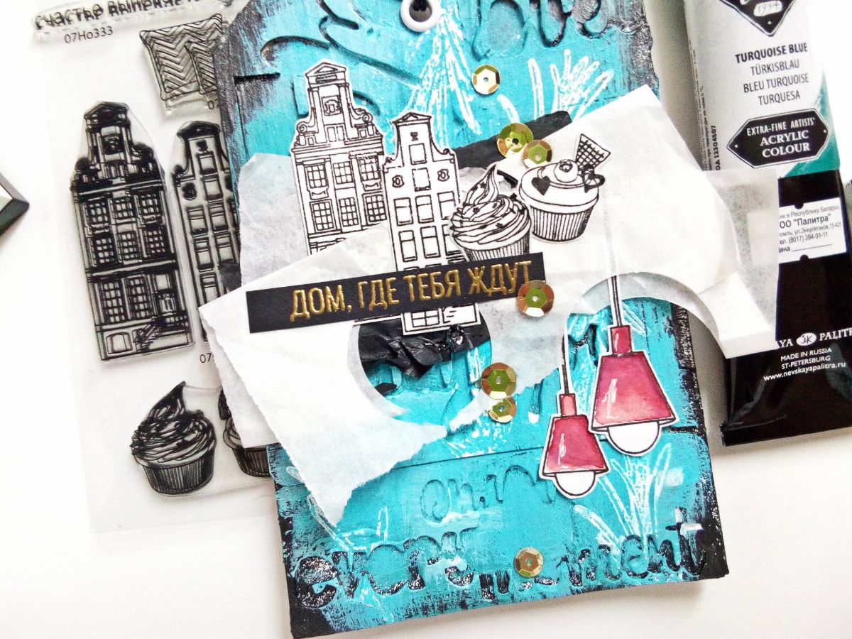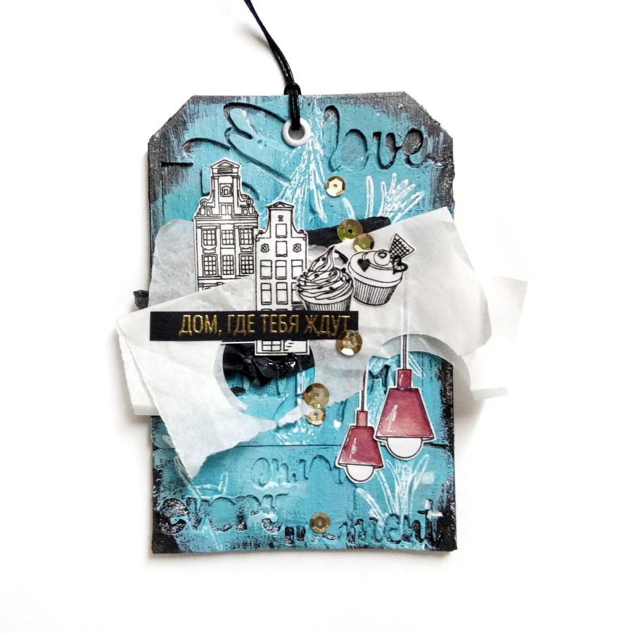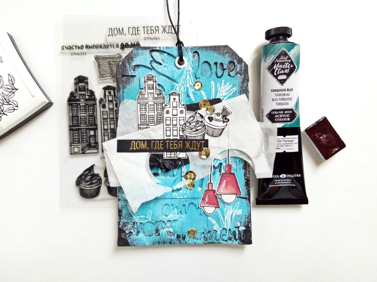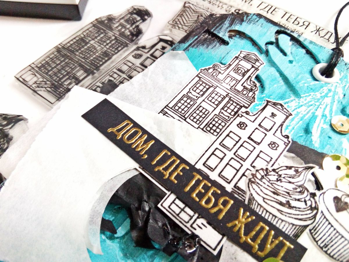 Но это еще не всё. Ведь штампы "домики" и эти малыши "капкейки" идеально подходят не только для штамповых работ, но и служат отличным декором для микс-медийных. И вот такой тег у меня получился. На мой взгляд, самый "домашний". Не только потому, что тут и ароматный розмарин, и уютная лампа-лофт. Есть в нем что-то личное, настроение моего города, который чаще хмурый, чем солнечный, с такими же старинными домиками, где порой даже днем приходится зажигать свет. И именно в этом городе есть дом, где меня ждут. И символичная надпись на теге.