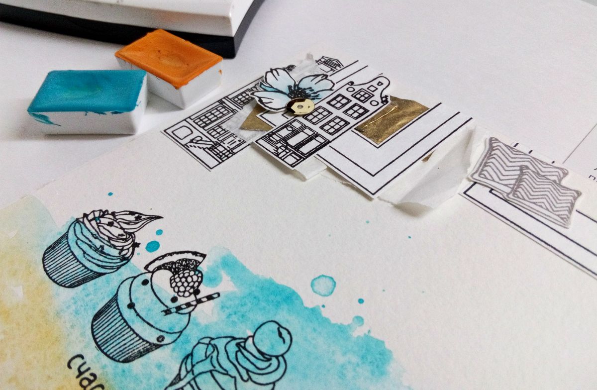 Для создания первой открытки я взяла купеческие домики, дополнила их уютными подушками шеврон, добавила рамки с паспарту и лютик-цветочек.