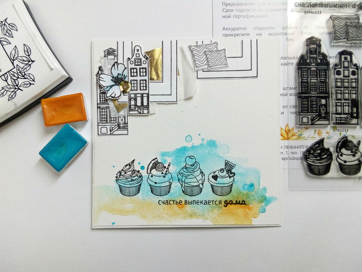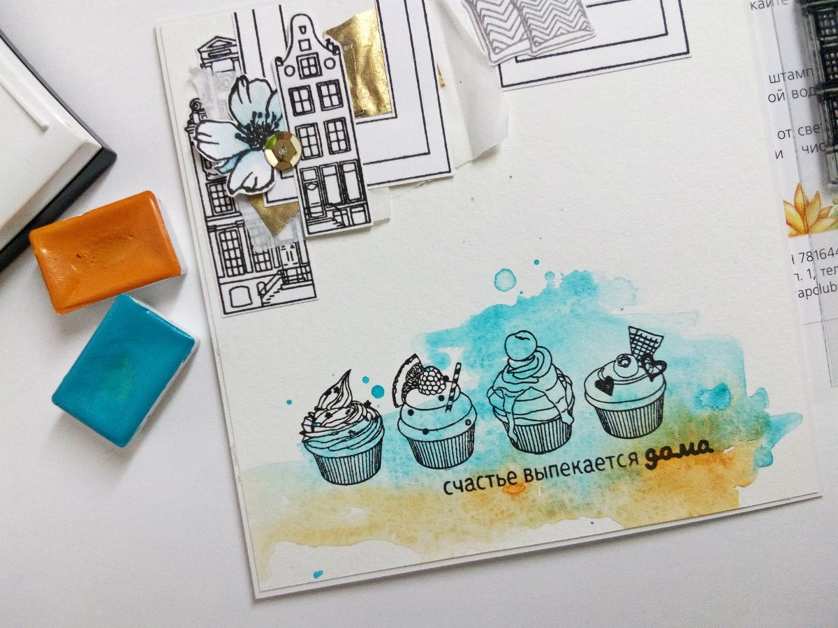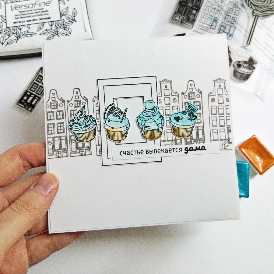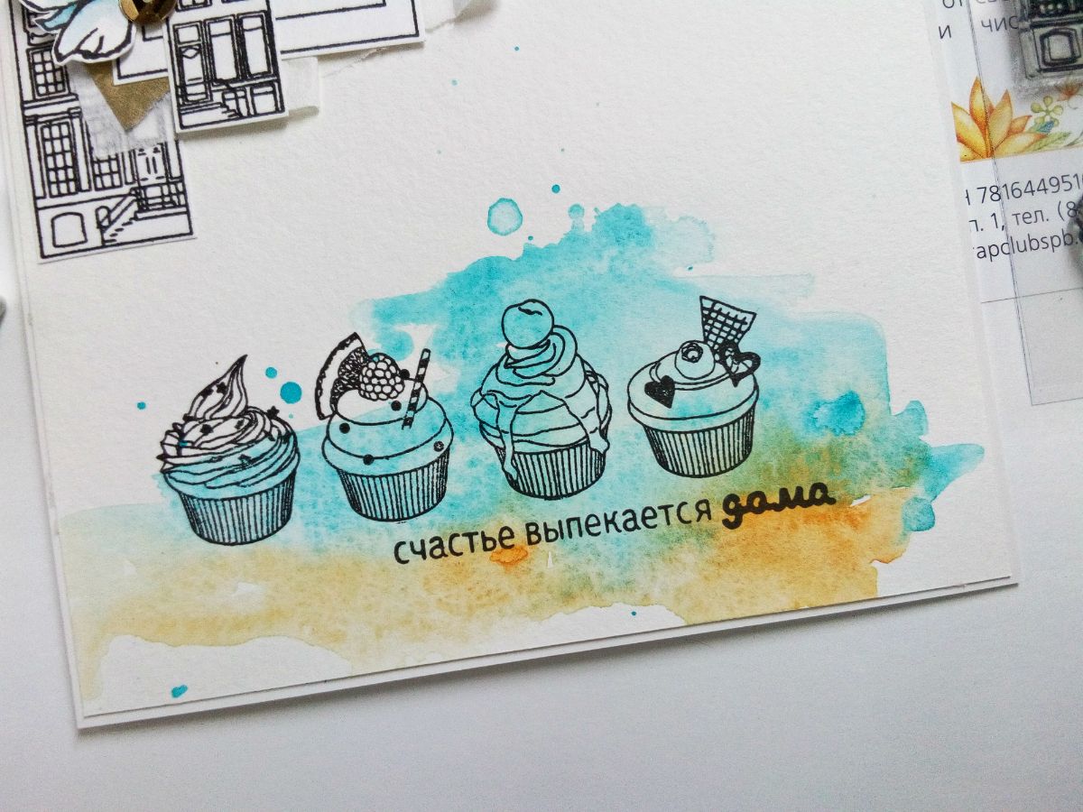 Капкейки отпечатала прямо на основе открытки на красочном акварельном фоне. И добавила надпись "счастье выпекается дома".