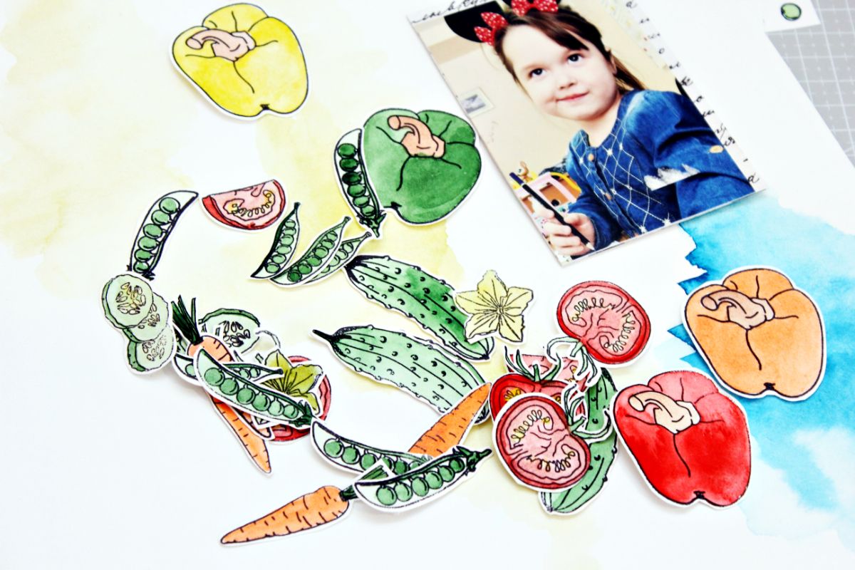 Подошло время собрать страничку. Примеряем овощи к фото, стараемся сделать композицию гармоничной и интересной.