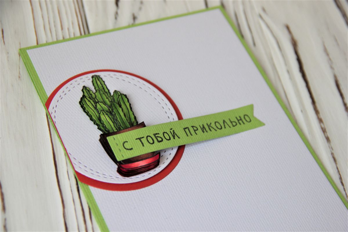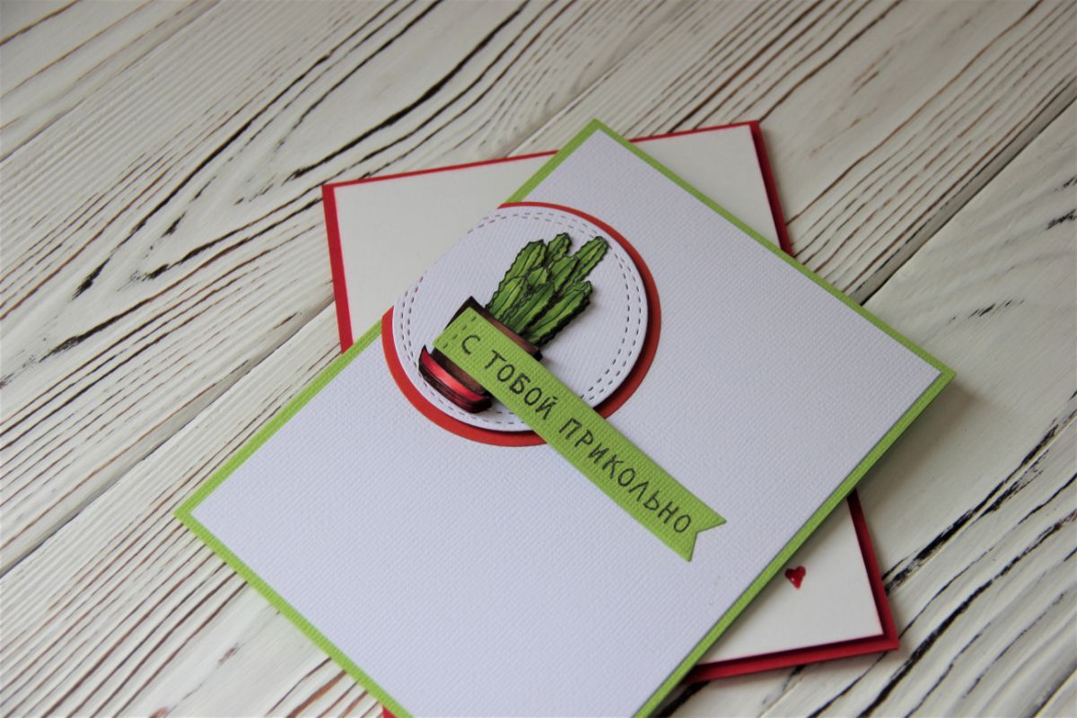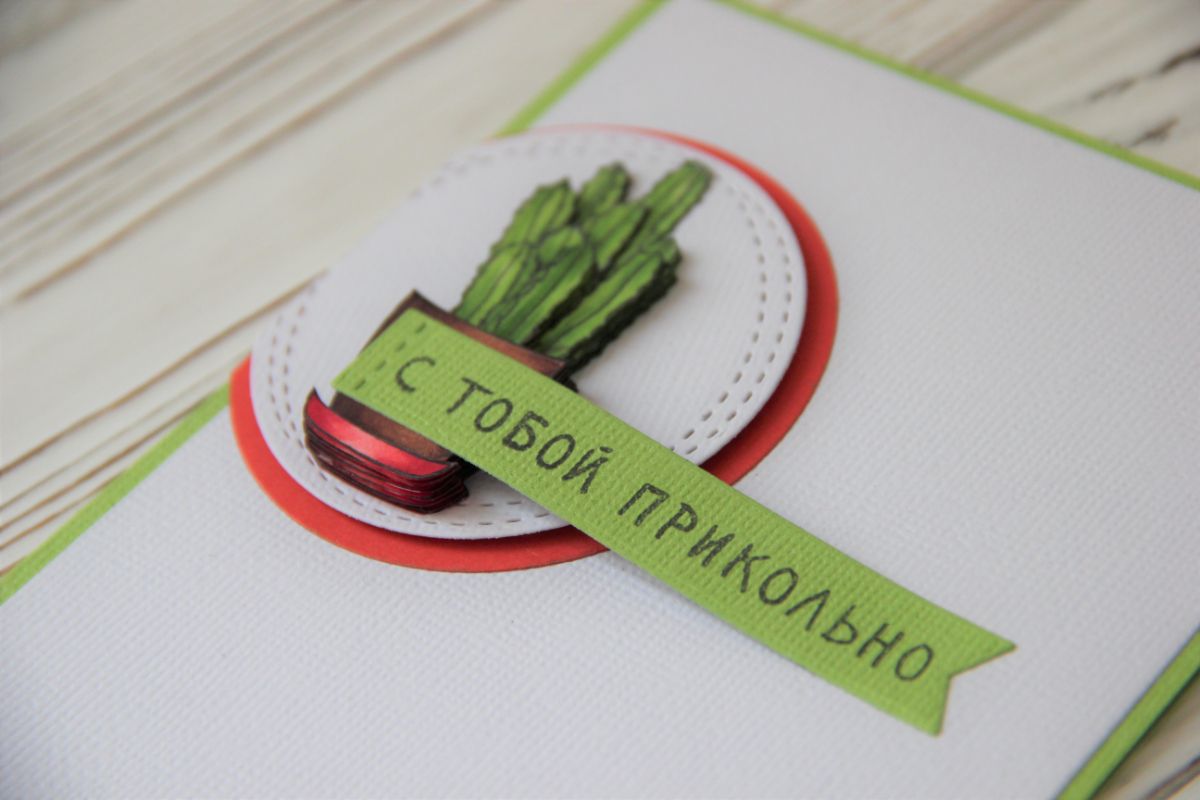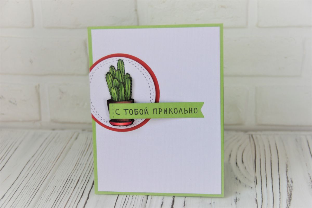 Очень простая, но в то же время, очень интересная получилась открытка. Все мои коллеги, отметили ее как самую интересную. Хотя, по сути, в ней и нет ничего, два прямоугольника, два круга и сам кактус.