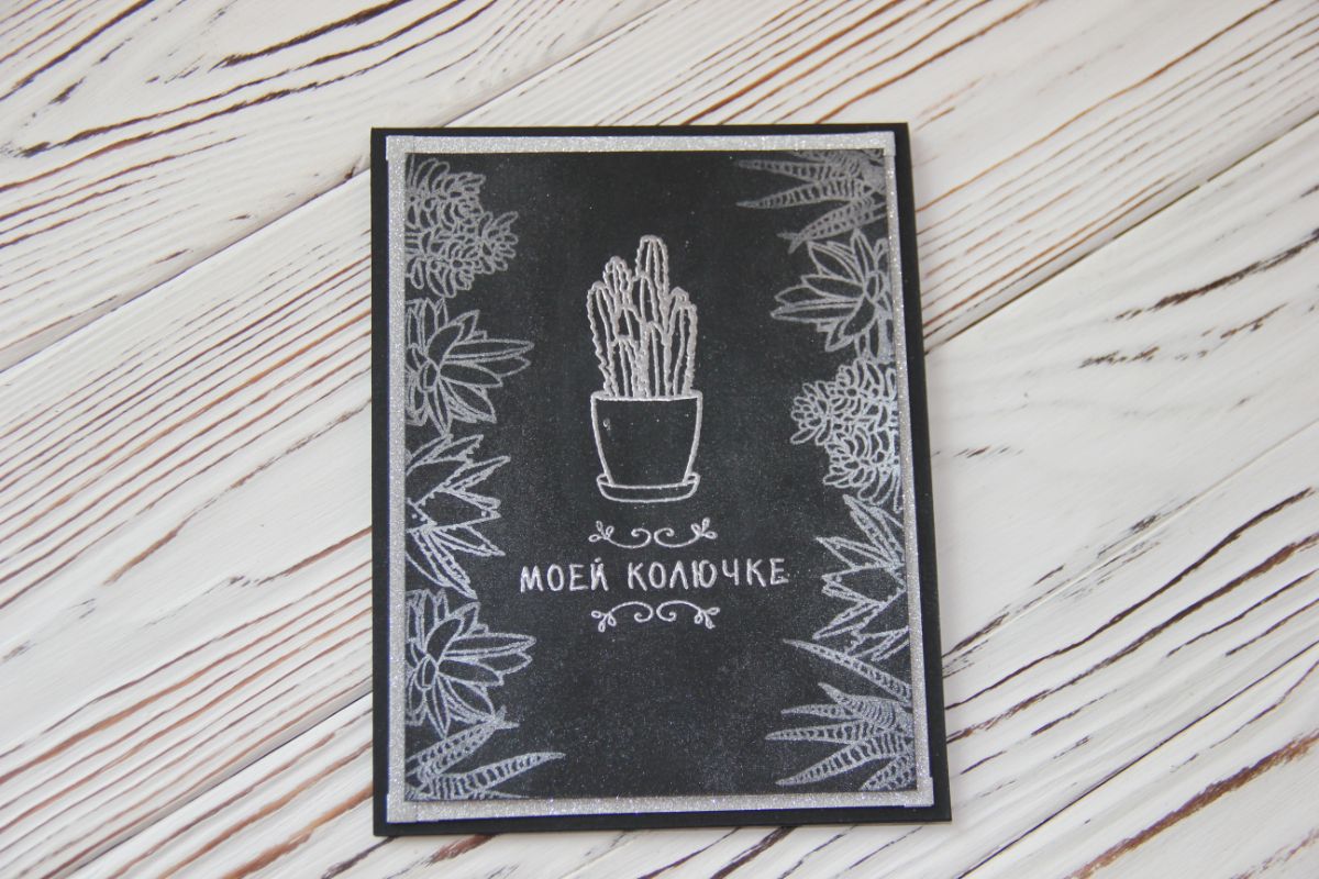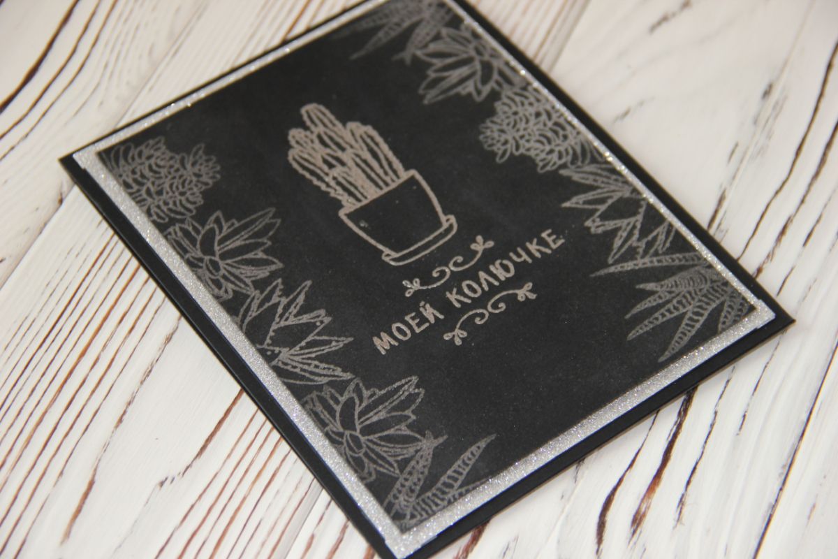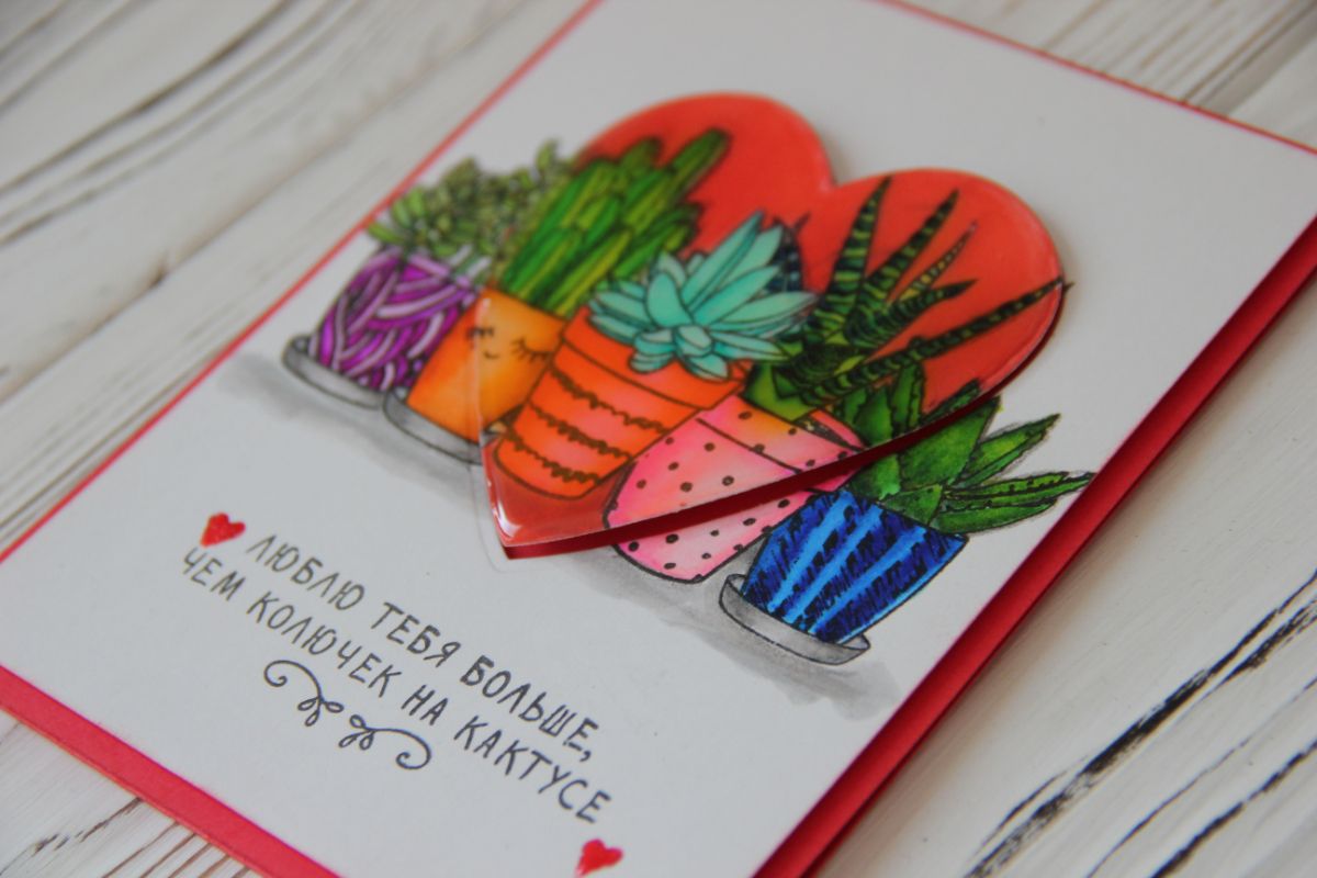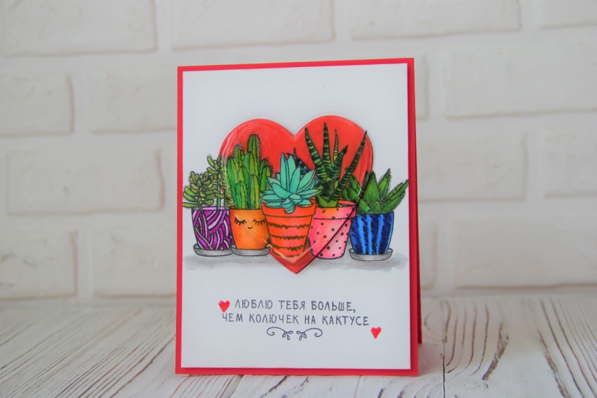 Очень простая, но в то же время, очень интересная получилась открытка. Все мои коллеги, отметили ее как самую интересную. Хотя, по сути, в ней и нет ничего, два прямоугольника, два круга и сам кактус.