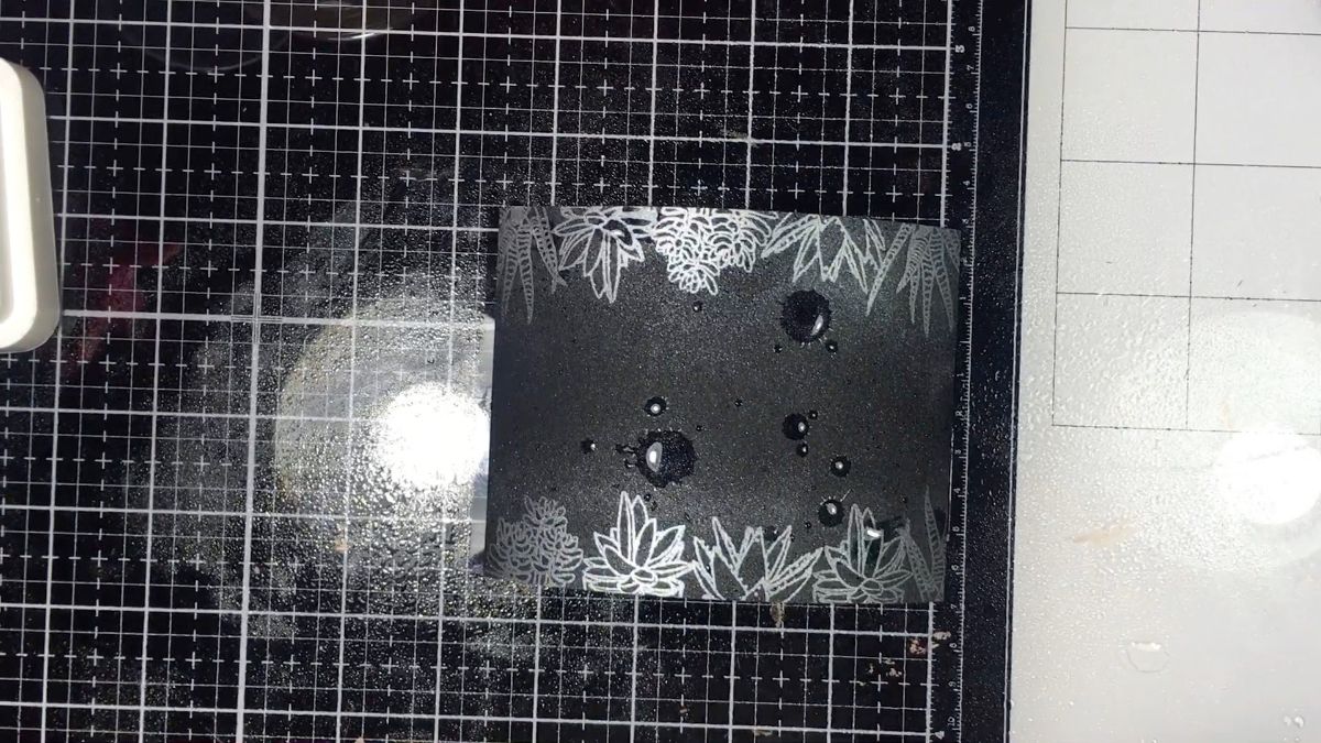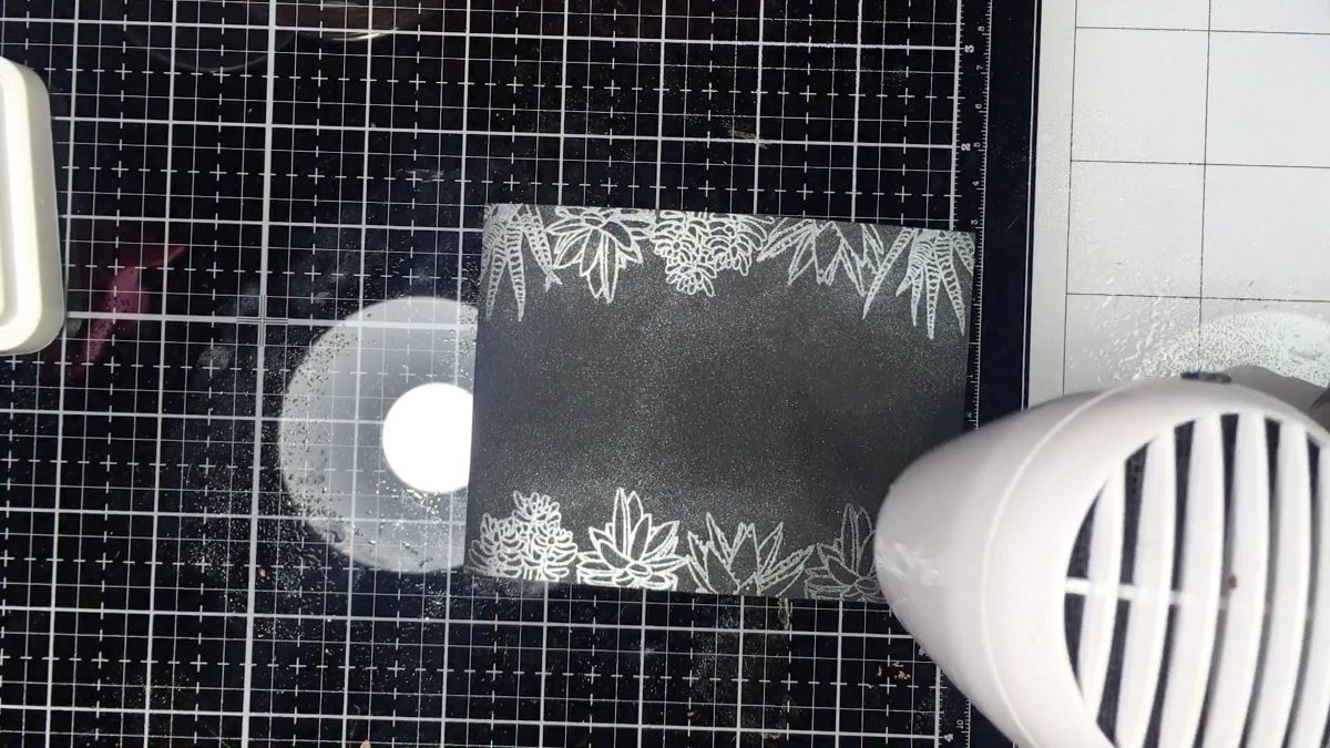 При сбрызгивании кардсток слегка деформируется, выгибается как черная кошка. Чтобы усмирить и вернуть основную подложку на свое место, я чуть-чуть подсушиваю феном. Ровно до того момента, как положка вернула себе первоначальное лицо. Это приблизительно 2-3 секунды.