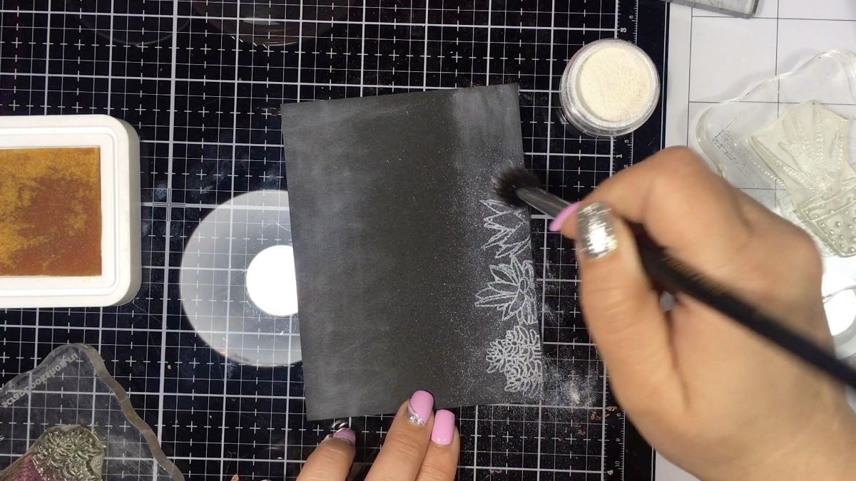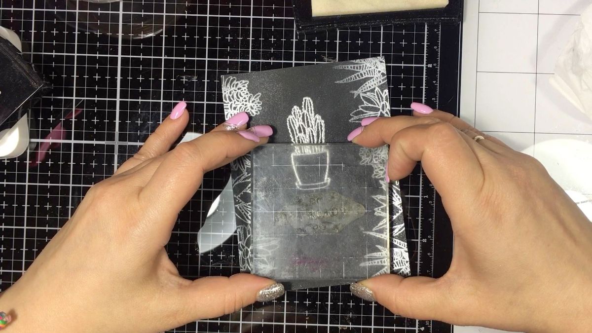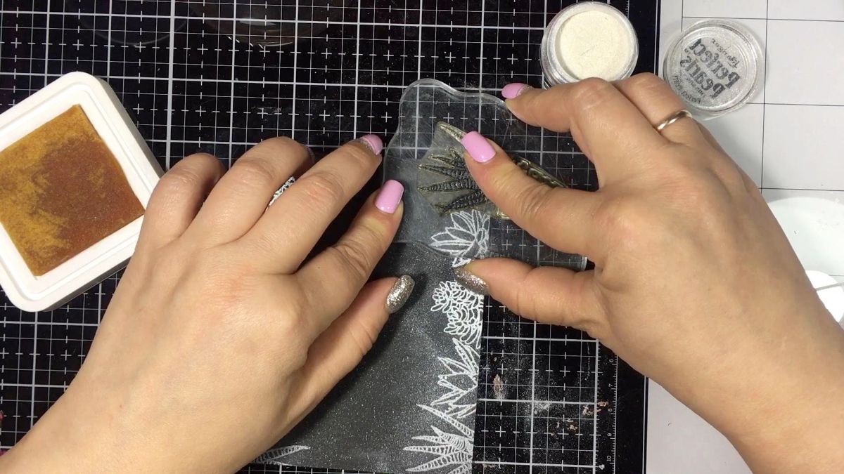 Итак, на основную подложку, я нанесла штампы. Но мне хотелось создать эффект свободных растений, поэтому горшки остались за границами листа. Оттиски ставлю специальными чернилами для Perfect Perl, а потом специальной же кистью, втираю в чернила саму пудру.