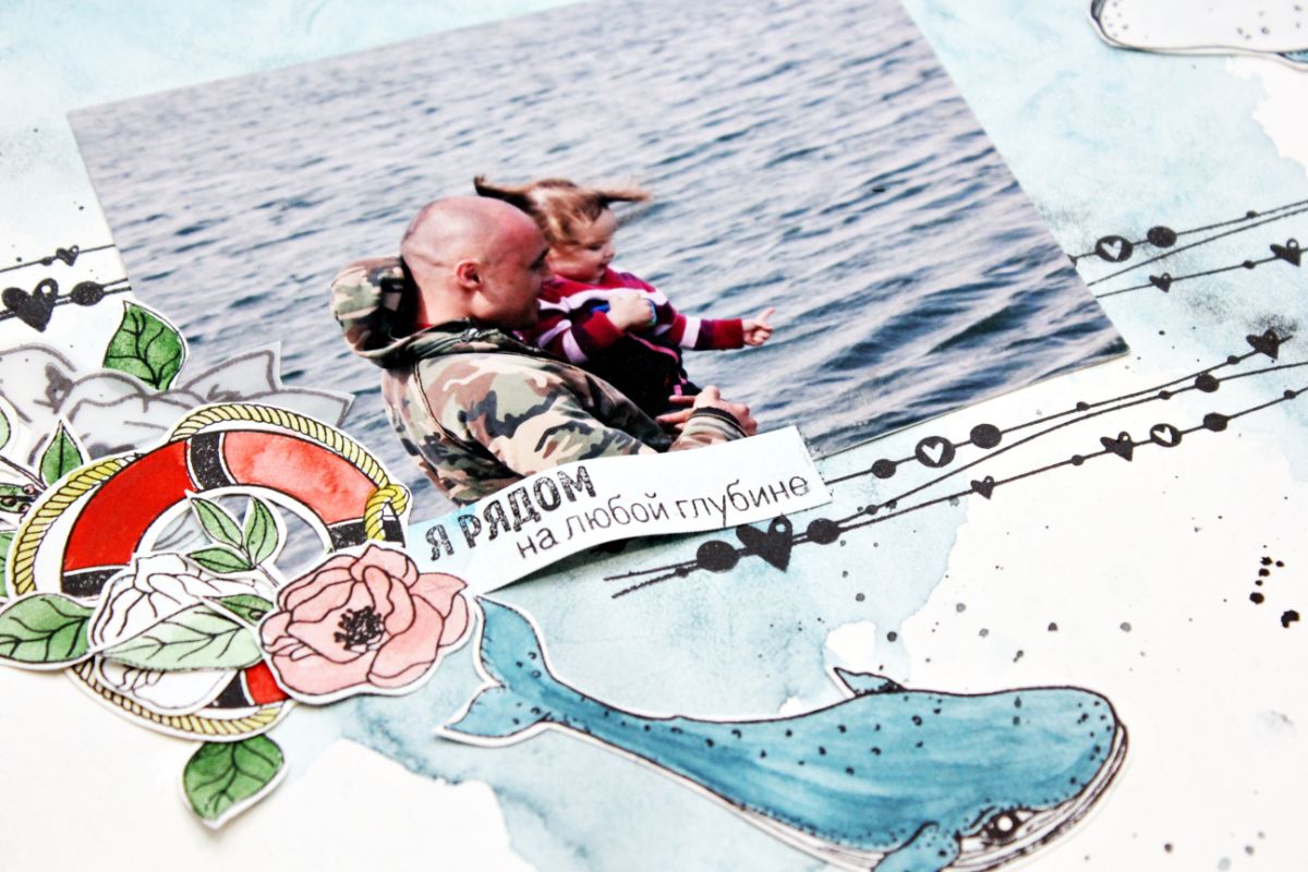 "Я рядом на любой глубине" мотивационный и раскрывающий смысл странички штамп. Именно с помощью него я выразила главную мысль, что в любом месте и в любых условиях близость родителя и ребенка это особая, тесная связь.