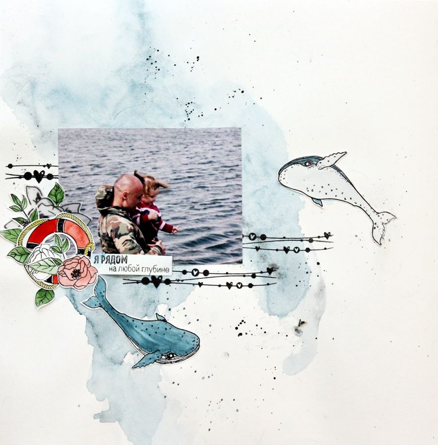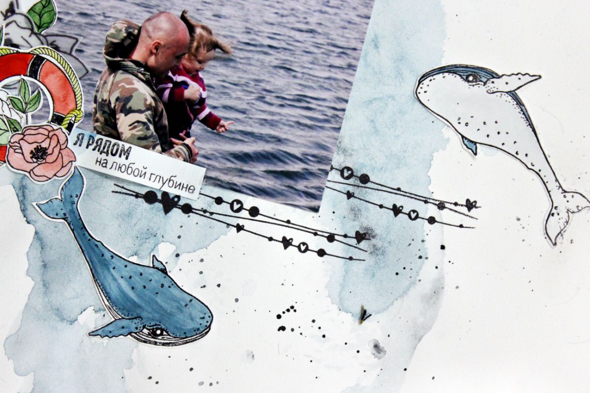 Для создания странички мне приглянулись штампы из серии "Морские глубины", а именно "Внимательный кит", которого я разместила двумя способами, что позволило изобразить его как плывущего в глубины чувств, так и из них.