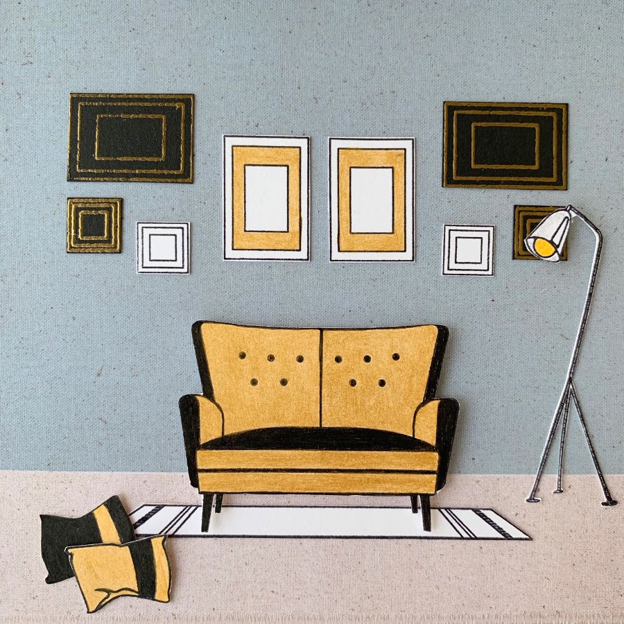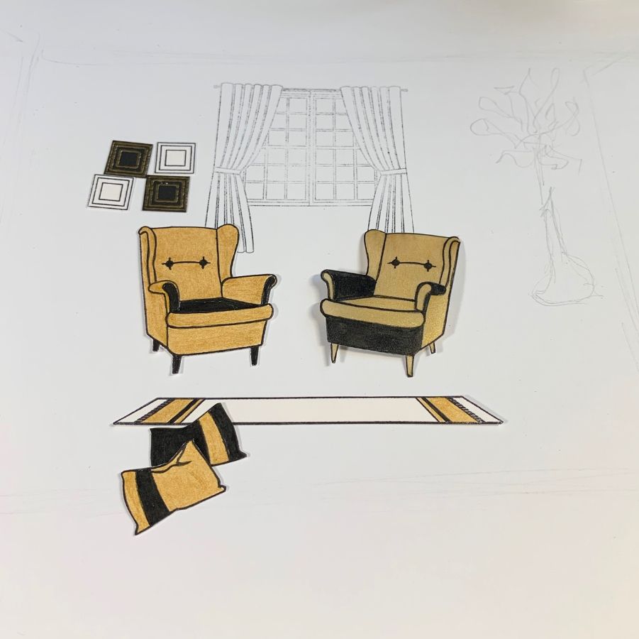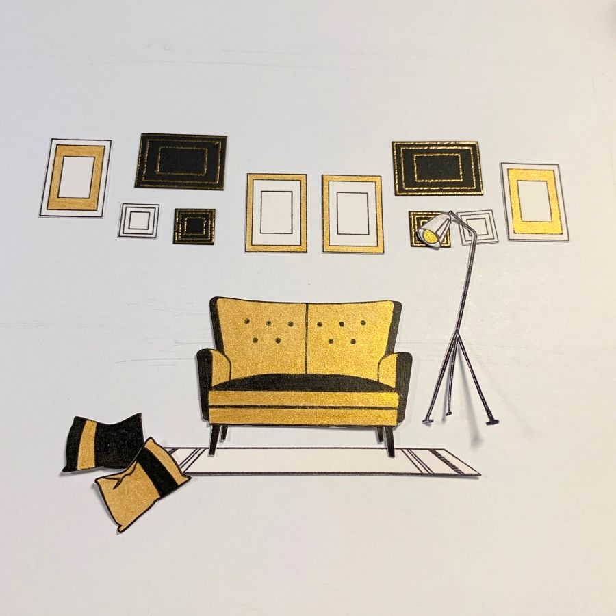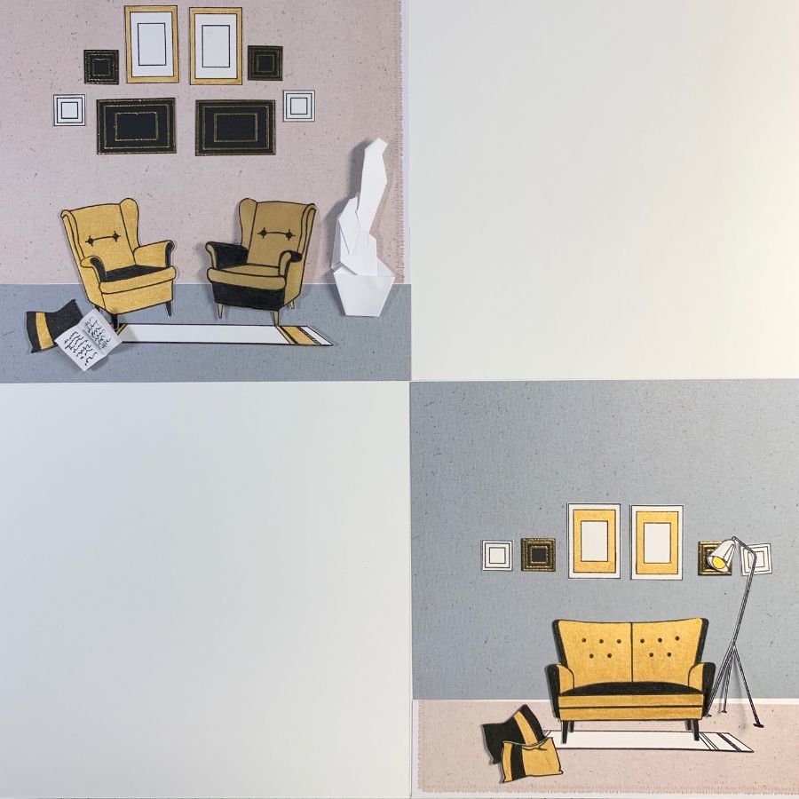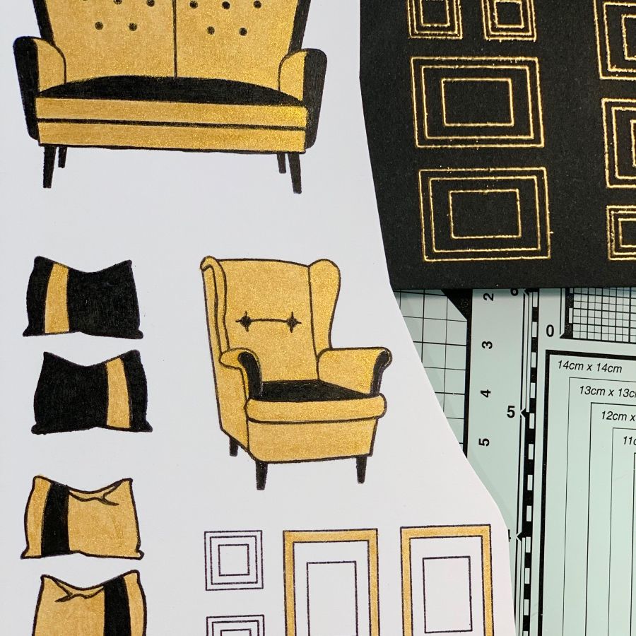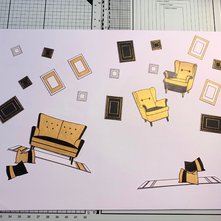 Покажу вам свои черновики раскладок. Мебель наштамповала, раскрасила золотым и черным, картинные рамки сделала при помощи золотого эмбоссинга. Вырезала и набросала сначала на белый лист с карандашными почеркушками, а затем на предполагаемый фон будущей странички.