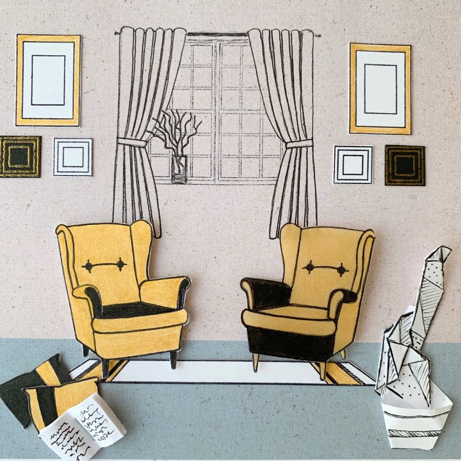 Проект со штампами в интерьере (он представлен двумя квадратами, расположенными по диагонали, где отражено расположение мебели по противоположным сторонам комнаты);