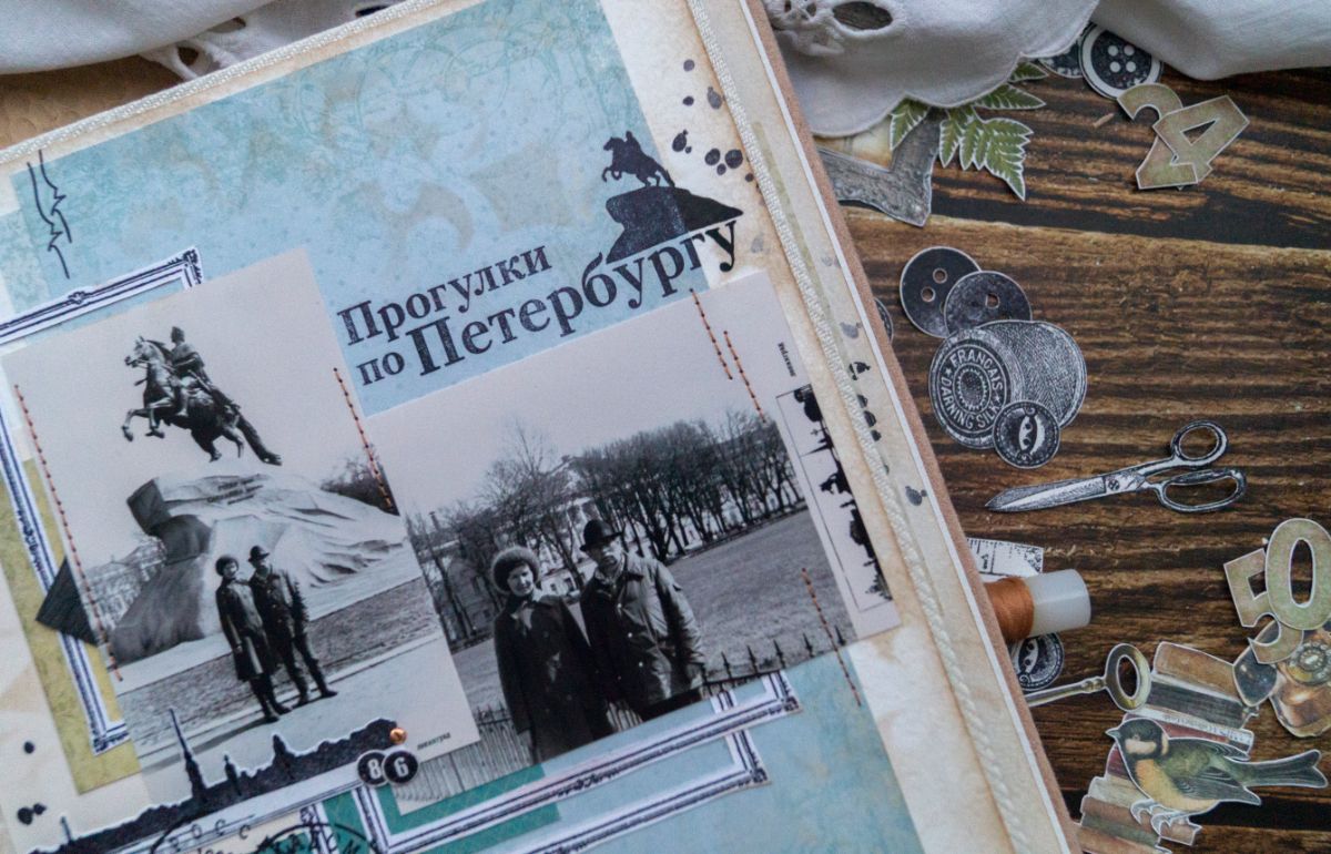 В работе над альбомом использовала трафарет Солнцеворот и штампы: Родительский дом, Моменты создают воспоминания, Штриховка, Пуговица 2, Пуговица 3, Пуговица 4, Пуговицы, Портновские ножницы (В), Сантиметр, Катушка ниток (В), Моя жизнь, Здесь и сейчас, С любовью в сердце, Календарная сетка квадратная (август), Набор цифор 8, вертик., Кадом, Санкт-Петербург, Александровская колонна малая, Петропавловская крепость малая, Прогулки по Петербургу, На это стоит взглянуть, Журналинг 15, Винтажная рамка большая.