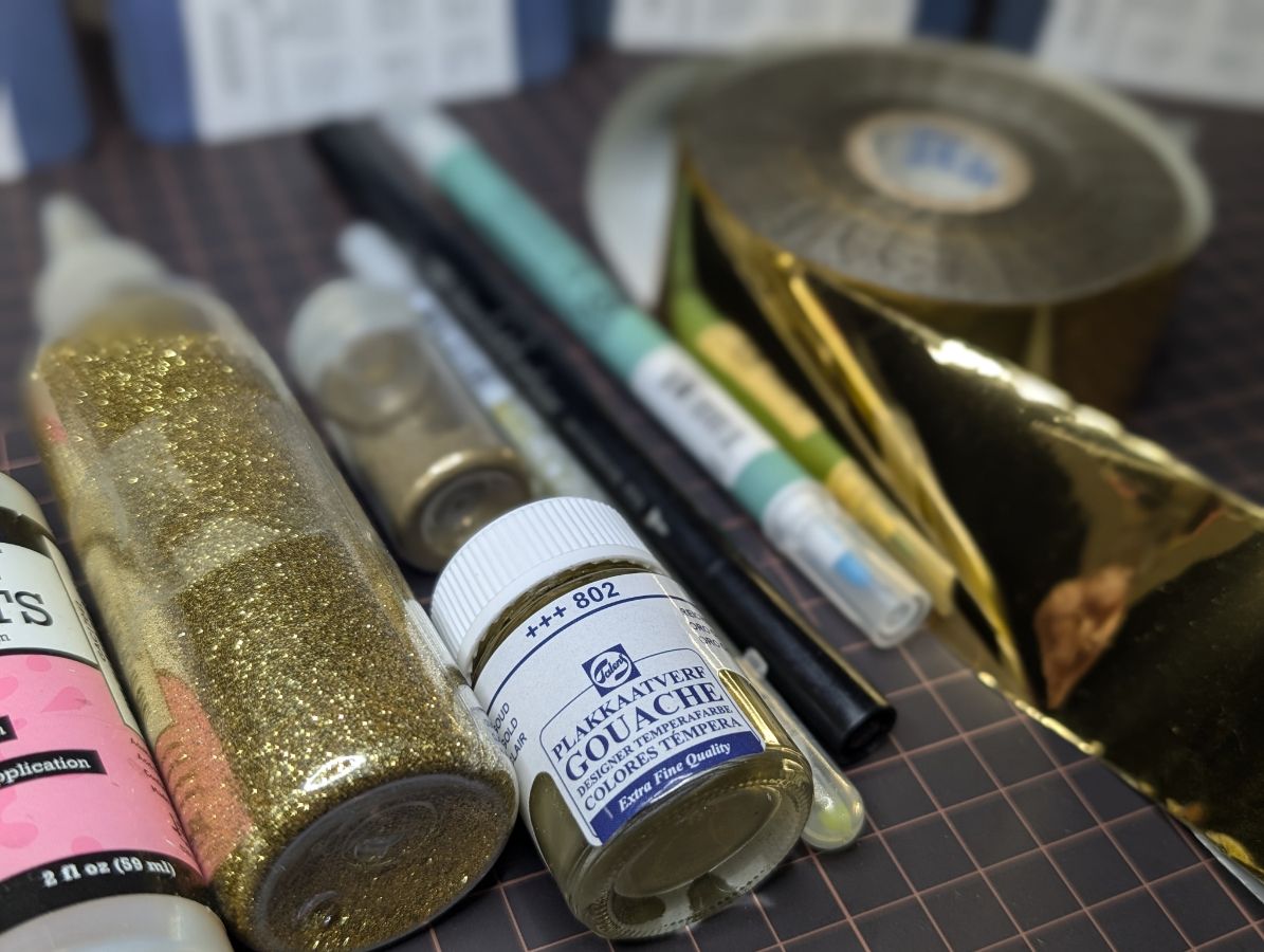 Самый простой способ получить золото - это золотая гелевая ручка. У меня ручка фирмы Jelly Roll, которая дает плотный слой золотого блеска.