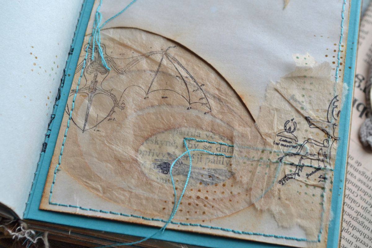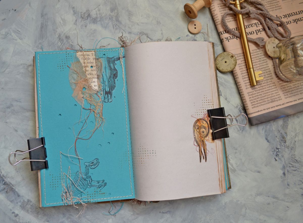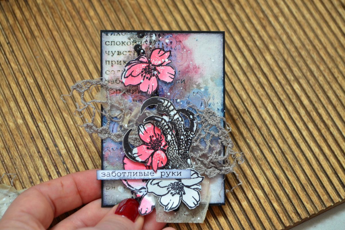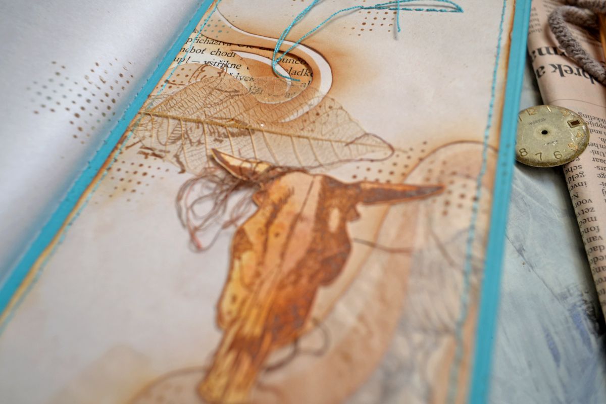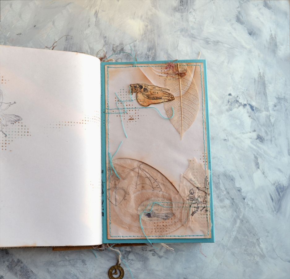 На первой стороне получилось что-то археологическое. Несколько слоев бумаги вырезала фигурно, тонировала и немного их сдвинула, придав глубины моим раскопкам. Добавить интриги и напустить туман помогла бумага с чайного пакетика. Еще она скрыла яркость оттисков и четкость переходов слоев бумаги.