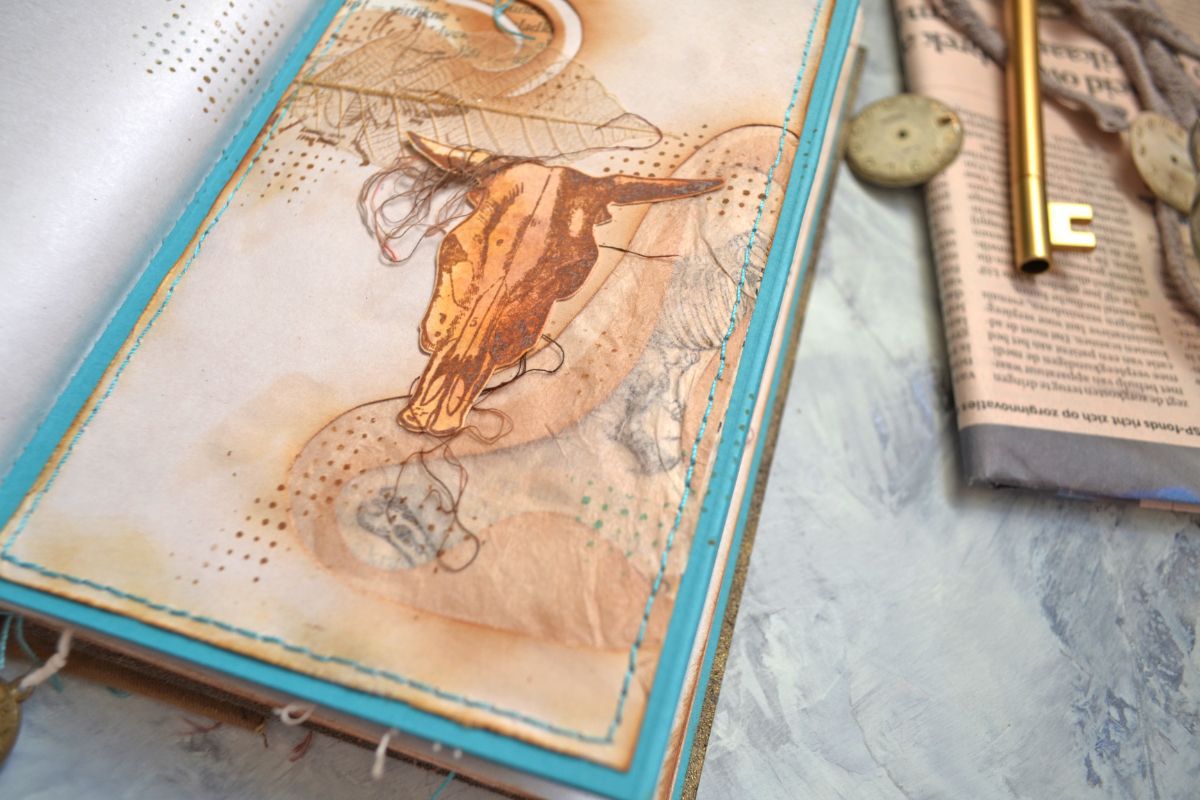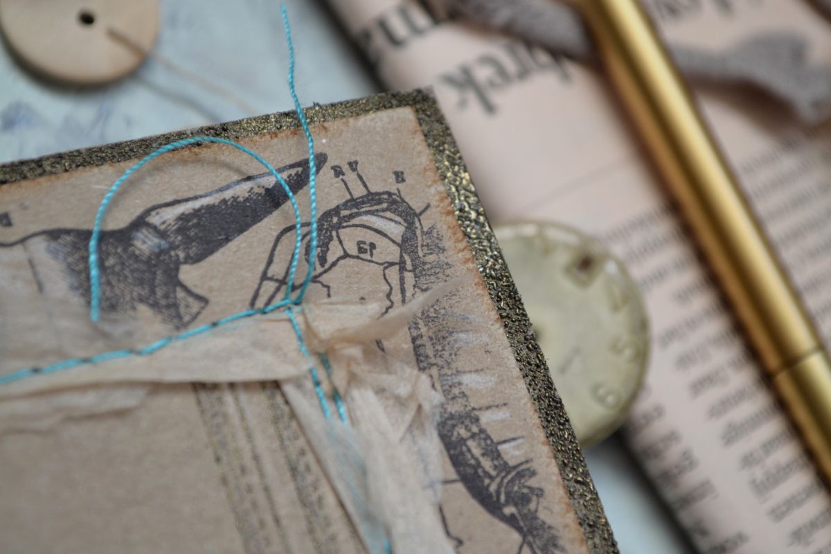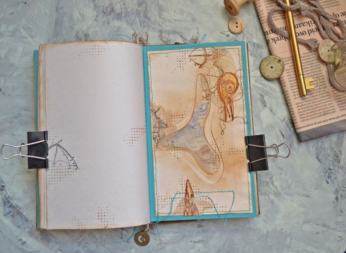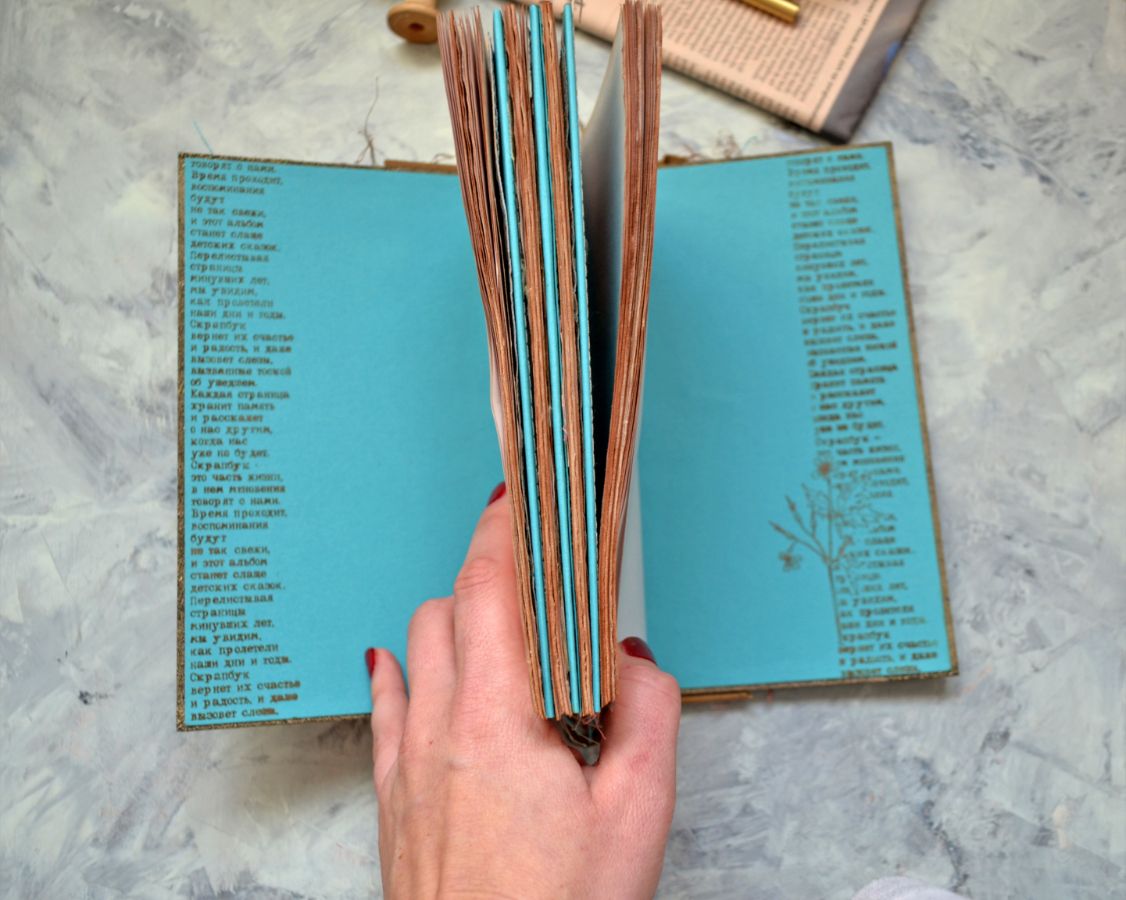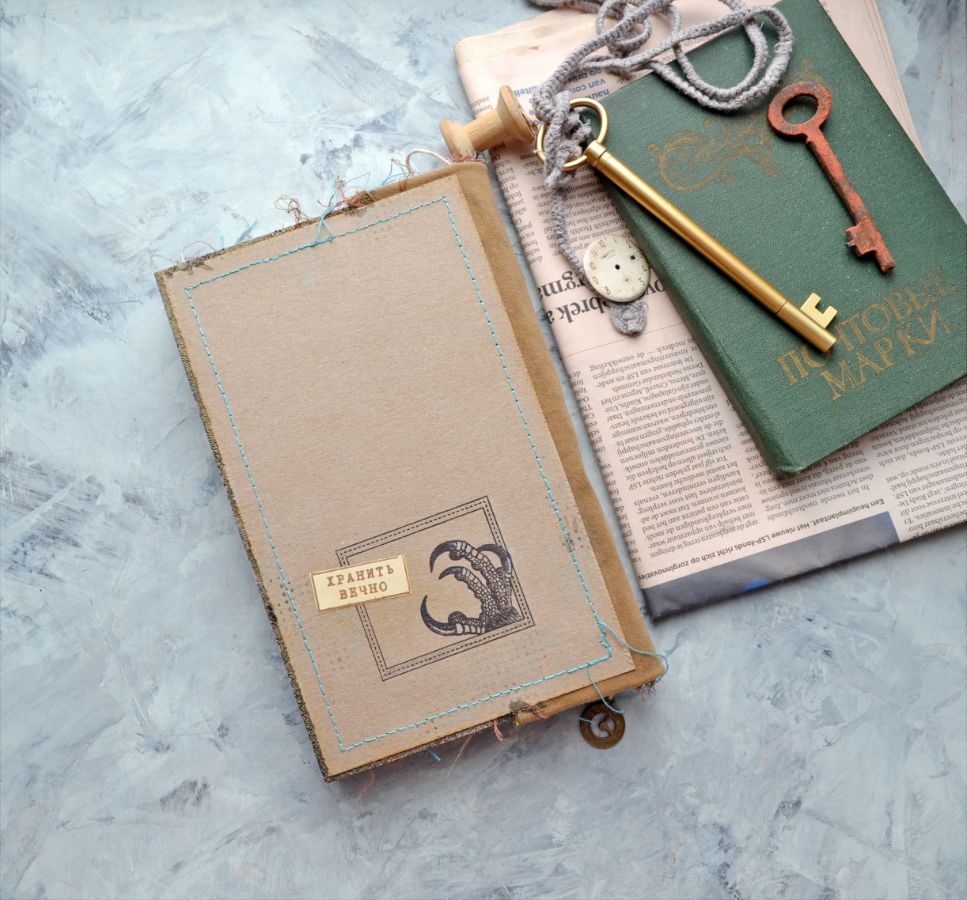 Крафт, бирюзовый картон, состаренная бумага и штампы-основные материалы. Стилизованная обложка, блокнот вполне сойдет за настоящую книгу. Его размер 20,5*13 см., толщина 2,5см., 120 листов.