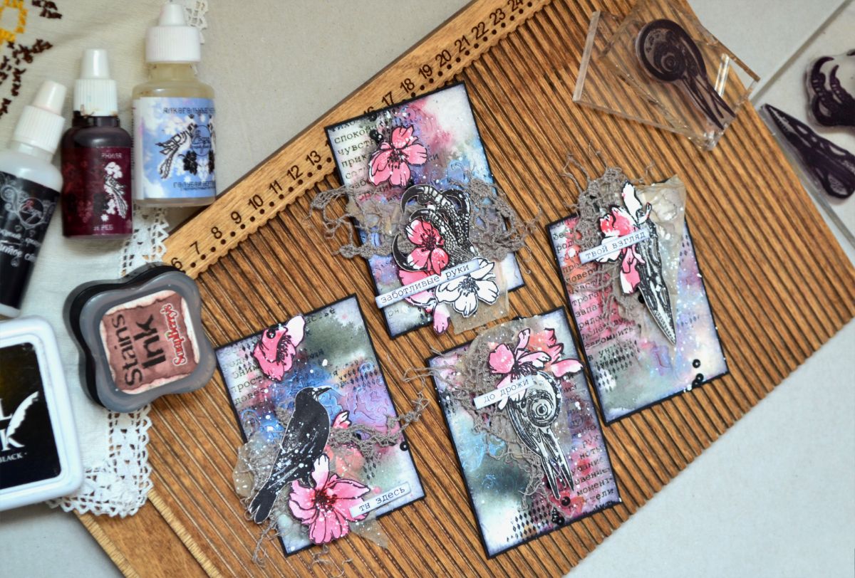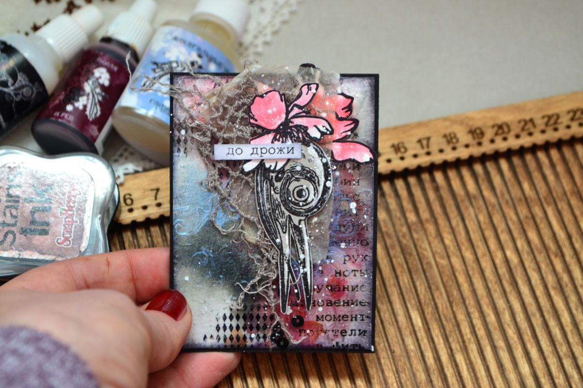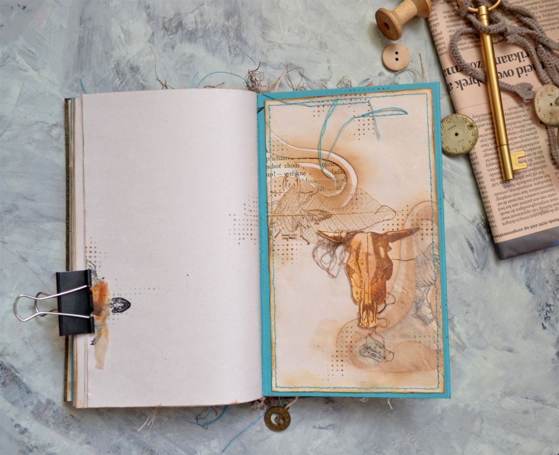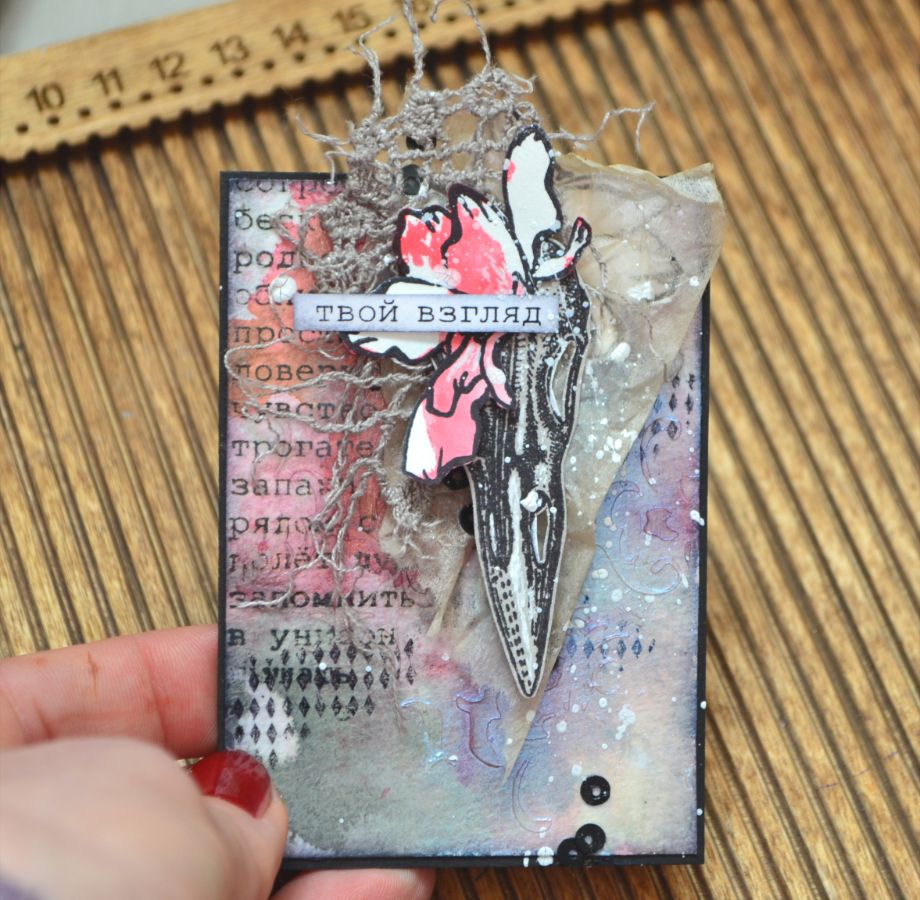 На мой взгляд, ничего здесь страшного нет и блокнот получился уютным, даже "откровенным")) Так что зря не пугайтесь анатомических штампов. Любые штампы универсальны и анатомические не исключение. Например, ЧЕРЕП ДЯТЛА стал героем моих АТС, а их украшением- штамп ЛЮТИКИ-ЦВЕТОЧКИ