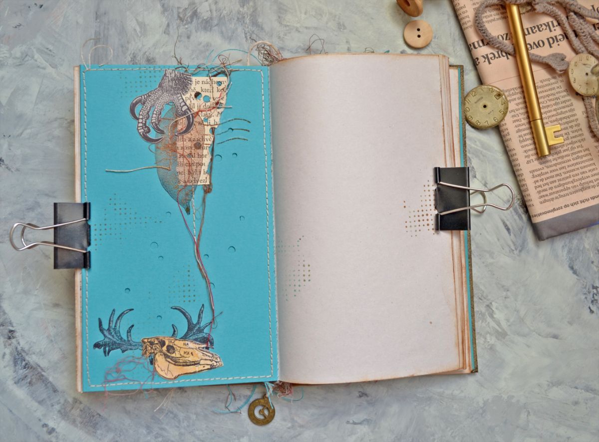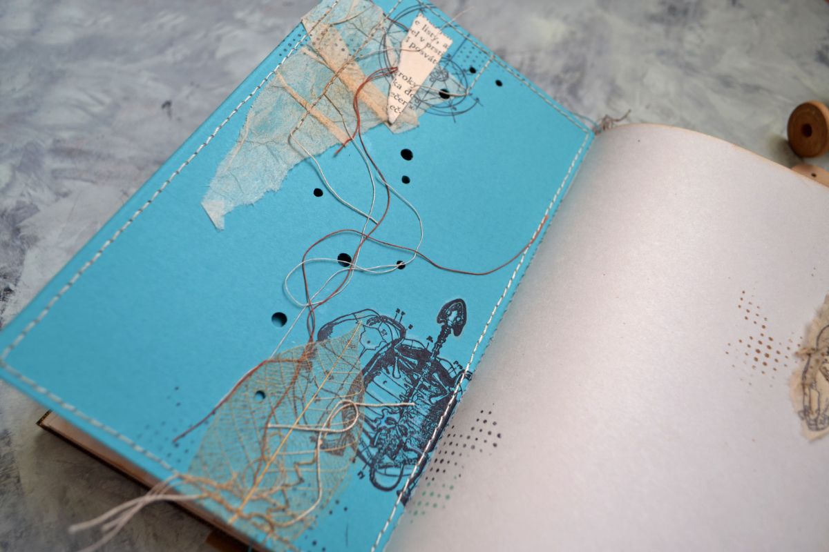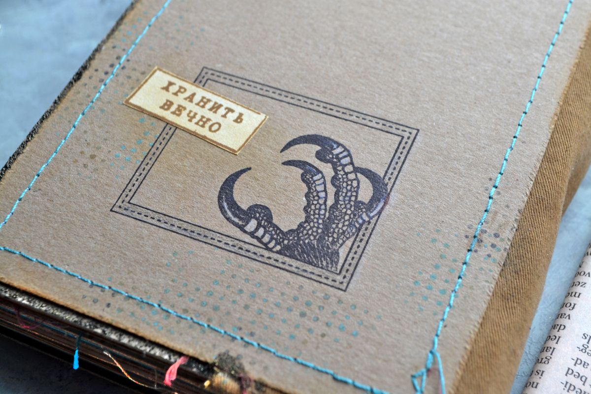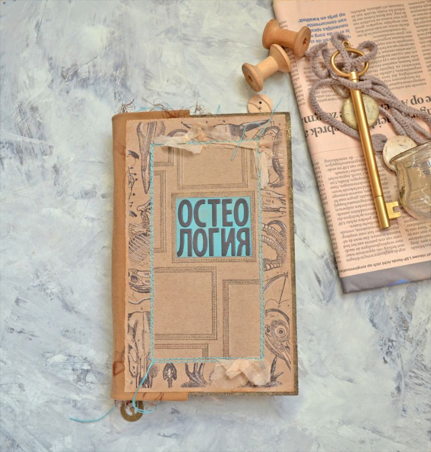 Основа обложки переплетный картон, края которого предварительно заэмбоссила. На самой обложке, в технике маскинг, рамочка анатомическими штампами. Детальности штампам добавил белый карандаш. Внутреннюю часть отделила отстрочкой и под вырубными буквами сделала тонировку оксайдами.