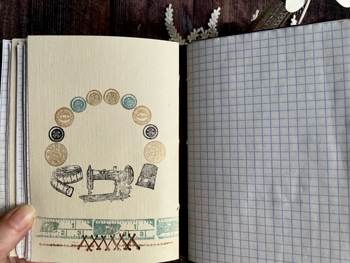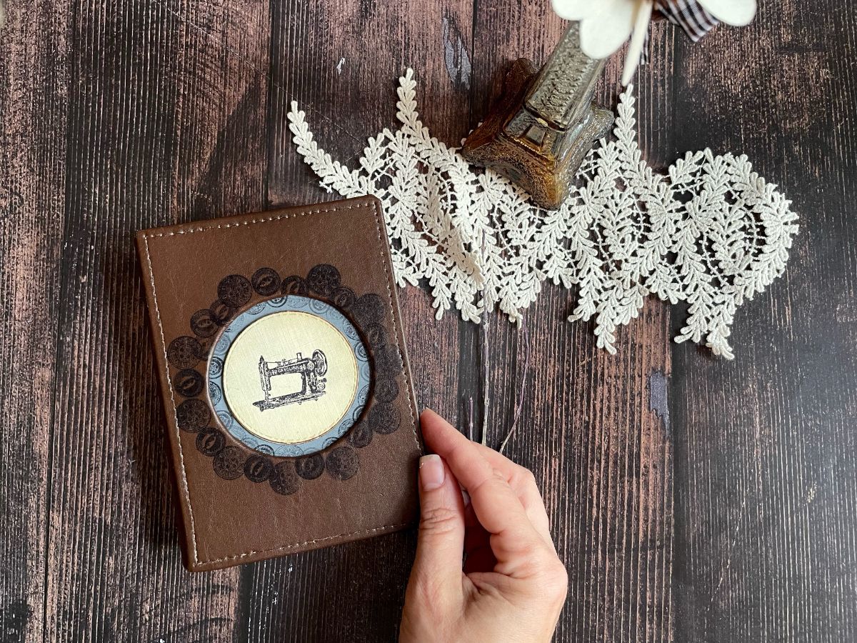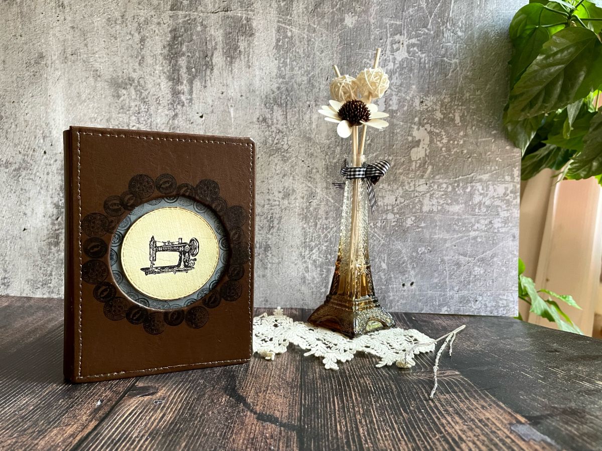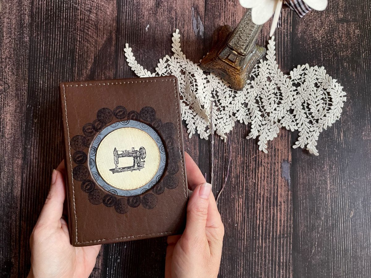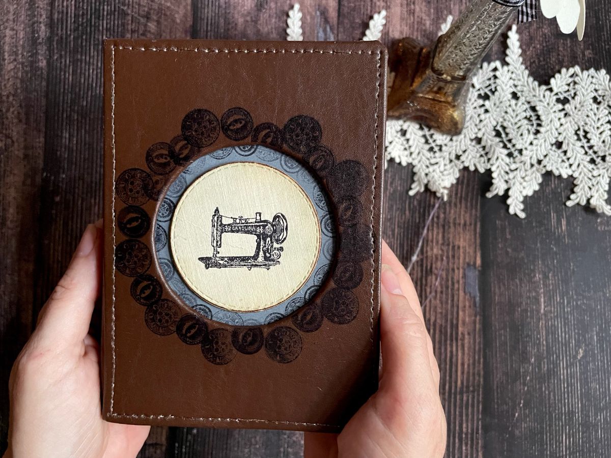 Обложку обтянула кожзамом. По середине обложки вырезала круг и получилось углубление, которое оформила отштамповками пуговиц архивными чернилами по краю снаружи и внутри. А в центре заняла своё место швейная машинка.