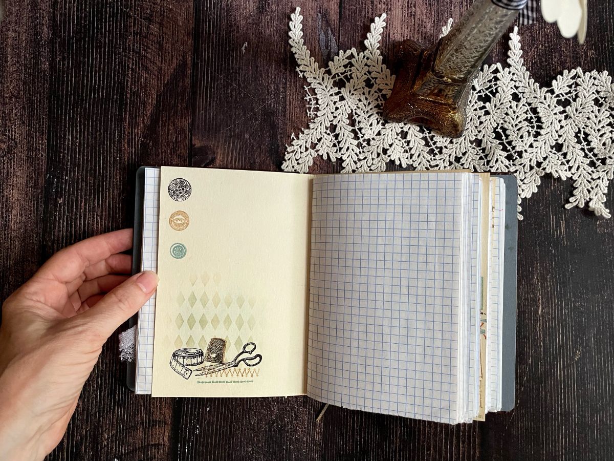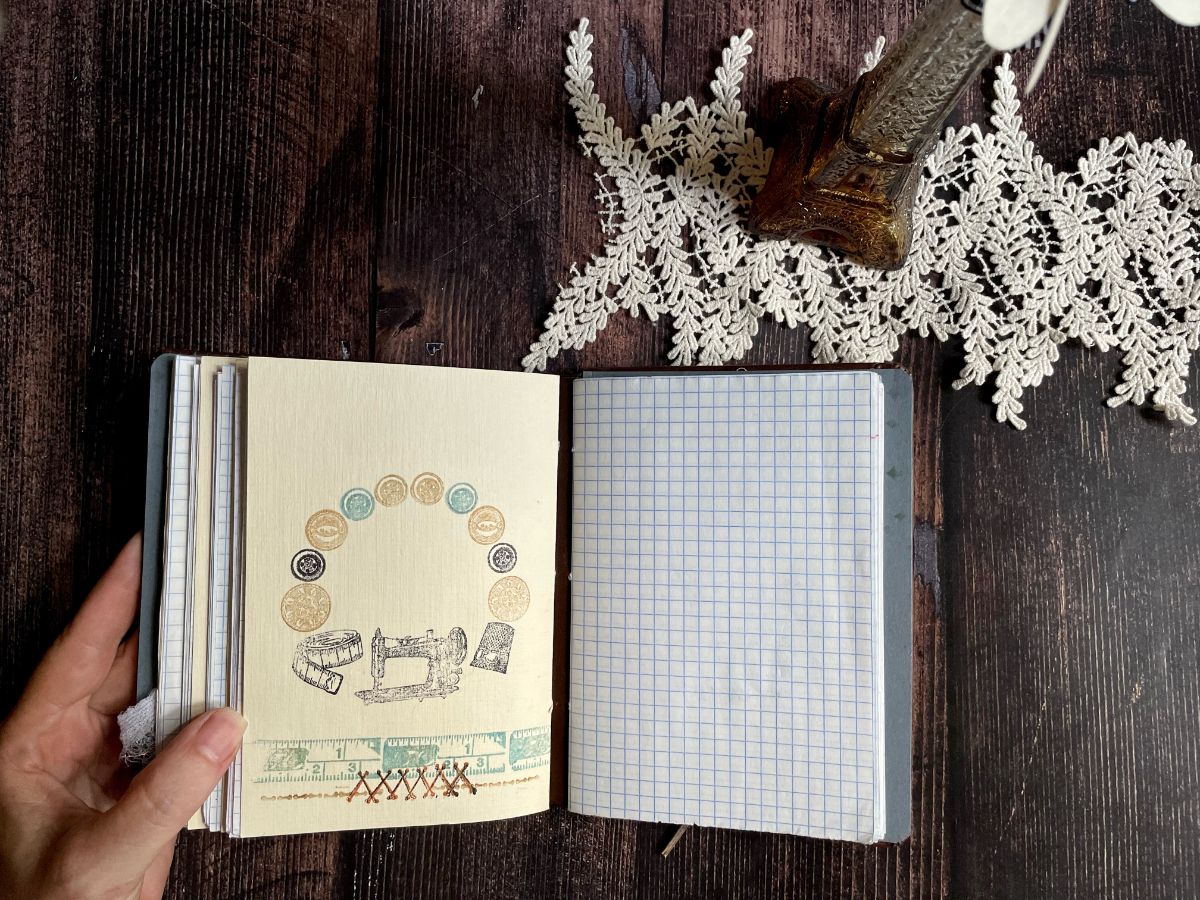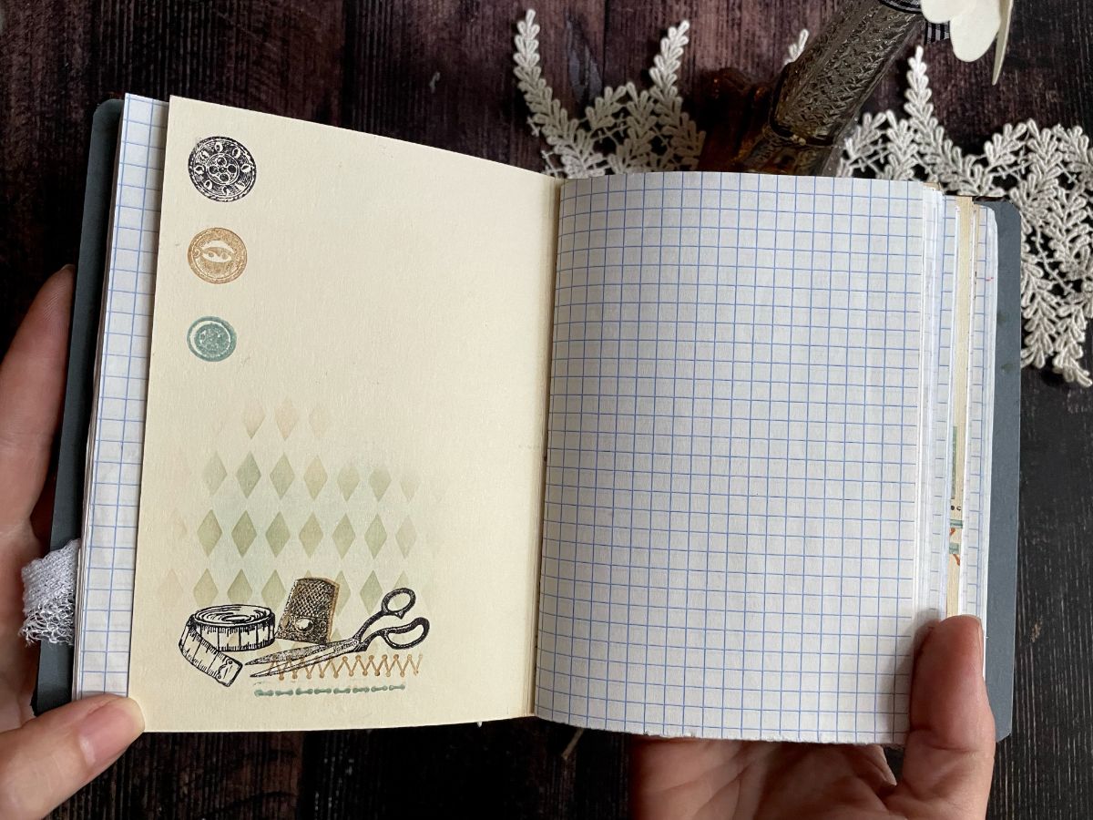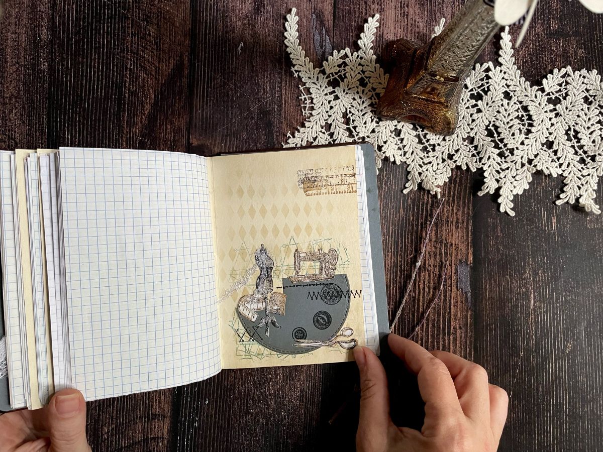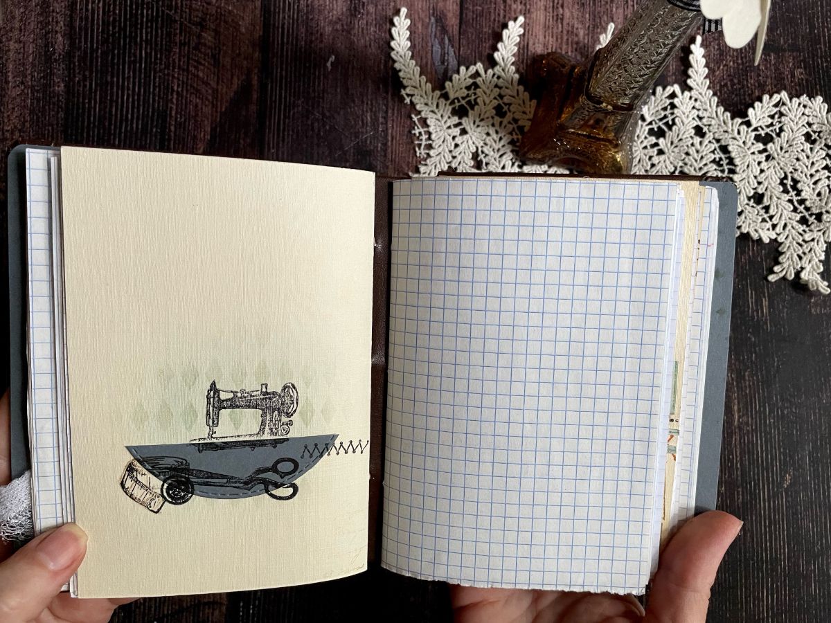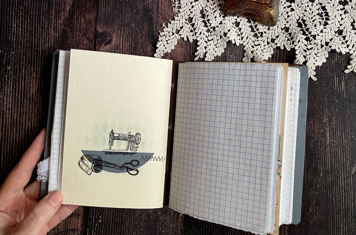 Обложку обтянула кожзамом. По середине обложки вырезала круг и получилось углубление, которое оформила отштамповками пуговиц архивными чернилами по краю снаружи и внутри. А в центре заняла своё место швейная машинка.