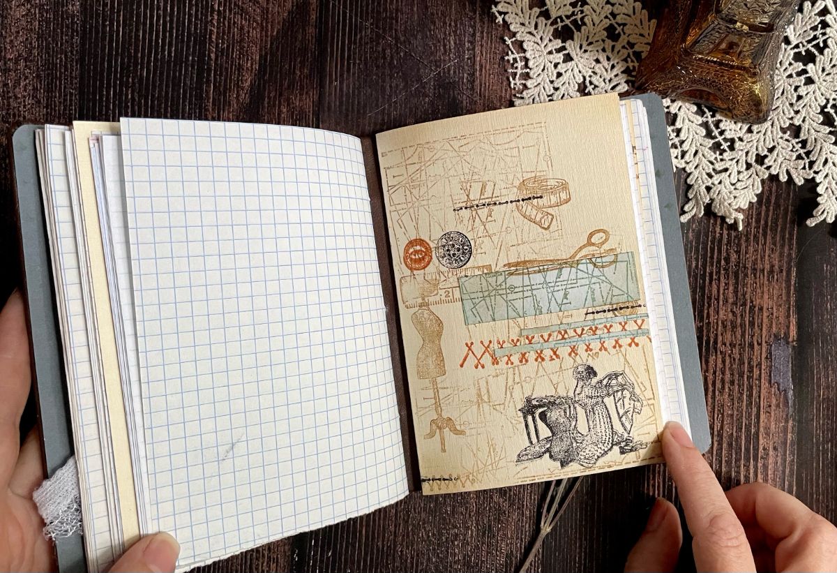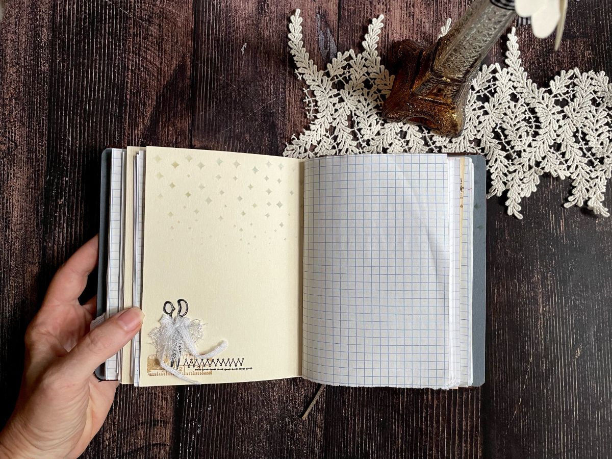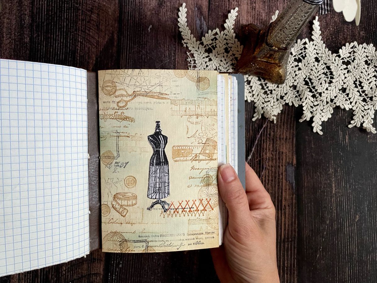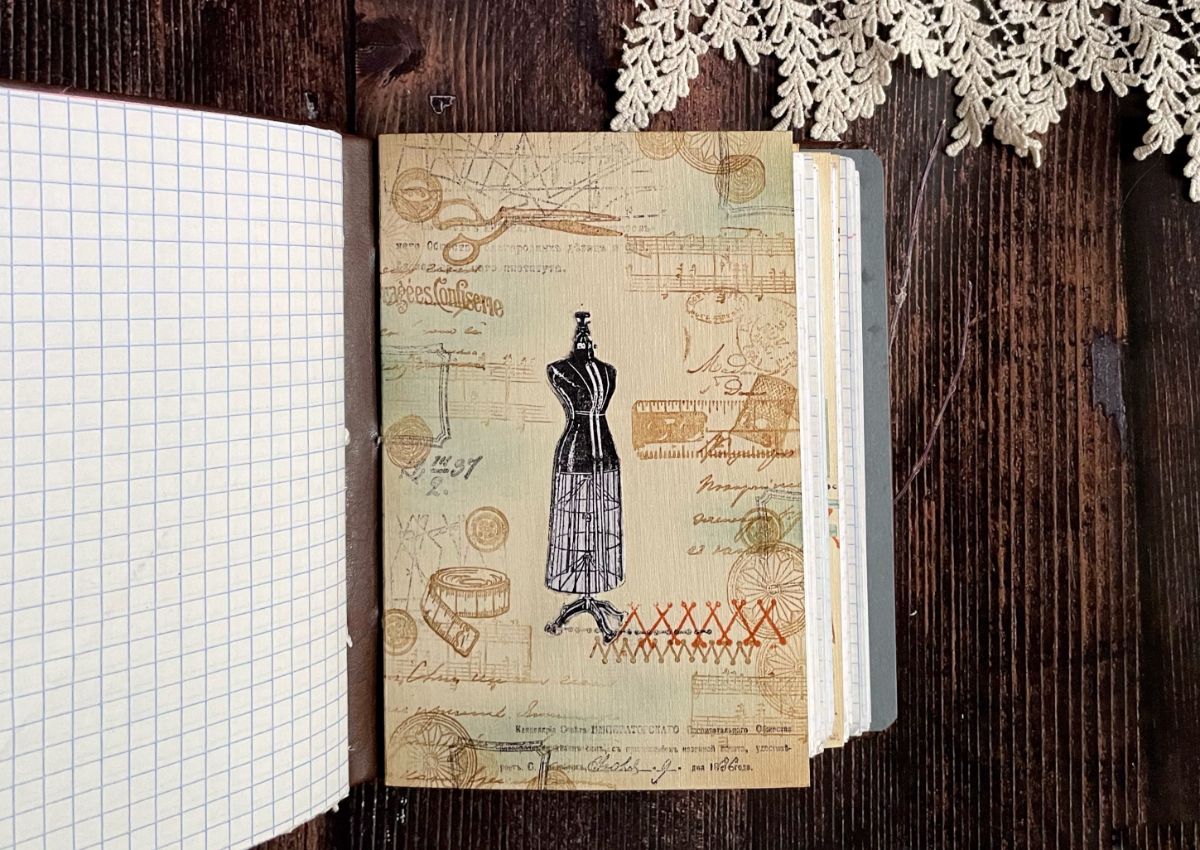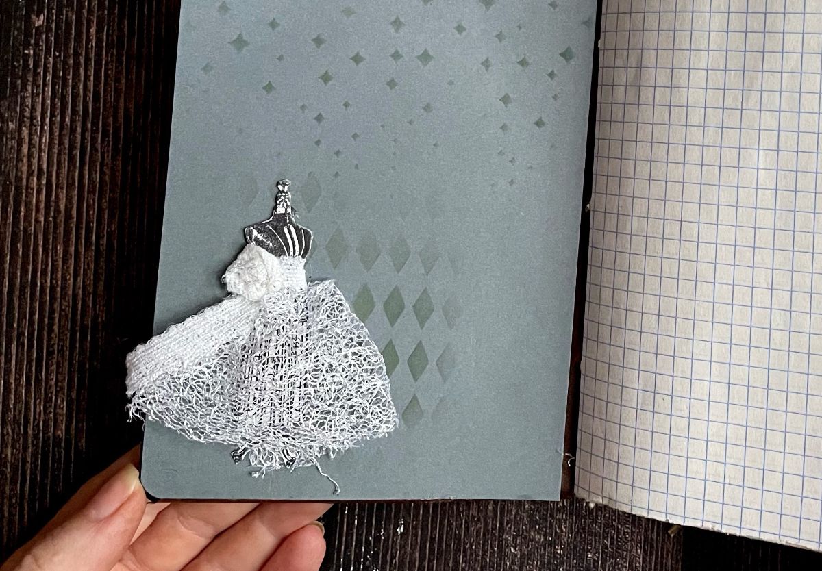 Внутри блокнота использовала листы в клетку и оформила разделители. На форзаце разместила каркасный манекен, одев его в пышную юбку из сетки.