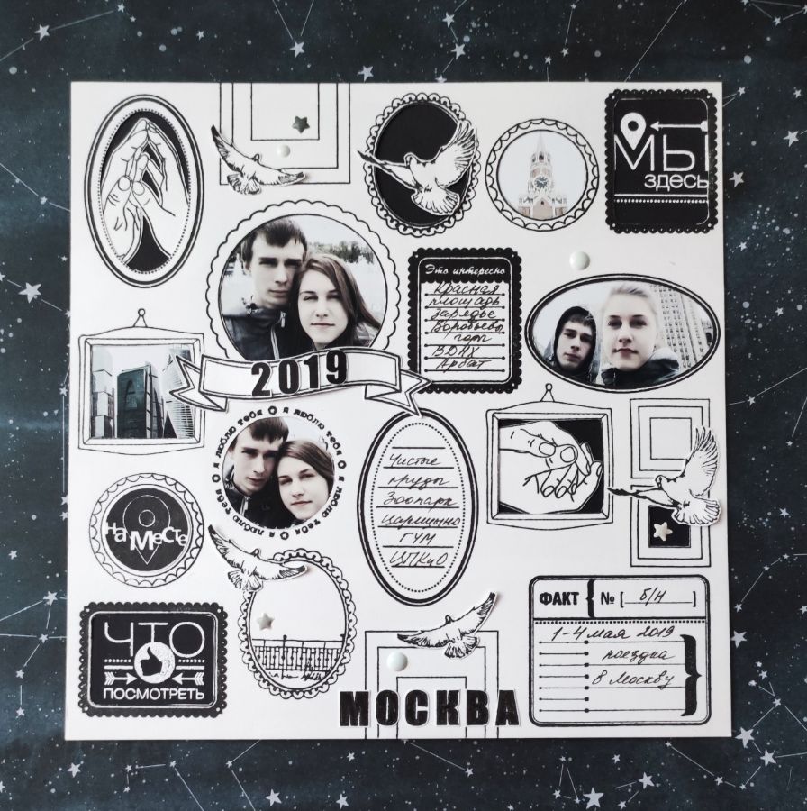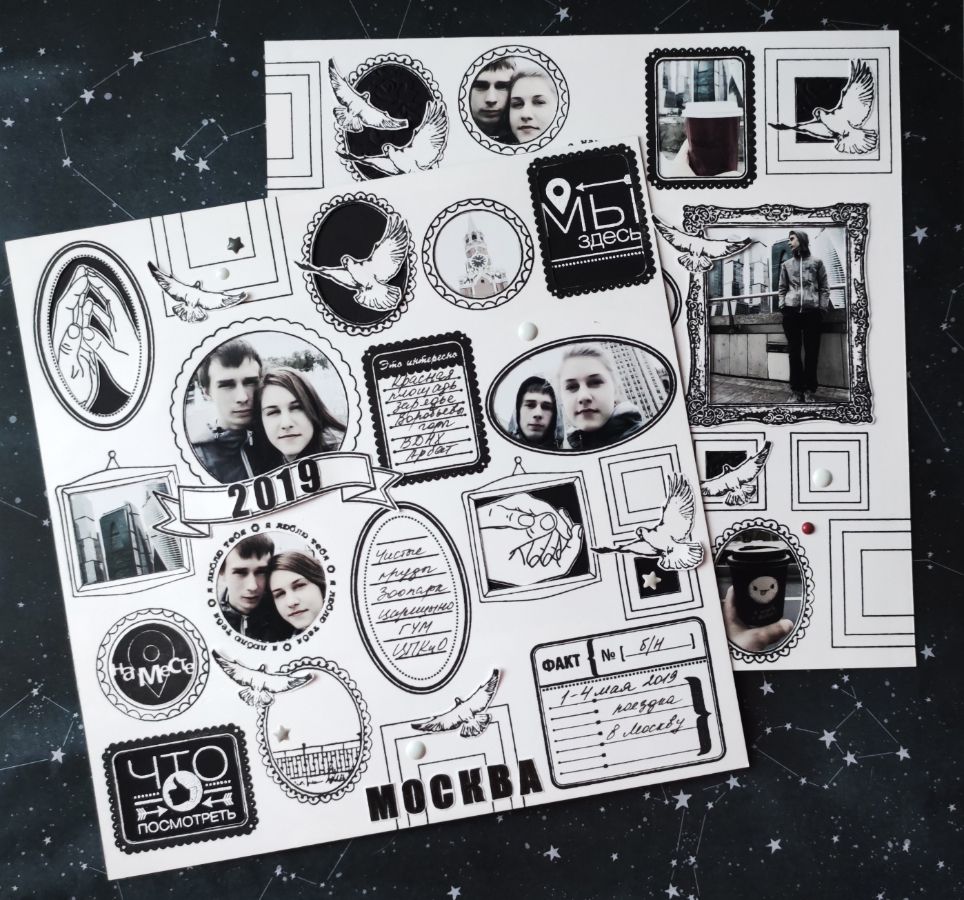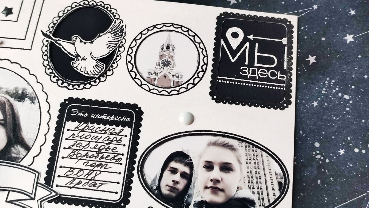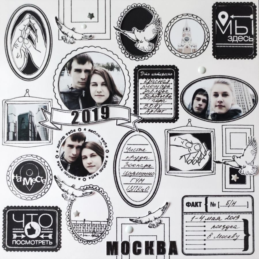 Фото из поездки детей в Москву оказались в основном «себяшками», и оформление их в рамки разных размеров, форм и стилей мне показалось весьма интересным. К тому же фотографии были обработаны в легком винтажном стиле, и я подумала, что к ним очень хорошо подойдет черно-белый монохром.
