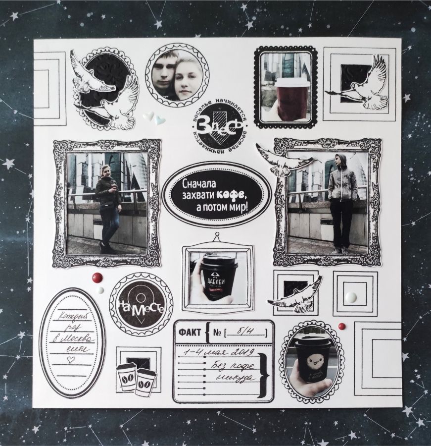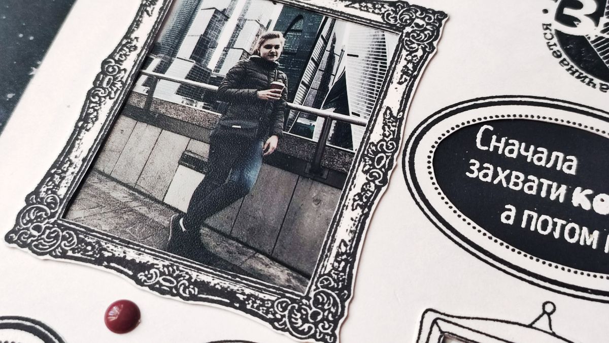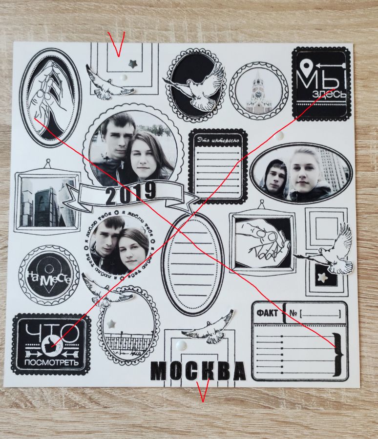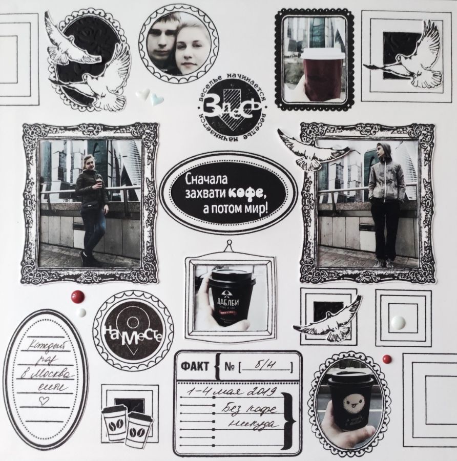 Фото из поездки детей в Москву оказались в основном «себяшками», и оформление их в рамки разных размеров, форм и стилей мне показалось весьма интересным. К тому же фотографии были обработаны в легком винтажном стиле, и я подумала, что к ним очень хорошо подойдет черно-белый монохром.
