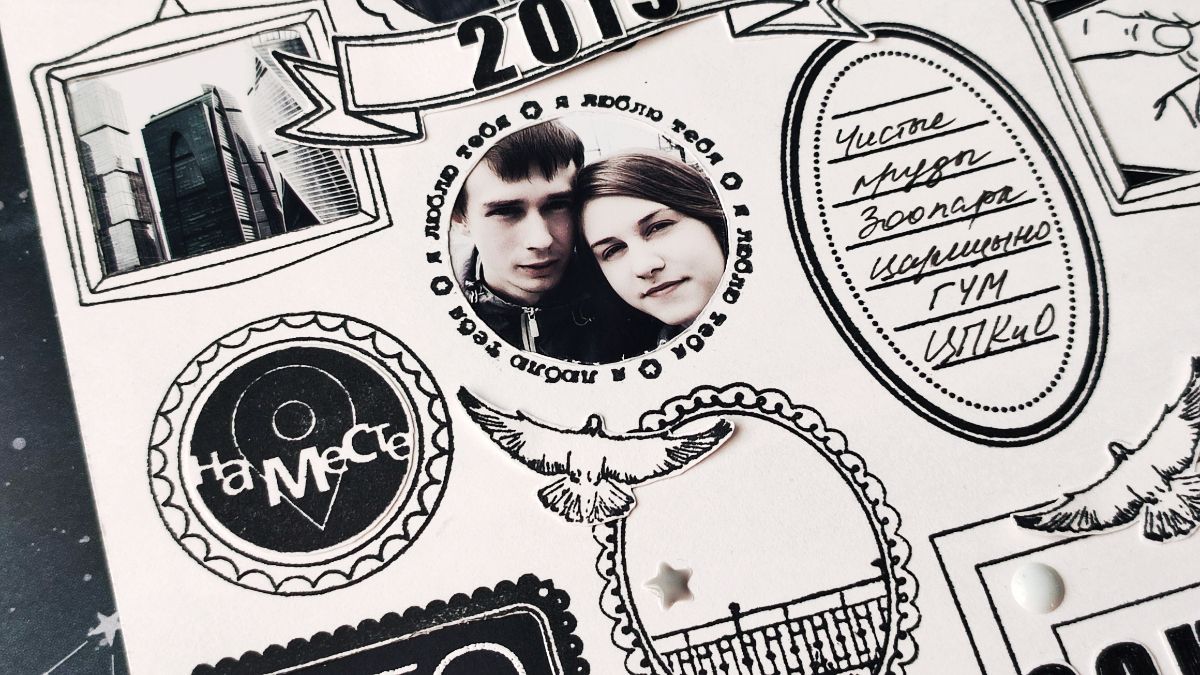 Первая страничка про прогулки по Москве, поэтому здесь я использовала немного штампов из раздела Проджект лайф – Мы здесь, Что посмотреть, и из раздела Путешествия – Дорожный набор. Надпись Москва и год набраны с помощью штампа Алфавит (пл). Поскольку на тот момент детки еще не были женаты, то страничка и про любовь тоже. Поэтому оказались в тему штампы: Рука об руку, Ладонь к ладони, ЕВ. Голуби в полете и рамочка Я люблю тебя (круг).