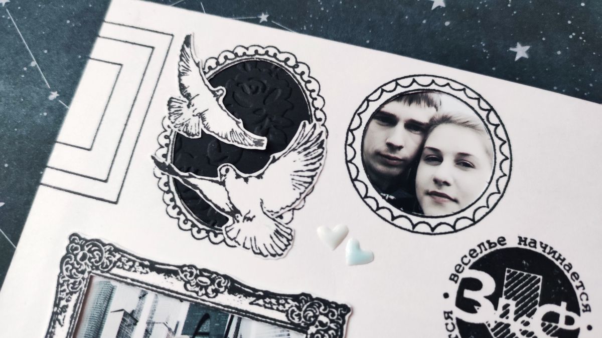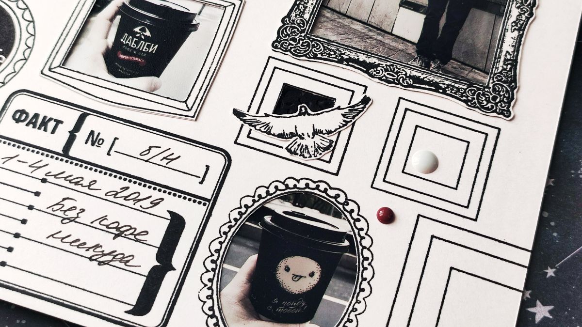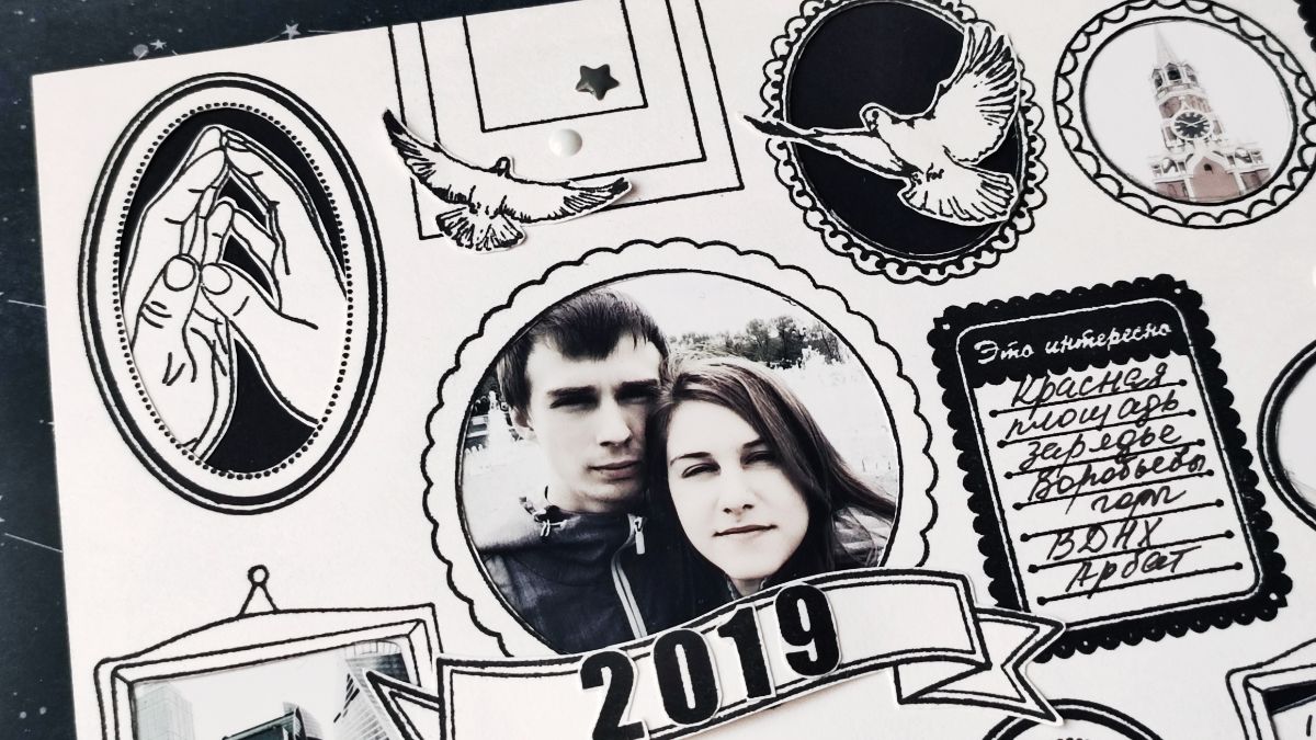 У части рамок я вырезала внутреннюю часть и подложила снизу черный картон. Часть рамок использовала под фотографии, а часть под текст. В некоторых рамках сделала надписи с помощью эмбоссинга белой пудрой, а в других добавила вырезанный декор. Чтобы создать такую страничку потребовалось вырезать много черновиков рамок и сначала их примерить на офисном листе. Эта страничка получилась более хаотичной, чем вторая.