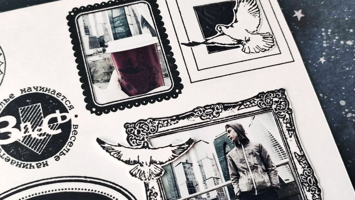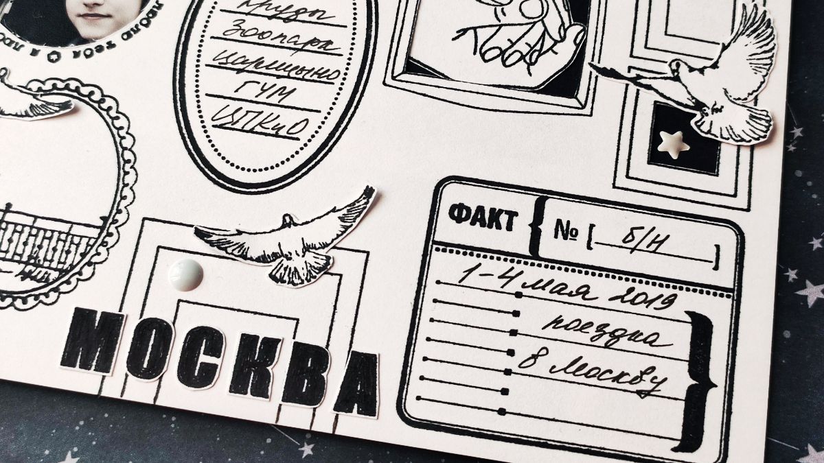 Есть много способов заскрапить фото из поездки или путешествия на страничку. Я решила снова попробовать принцип mood board (доска настроения). А помогли мне в этом естественно штампы ПСК.