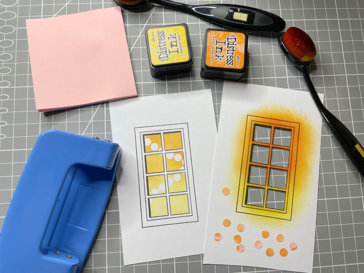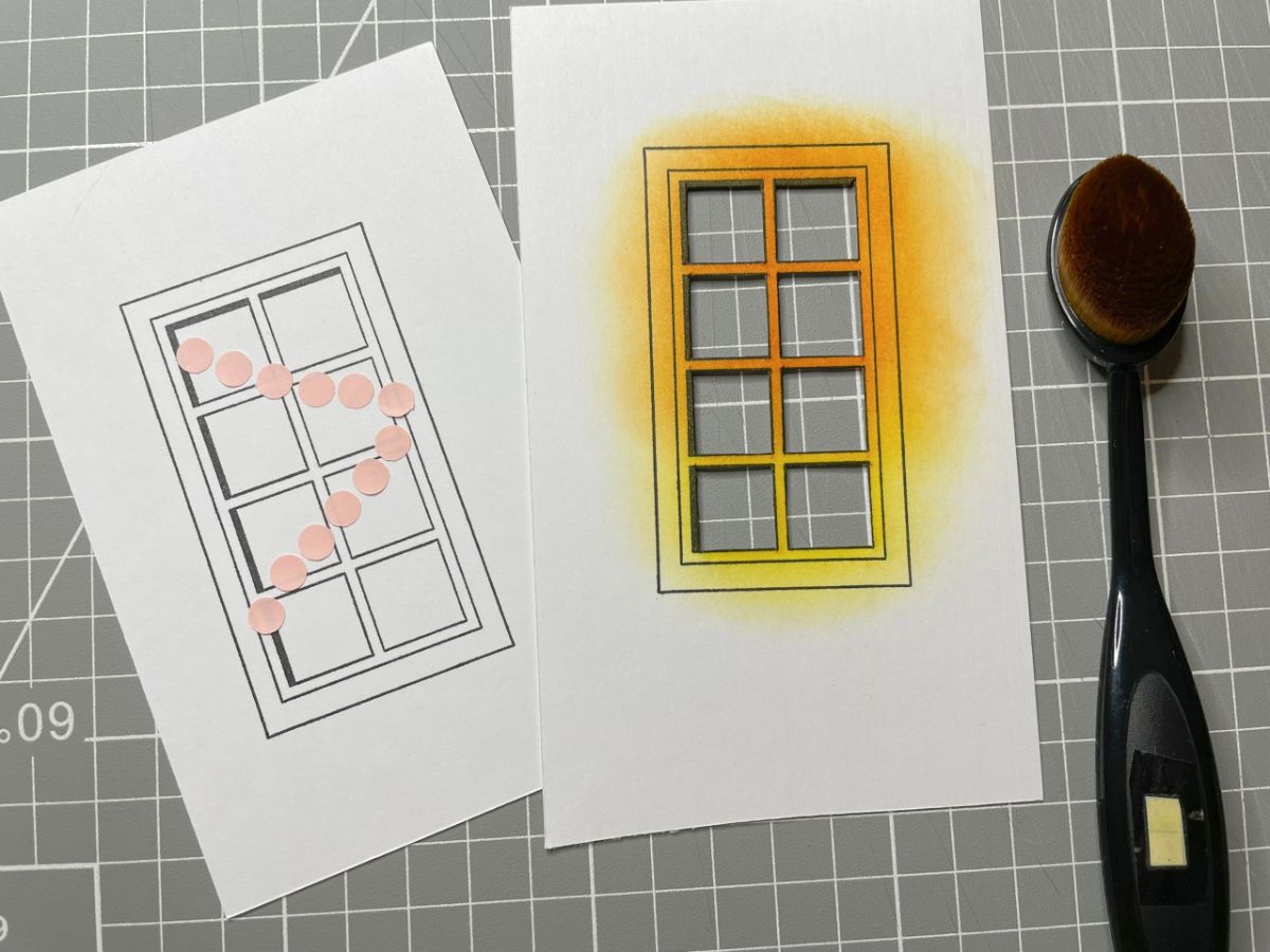Третья открытка напоминает мне фильм "Карнавальная ночь" - за этими окнами, похоже, шумный праздник. Я сделала гирлянды на окнах, используя как маски дырокольные кружочки из клейкой части стикера.