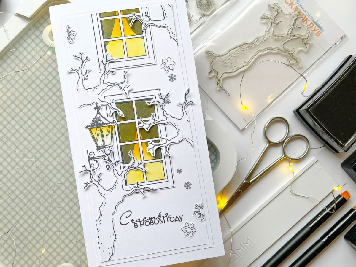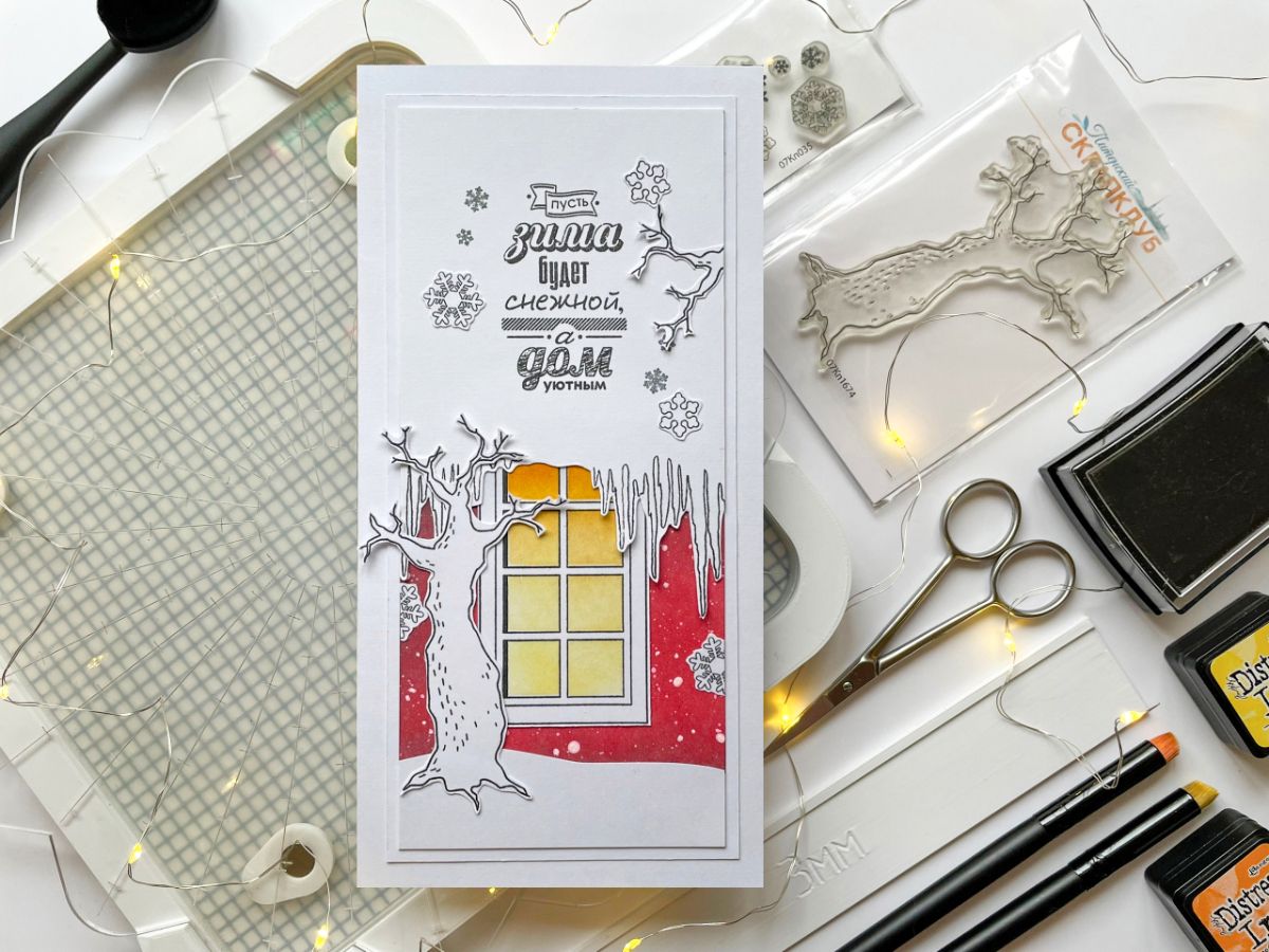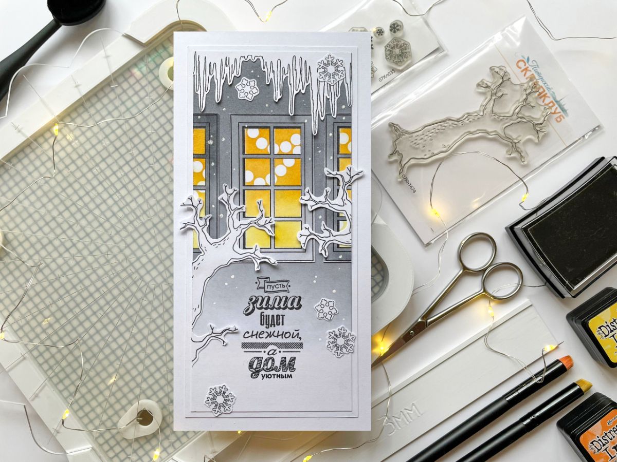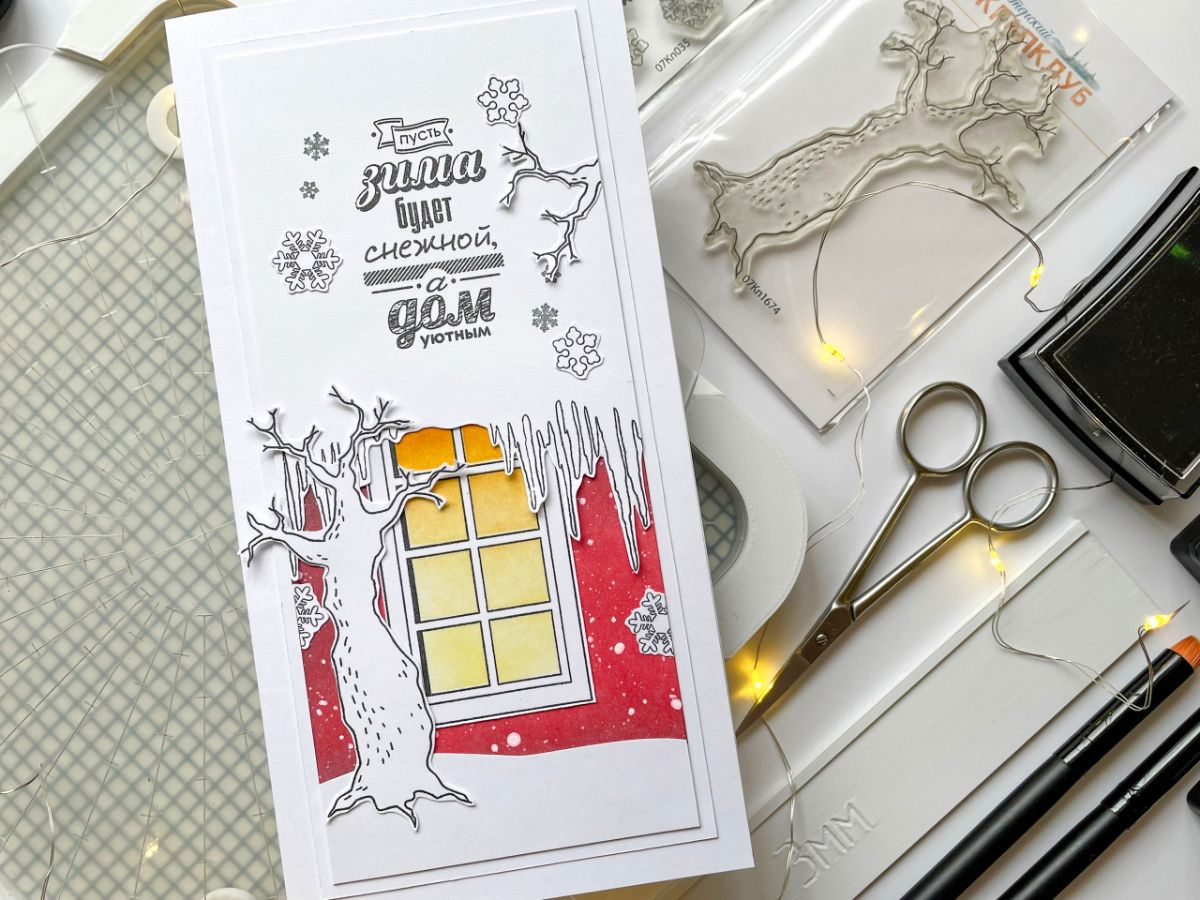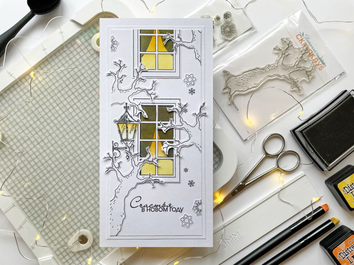 В работе штампы: Окно в зале, Сухое дерево, ЕВ. Сосульки большие, Снежинки набор, Пусть дом будет уютным, ЕВ. Настенный фонарь 2, Счастья в НГ 2.