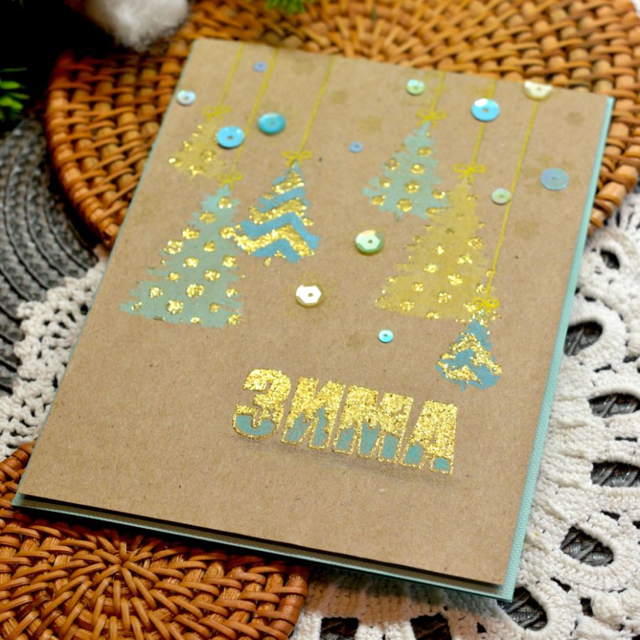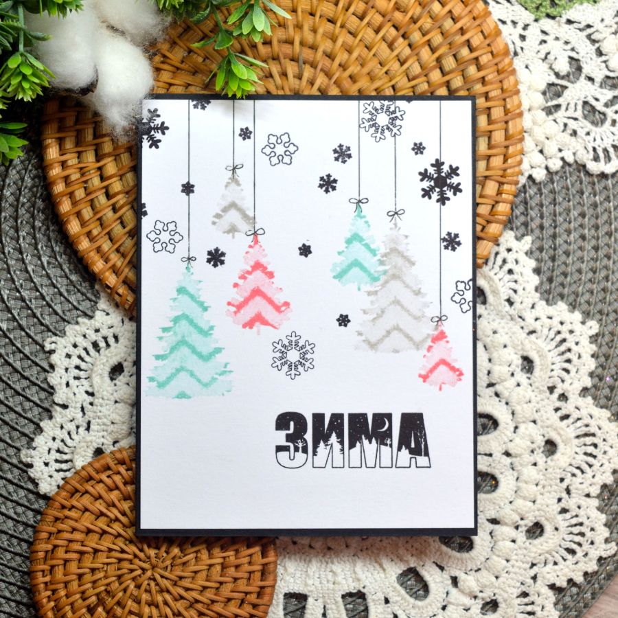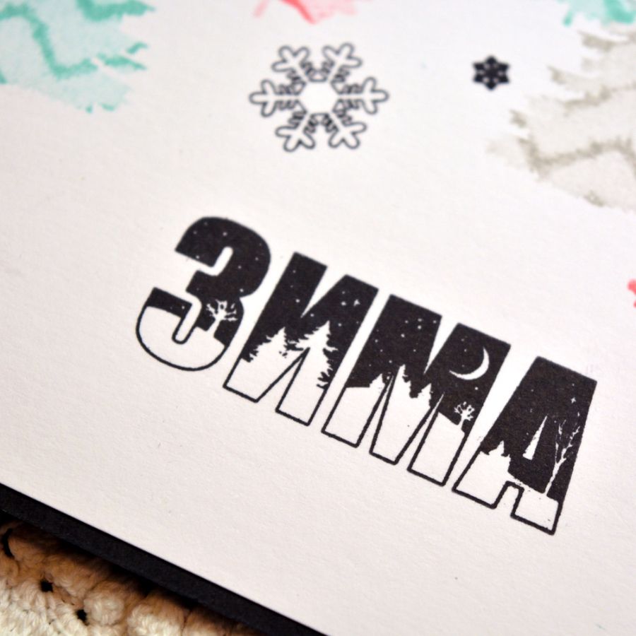 Нетрадиционный цвет снежинок выбран, чтоб темные оттенки служили фоном и выделяли бледные цвета елей. Завершает композицию слово зима. Открытка получилась легкой и воздушной, в стиле КАС.