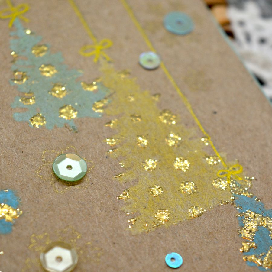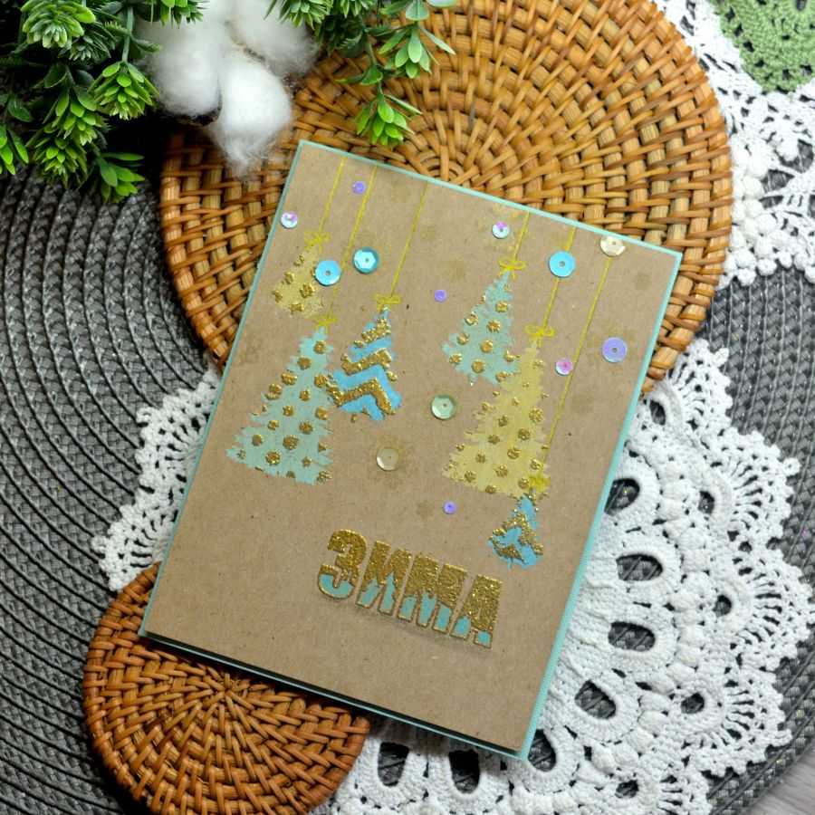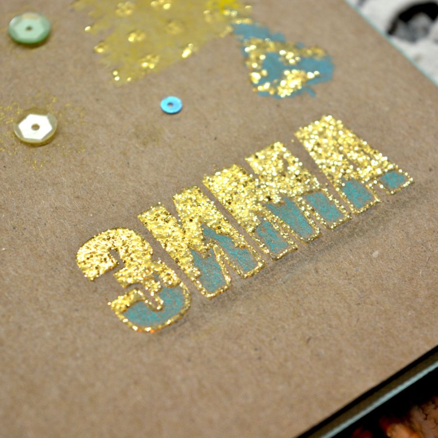 В последнем примере я взяла крафт и использовала гибридные Distress Oxide ink - Broken China, Cracked pistachio, Squeezed lemonade и золотую пудру с глиттером. Открытка получилась уютной и легкой.