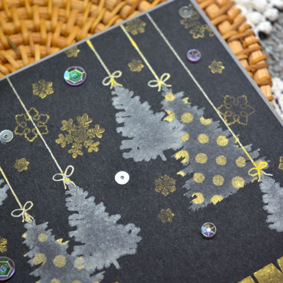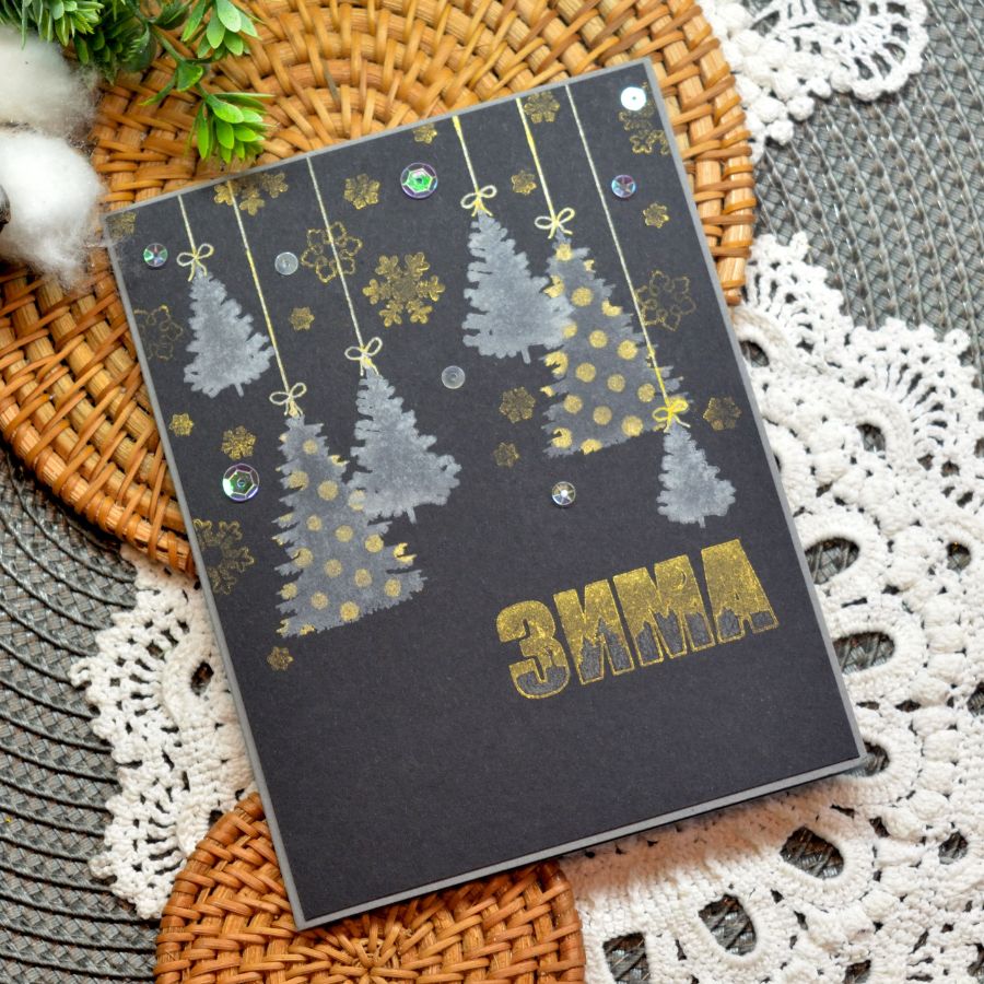 Для черного кардстока я использовала меловую штемпельную подушечку от Versa Magic и металлизированную от Mr.Painter. Если в первом варианте я пользовалась методом второго оттиска, то тут штамповала дважды меловыми чернилами для большей насыщенности белого цвета. Открытка похожа на зимнюю ночь на кануне Нового года в золотом блеске снега.