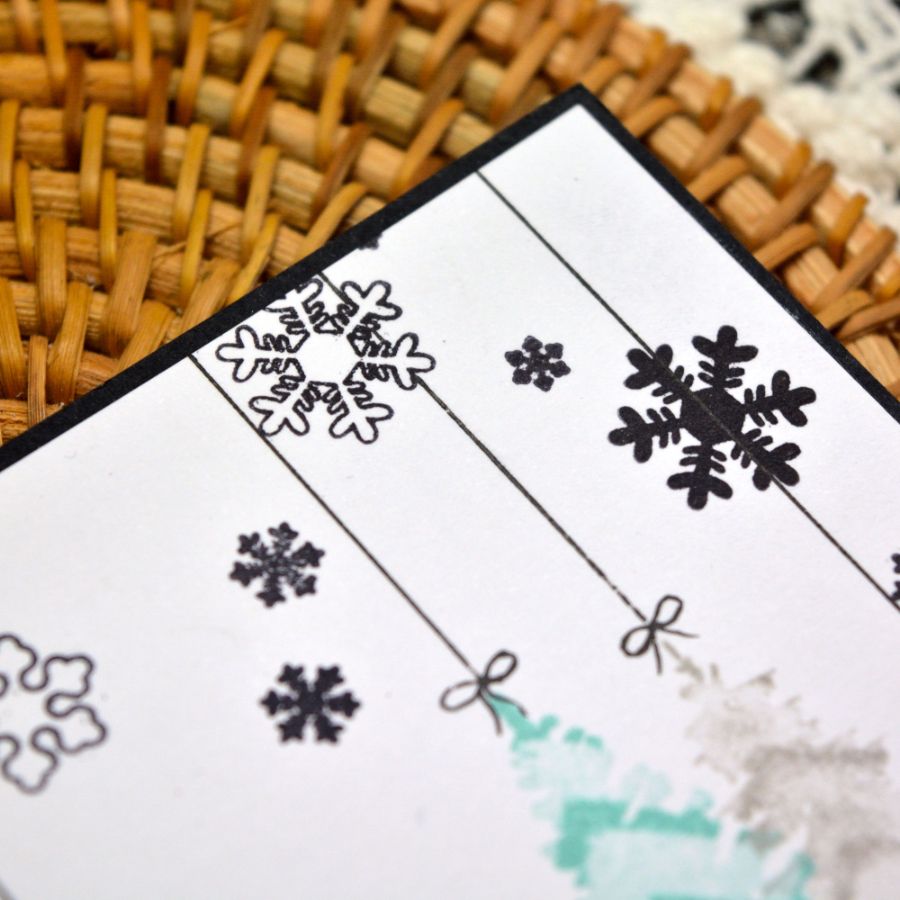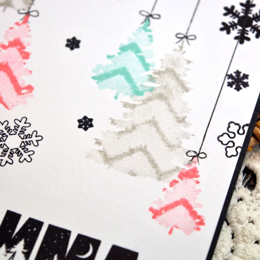 В первой открытке, я использовала белый кардсток; для елей - штемпельные подушечки от Lawn Fawn (Wild rose, Mermaid, Manatee); снежинки и надпись - Archival ink от Ranger.