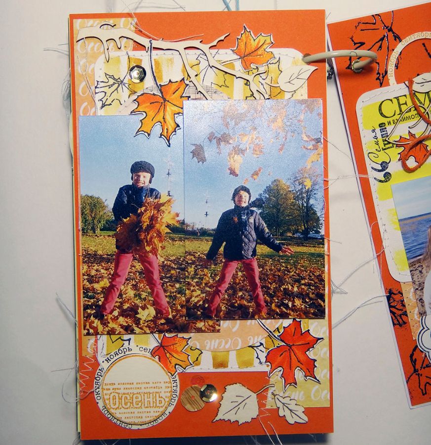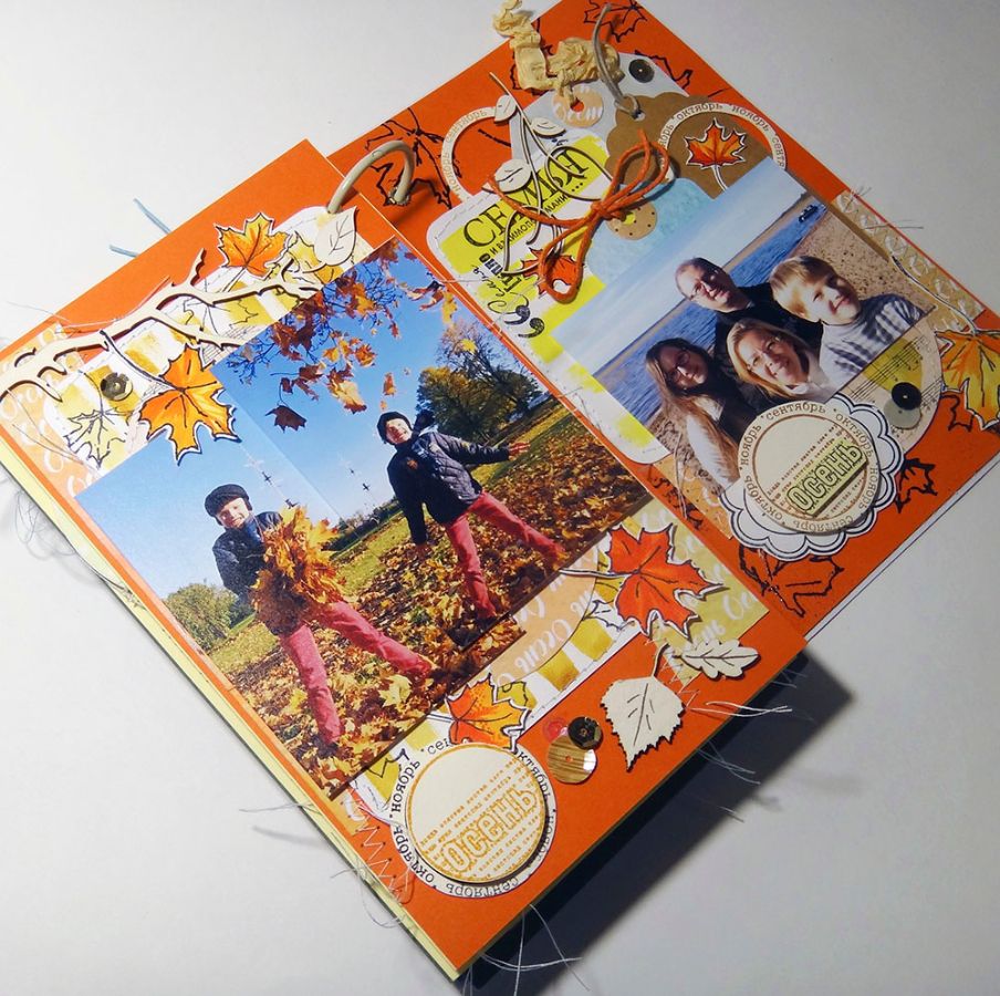 На этом развороте активно использовались листья из набора «Осенние листья». Они и на фоне, ими выполнен эмбоссинг черной пудрой, они же раскрашены маркерами, вырезаны и приклеены на объемный скотч.