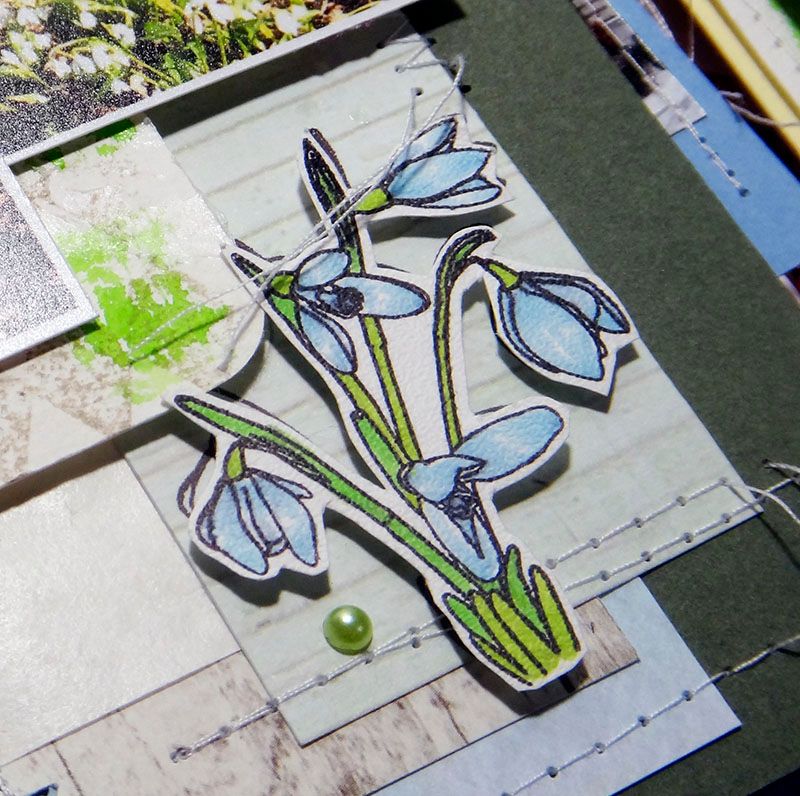 Подснежники с фотографии повторяет штамп «Первые подснежники», раскрашенный маркерами – главный герой нашей сказки. Эти же чудесные подснежники можно встретить и на обложке, и в шейкере.