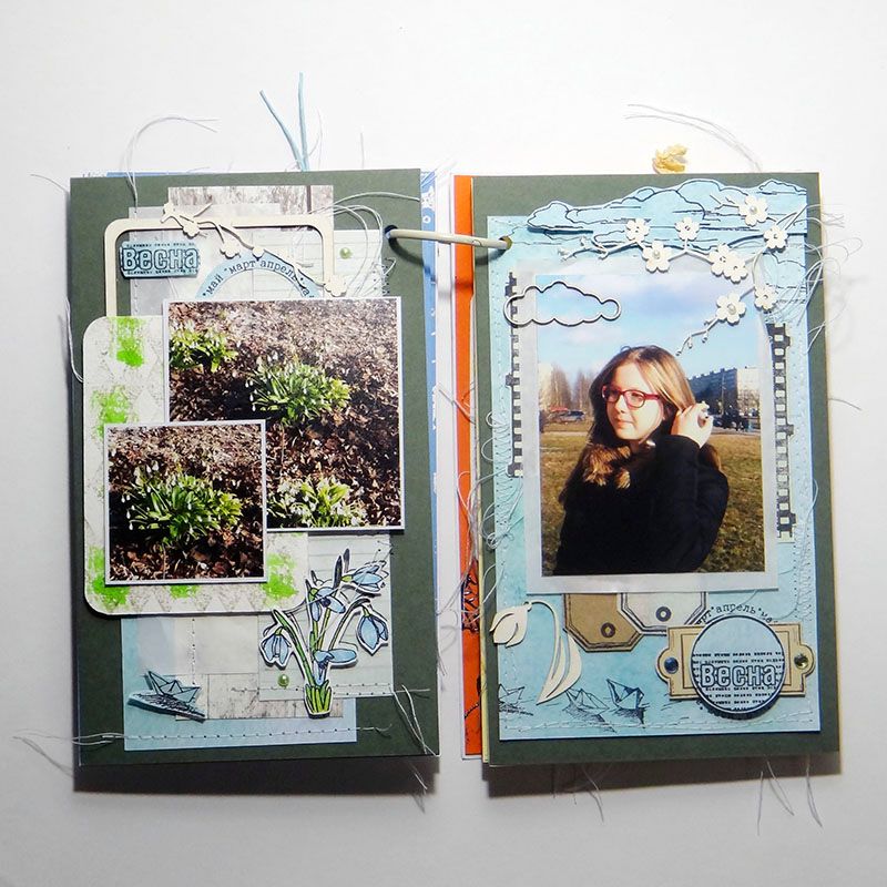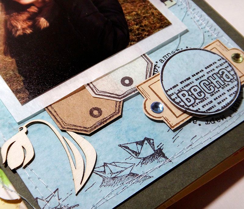 На весенней страничке очень много штампов: «Весна», тег «Наша семья», «Бумажные кораблики», «Облака», «Фотоплёнка»