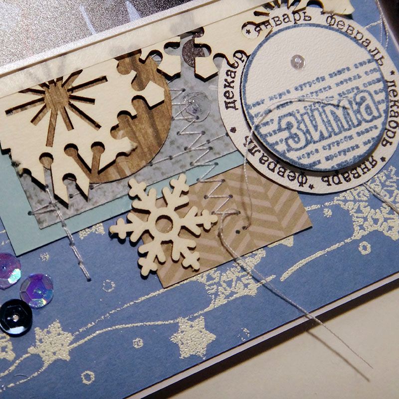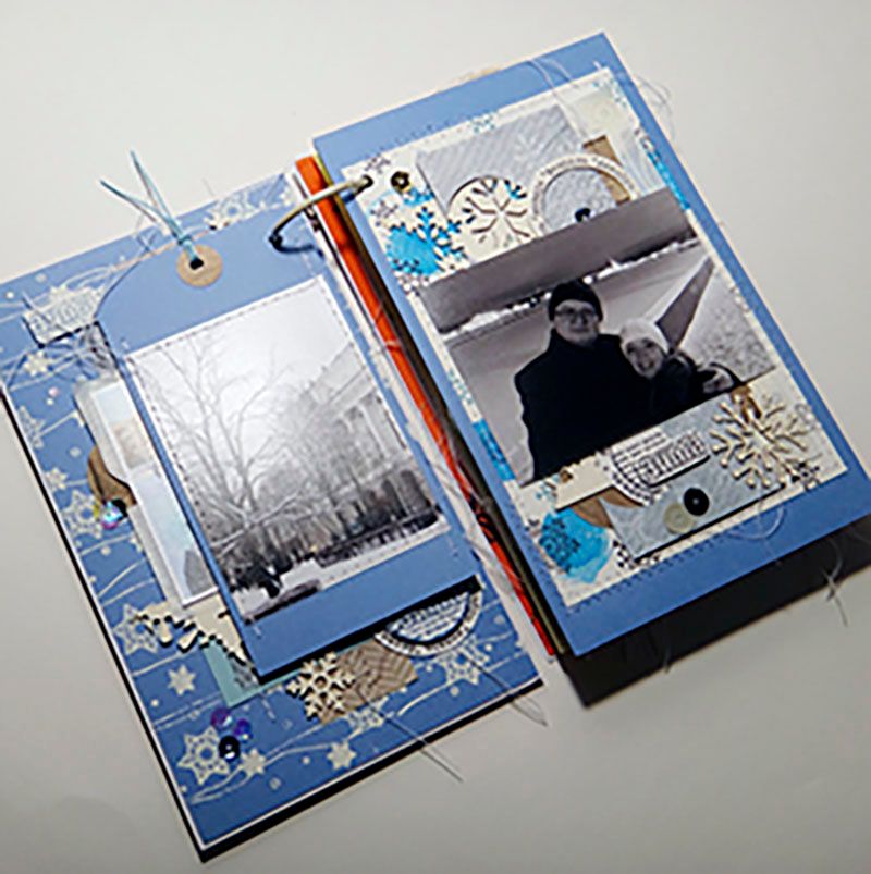 На этом развороте мои любимые зимние фотографии с катка, из политехнического парка и прогулки по зимнему городу. На левой страничке в качестве фона на голубом картоне сделан эмбоссинг белой пудрой с помощью фонового штампа «Метель».