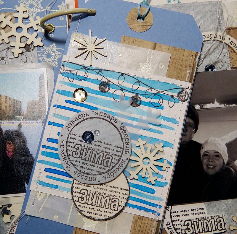 Один из главных героев – штамп «Зима» из категории Времена года, календарь. Очень мне нравится эффект от сочетания акварели и штампов. В этом альбоме в фонах несколько раз встречается этот приём. Например, этот тэг украшен фоном с нарисованными полосками и штампом «Гирлянда».