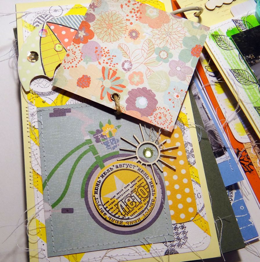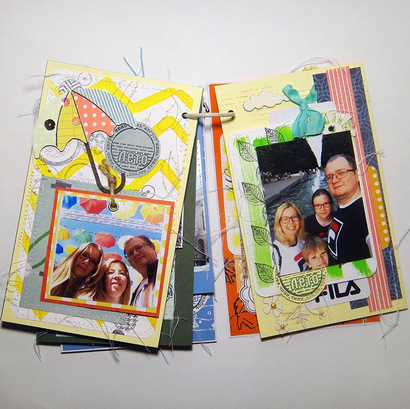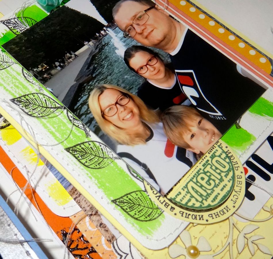 «Ах, лето жаркое, любил бы я тебя...», когда бы не такое огромное количество летних фотографий, из которых нужно выбрать две! В результате мучительного выбора, были выбраны фотография с городской прогулки по аллее парящих зонтиков и вторая из поездки, на которой у нас как бы family look, ну то есть мы все в одинаковых футболках. И здесь один из главных штампов – штамп из категории Времена года, календарь – «Лето».